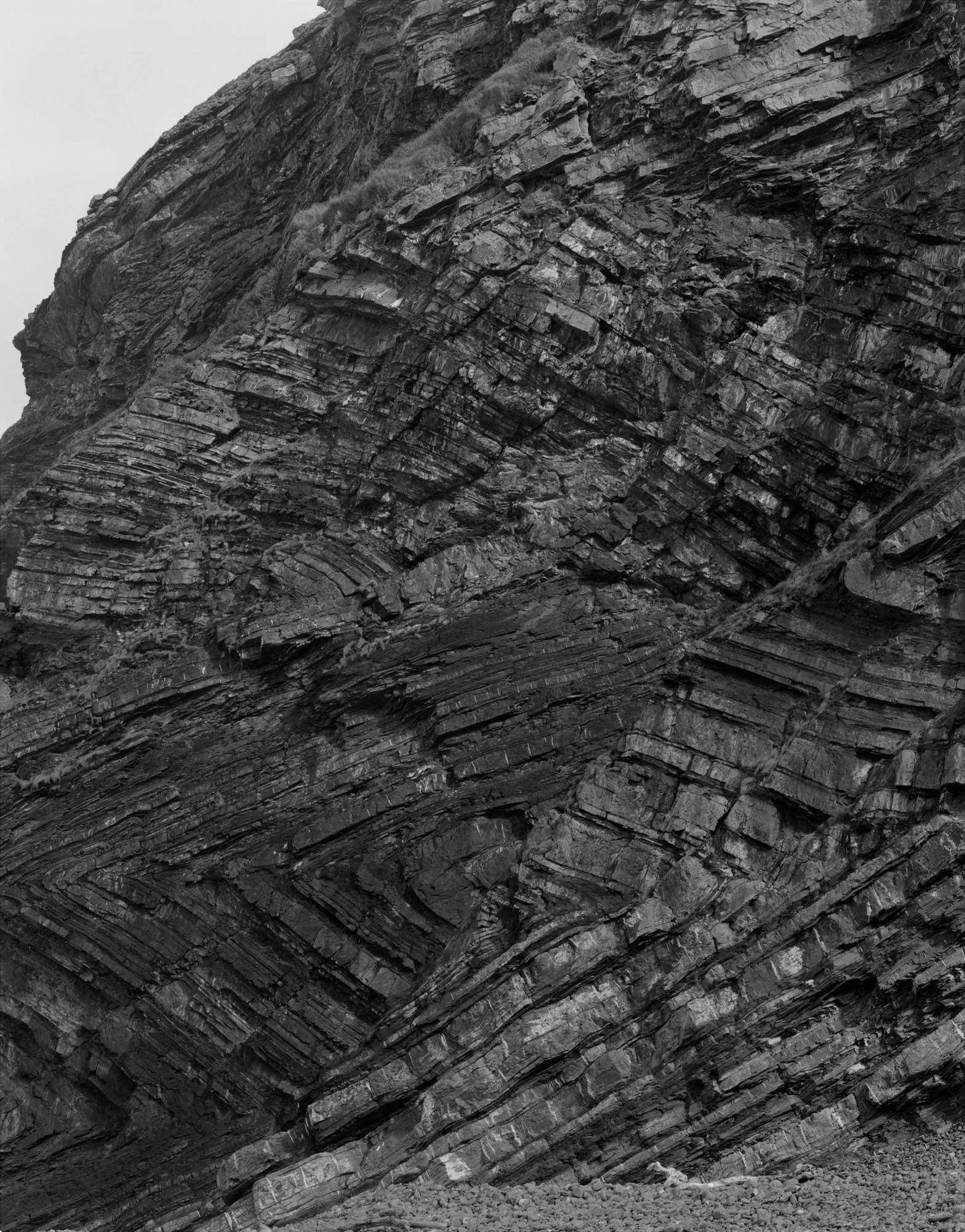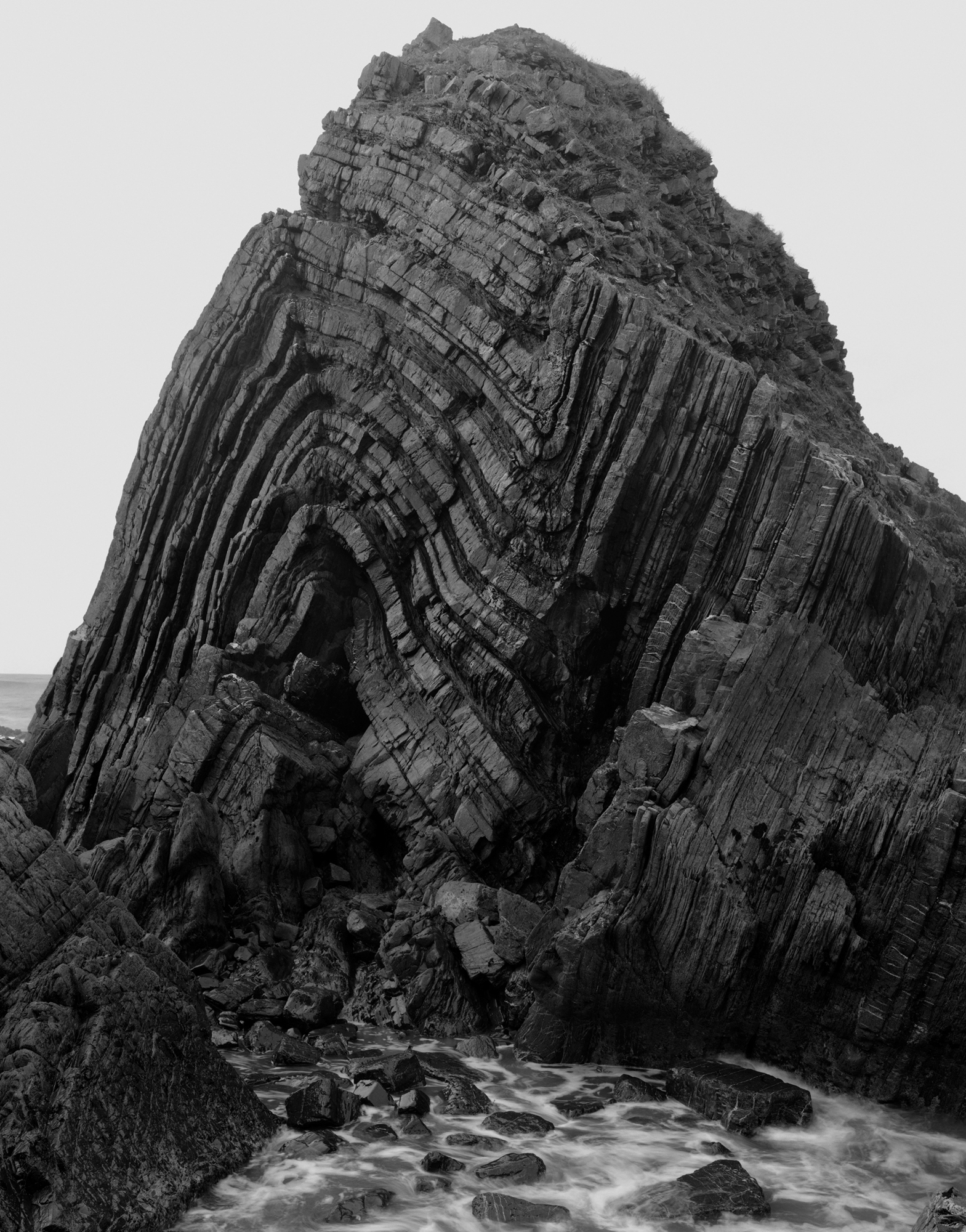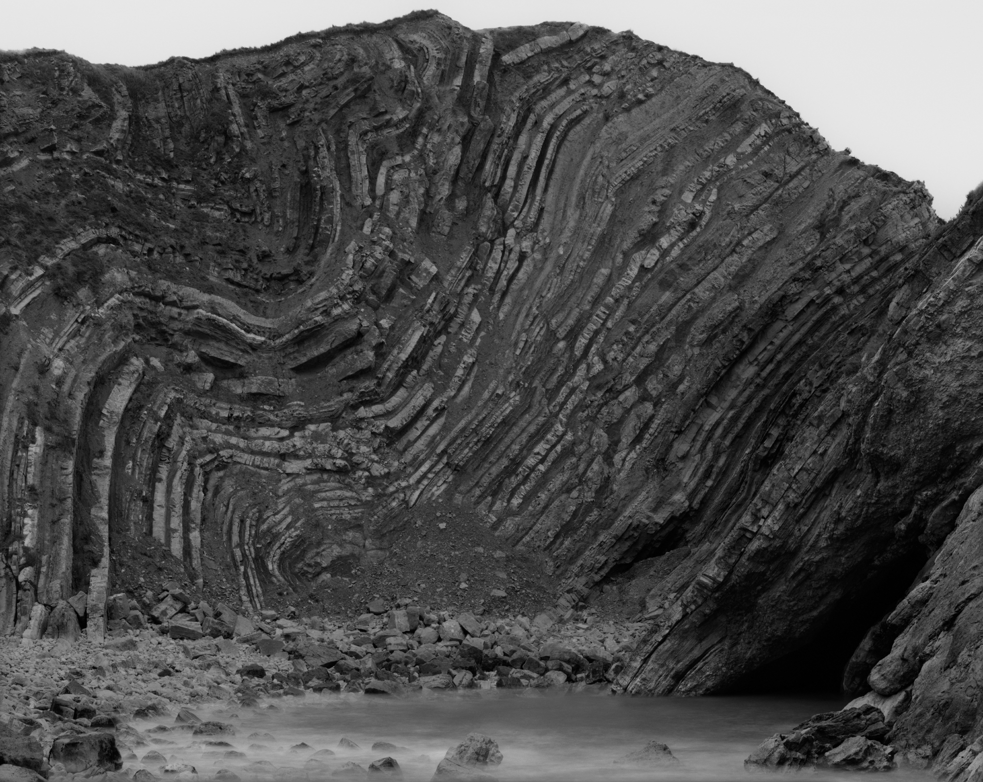 Anticline reflects upon the imperceptible processes of change that shape the landscape in deep time. The series weaves a dialogue between images of various phenomena; folded sedimentary rock, a submerged Bronze Age forest, fossilised Jurassic trees, sea-eroded natural arches, and extant temperate rainforest. Relics of ecosystems originating in the remote past persisting in the landscape, petrified at different stages of disappearance. My intention is to consider the landscape as an evolving archive- an entity in a state of continuous flux and metamorphosis, recording successive iterations of itself over time in its own fabric.