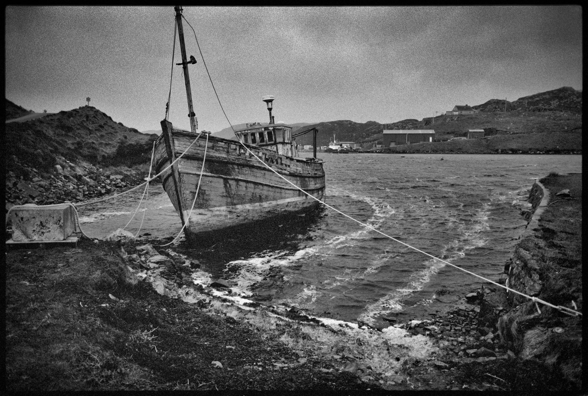 Abandoned white fish trawler. After World War I, the fishing industry of the Isle of Lewis broke down. There were not sufficient young man any more, after more than 1.000 of them had been killed in the war. Also, the transport of fish from Lewis to the mainland ports became too expensive.