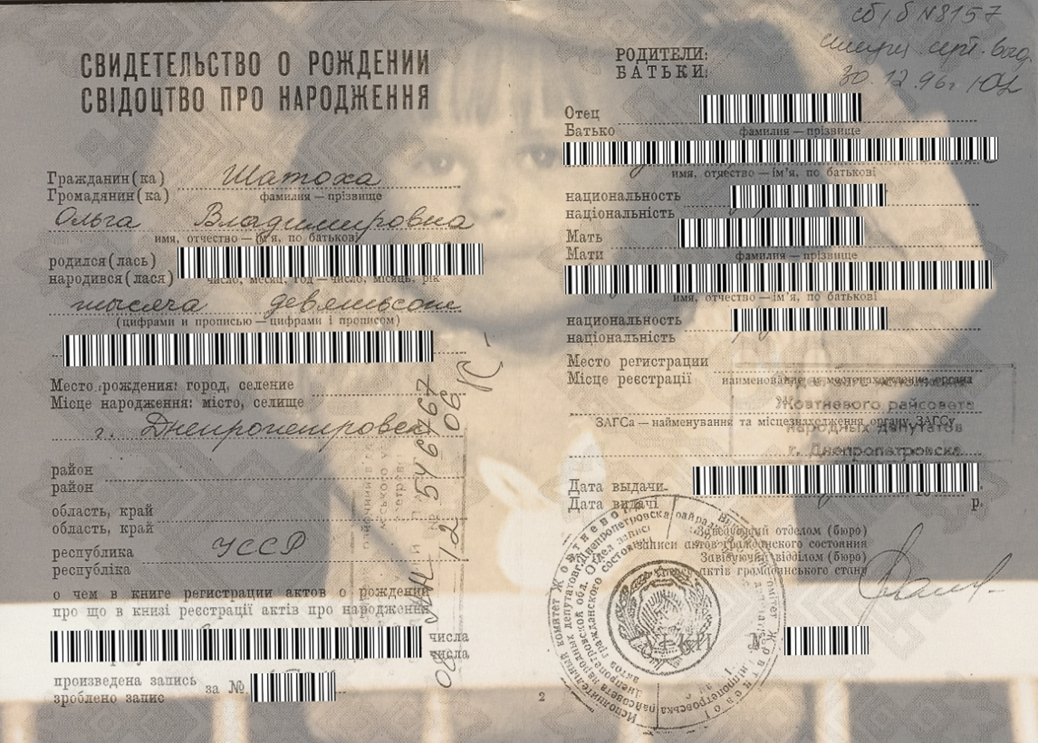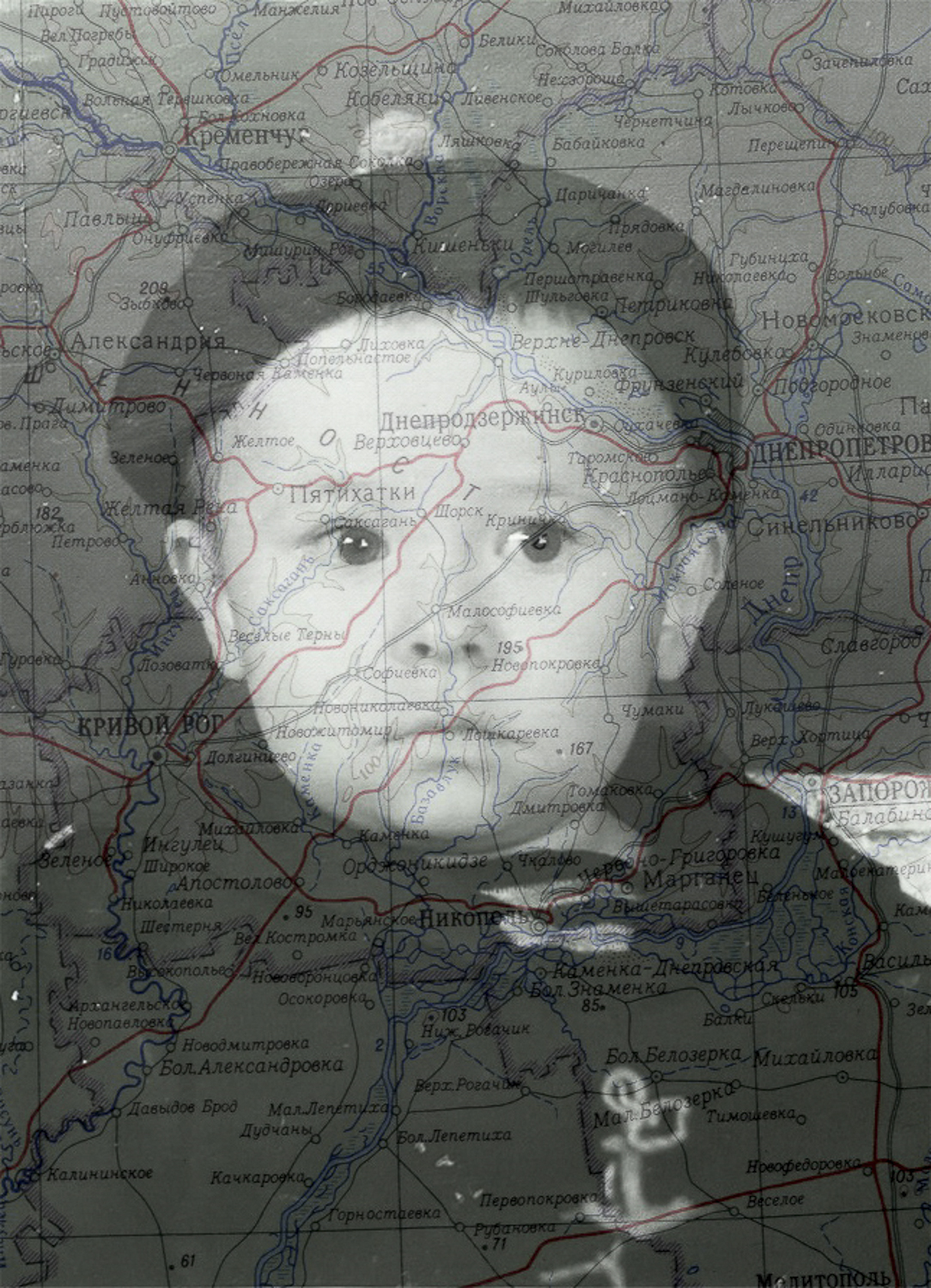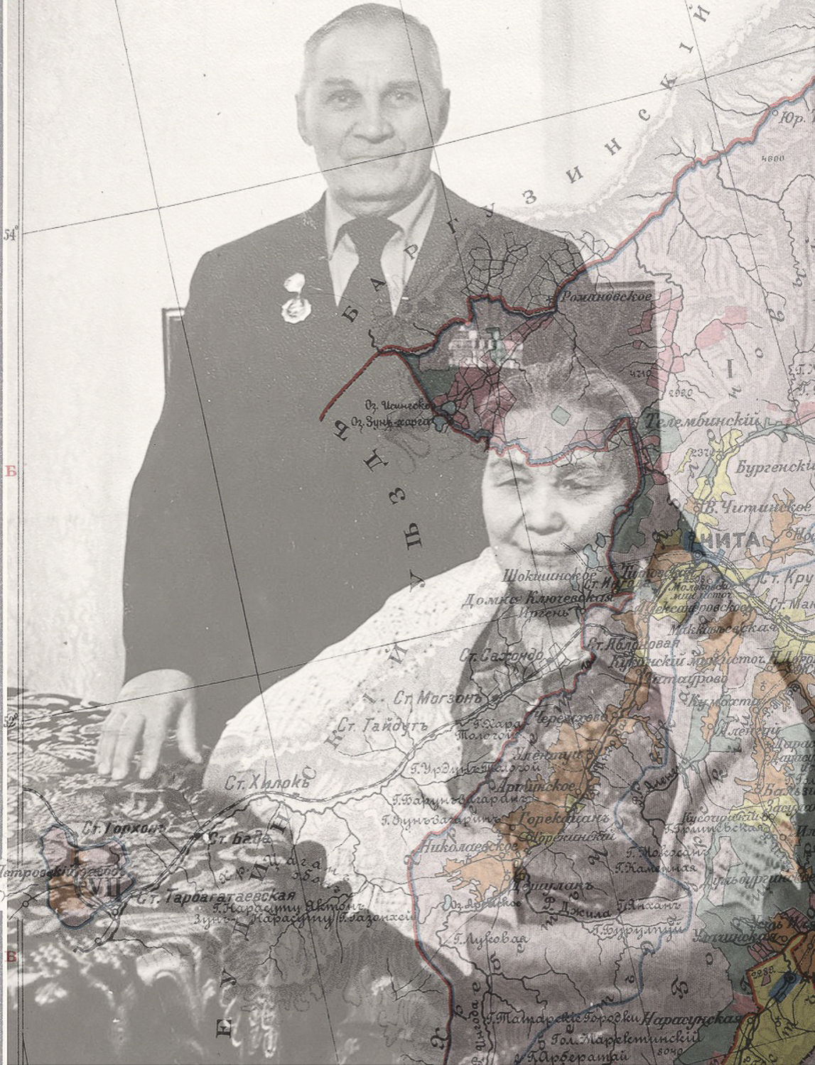Visually, the work unfolds through double exposures. The first set shows photographs of my ancestors overlapped with maps of the locations where they were born, published around their birth year. Another set shows my IDs – passports, residence permits, and even a USSR-issued (and thus obsolete) birth certificate – overlapped with photos of me taken around the time each document was issued. These double exposures reveal the ambiguity of documents and maps: behind stamps and lines, there are real people’s stories.