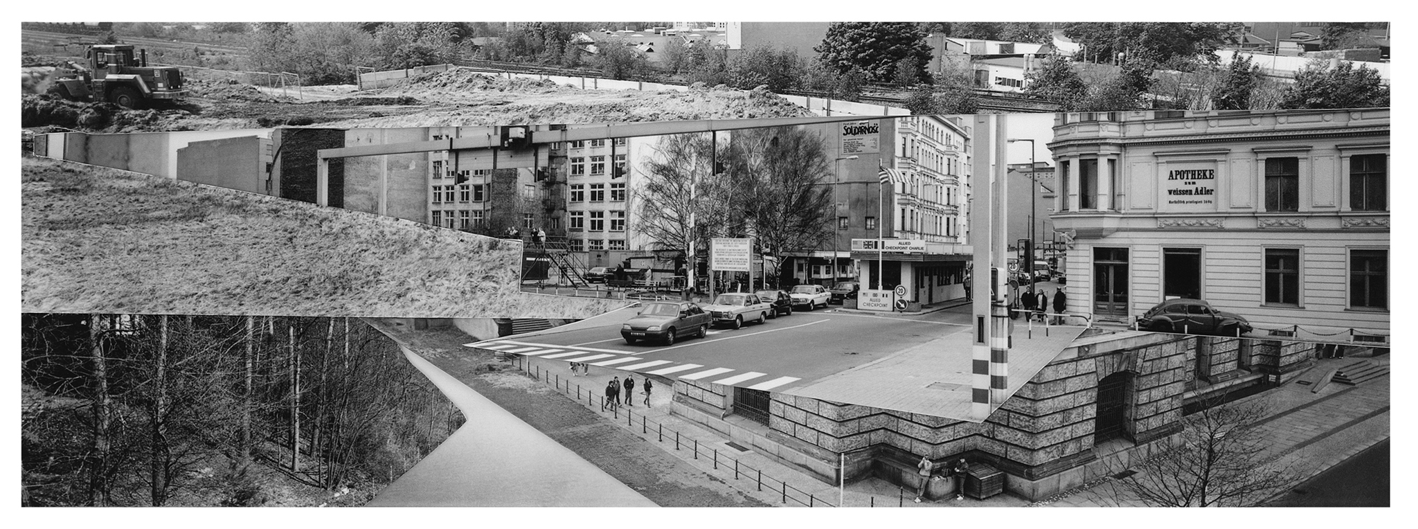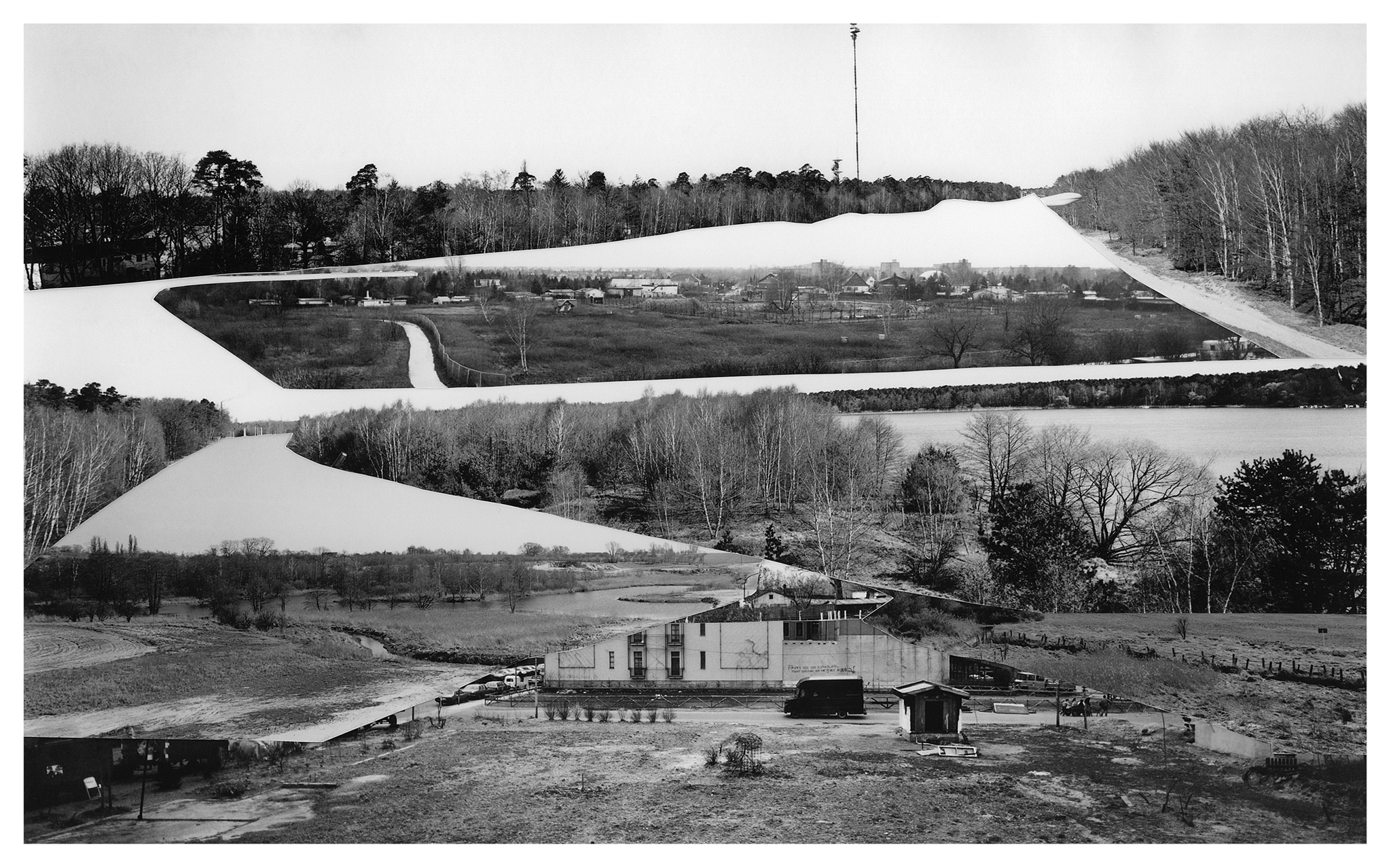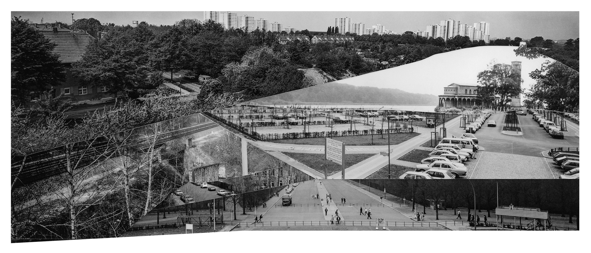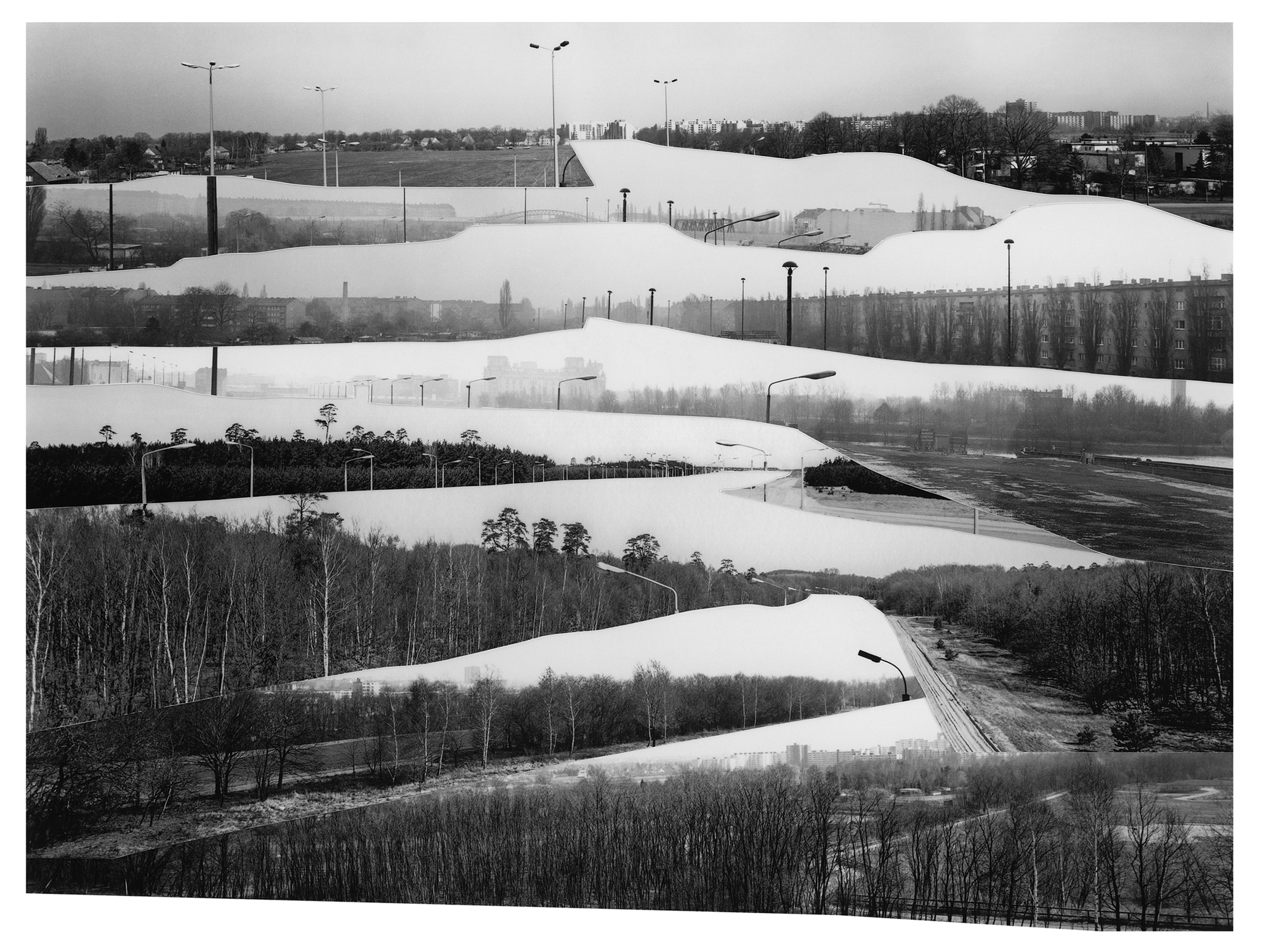 In 2022, I conducted in-depth research at the Stasi Records Archive during my artist residency at Künstlerhaus Bethanien in Berlin. Since East German citizens were not permitted to photograph the Berlin Wall, the only images from the East German side were those taken by the Stasi, short for The Ministry for State Security - the intelligence service and secret police. Among thousands of Stasi images, I discovered 134 panoramic photos of the Berlin Wall that an archivist scanned for me. After printing, I cut out the Berlin Wall and the Death Strip and assembled the pieces to create new, utopian landscapes of Berlin without the Berlin Wall. I set up the rule that I had to use each of the 134 cut-out pieces in one of the 23 collages. The collages are included in my recent monograph, The Absence and Presence of the Berlin Wall / Die Ab- und Anwesenheit der Berliner Mauer, which was published by DISTANZ in English and German editions in August 2025. The book spans 350 pages, includes 209 images, and engages with questions of national identity and borders, exploring the current state of German reunification.
