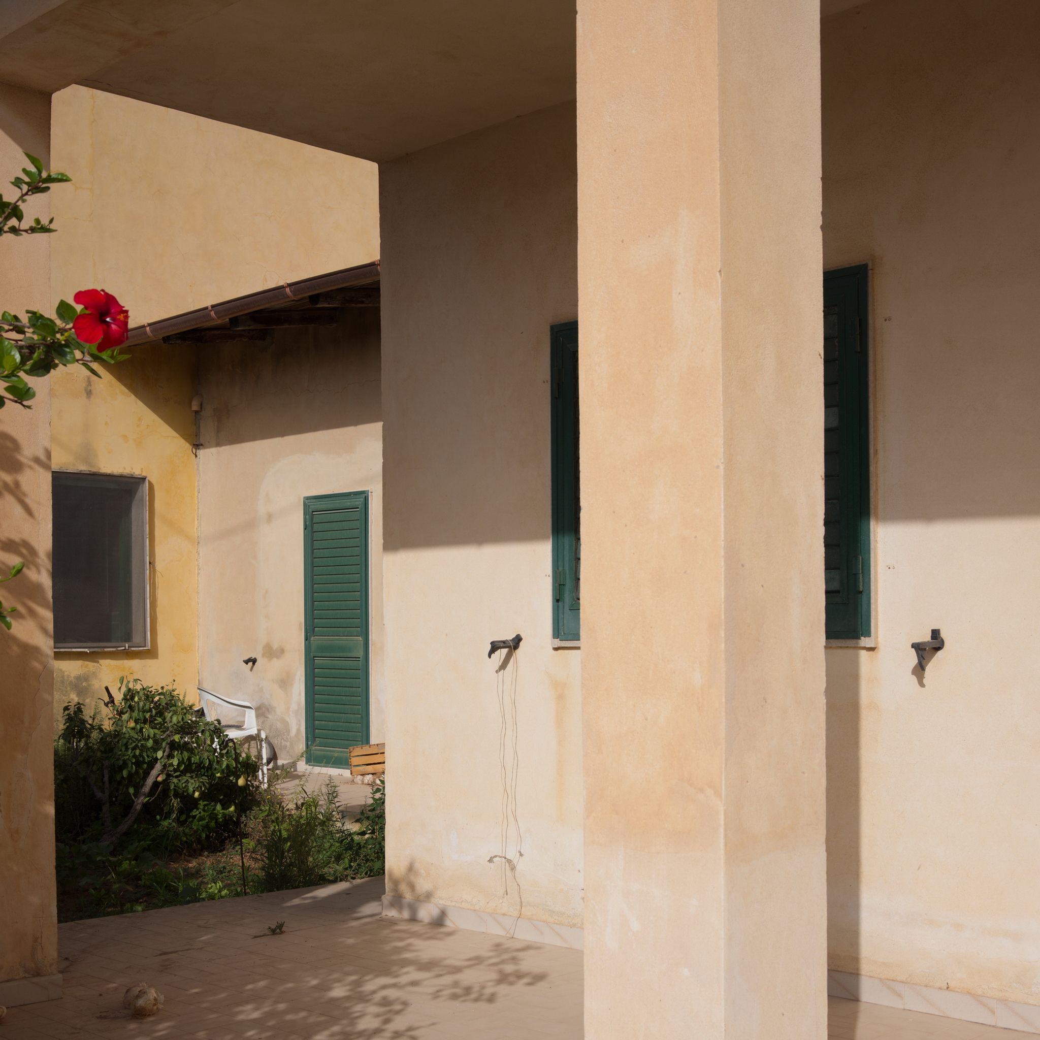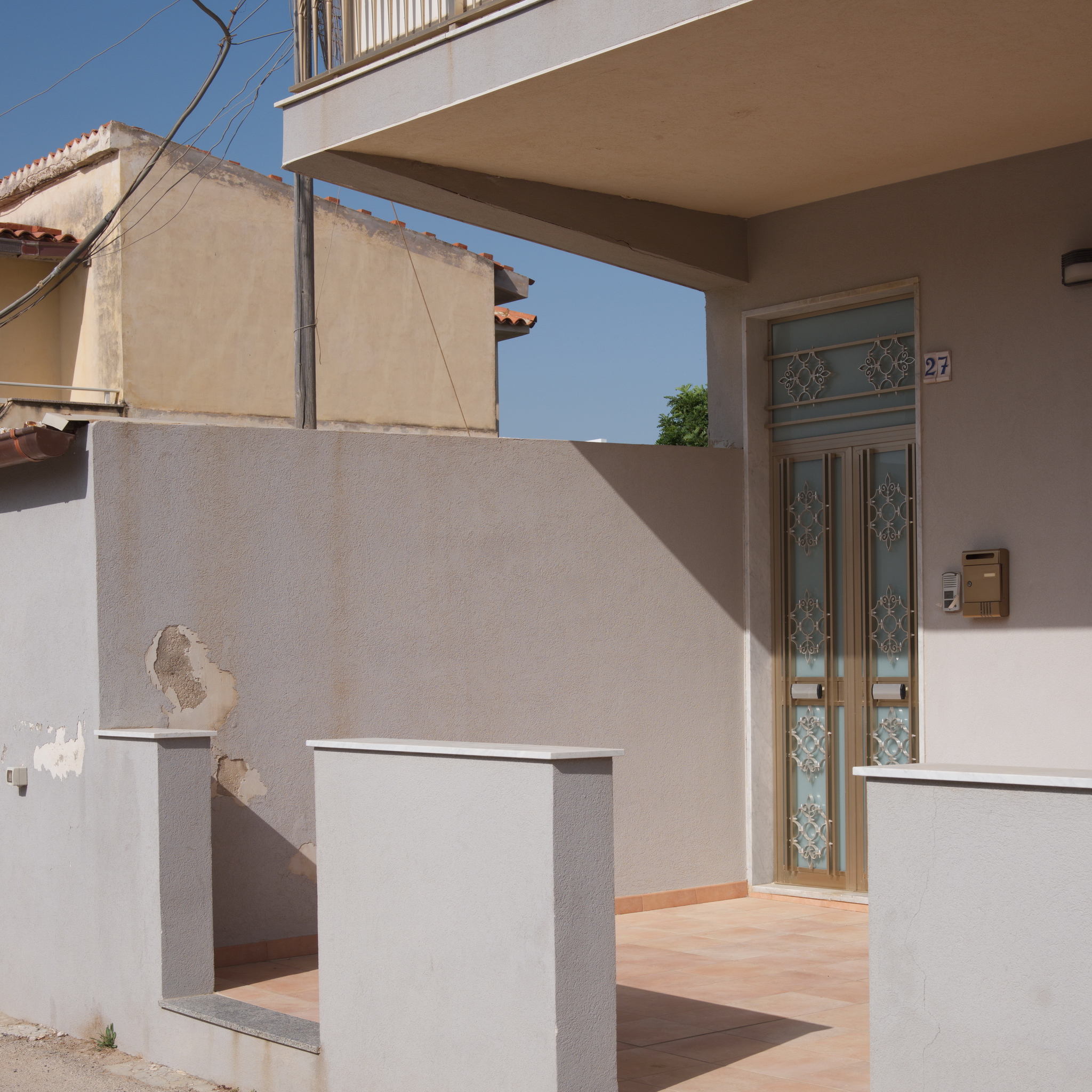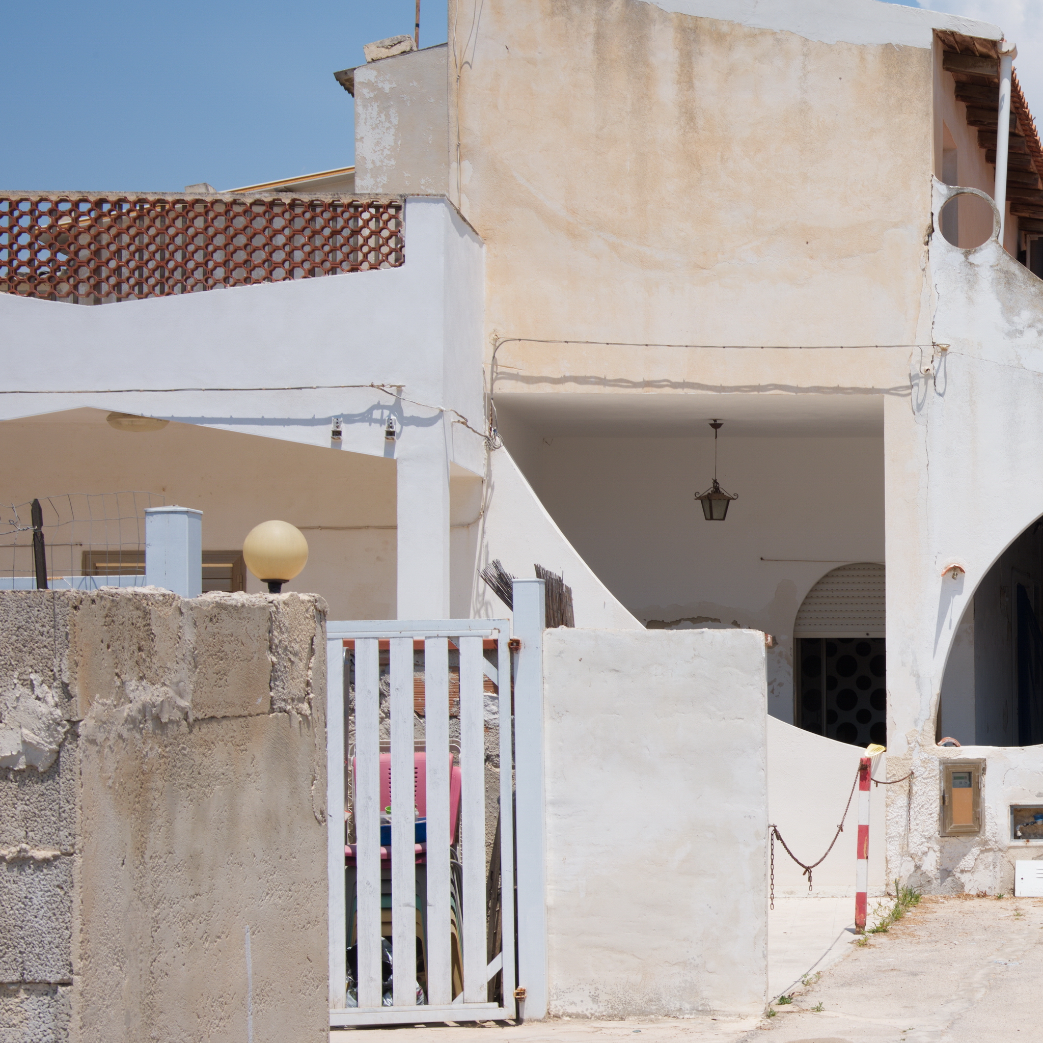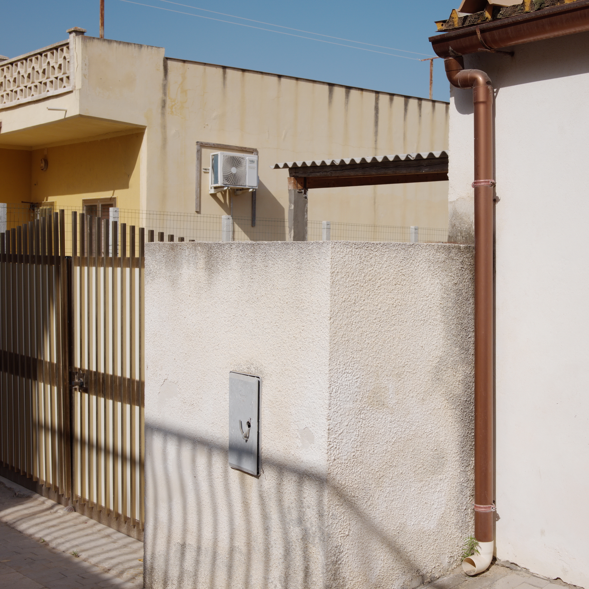 Here, space is not landscape, but a restrained gesture: a threshold that divides the light, a gateway that leads nowhere, a closure that preserves the memory of a passage. It is Sicily, or any lateral place where things happen without being declared.