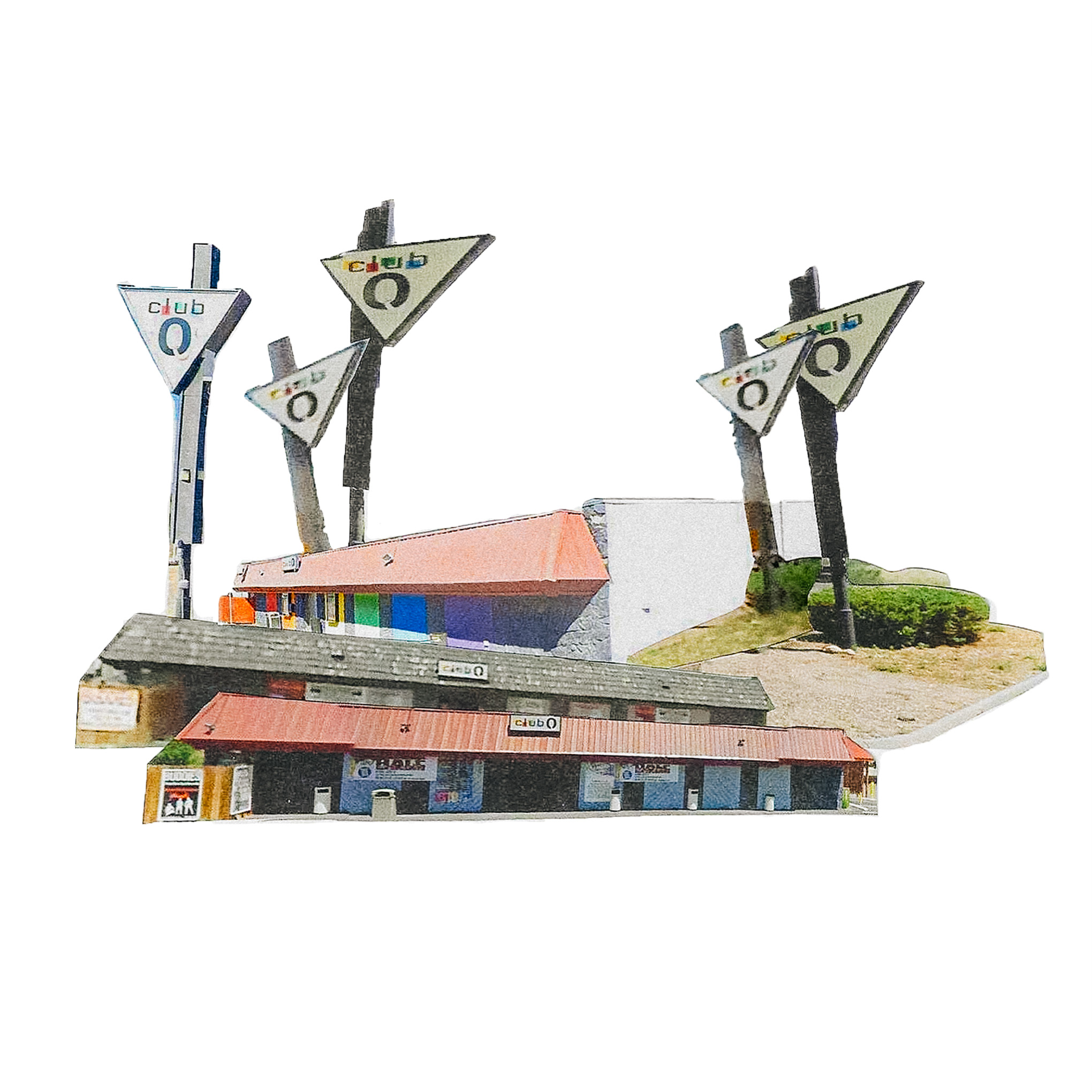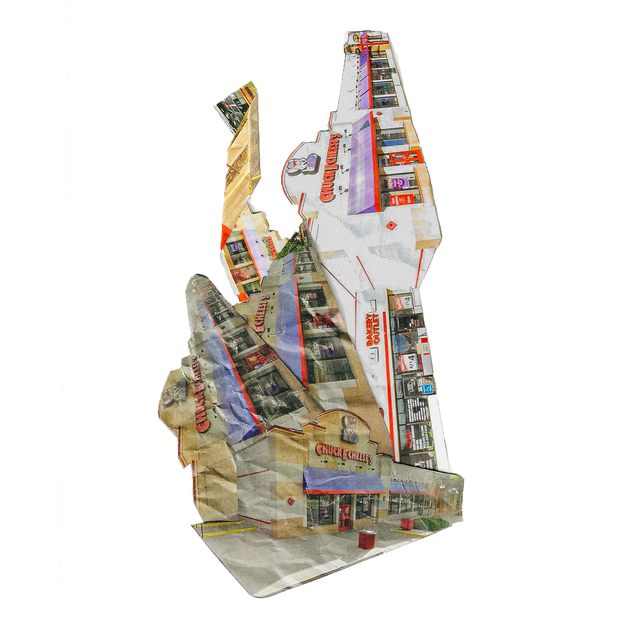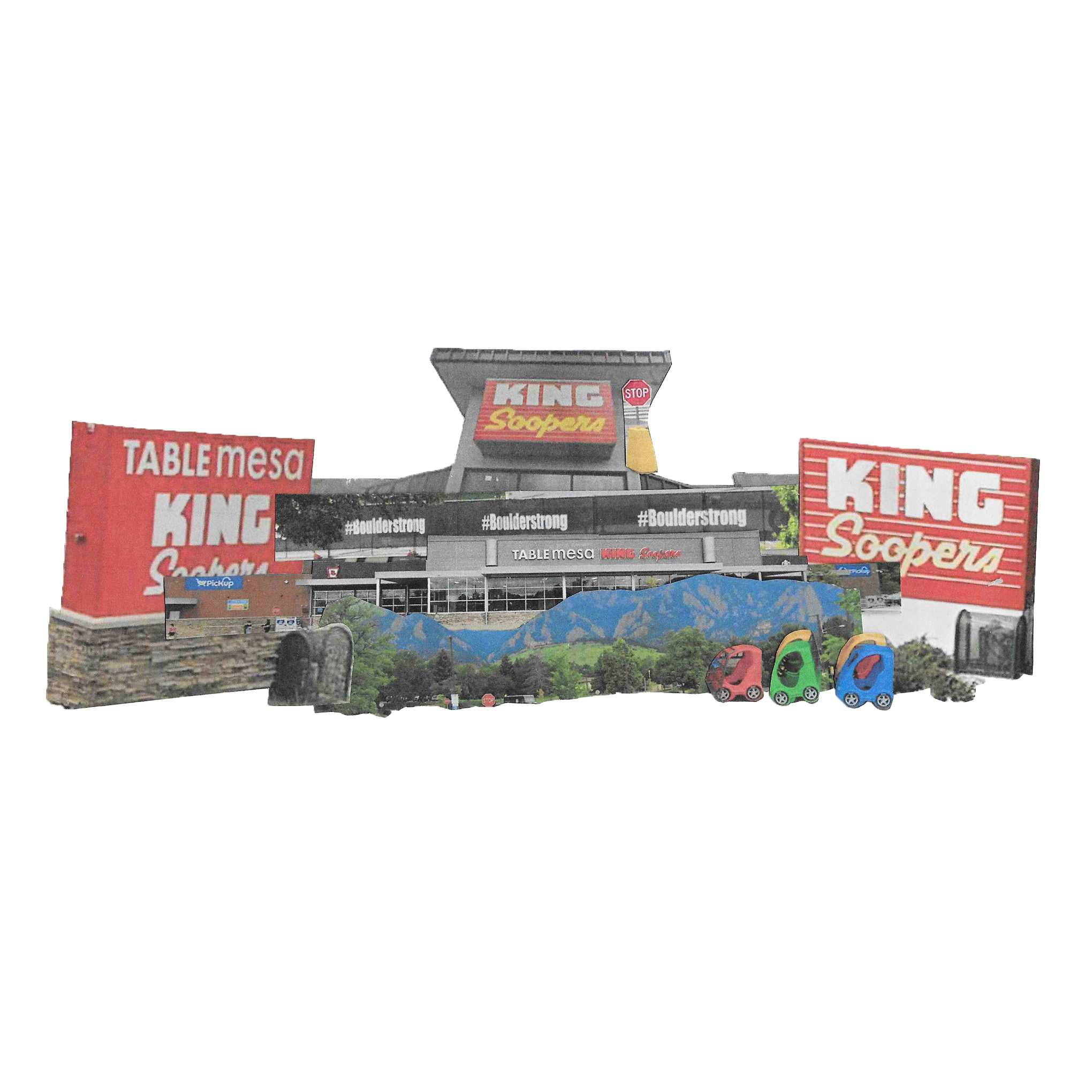 As a photographer from Denver, Colorado—a city repeatedly scarred by mass shootings—this research is deeply personal. The New Memorials focuses on my hometown, where I use Google Maps as a digital archive to revisit sites of tragedy. By studying these places through various timestamps I trace subtle and visible transformations in each landscape. I take screenshots of the landmarks before, during, and after the shootings and then cut, collage, and scan these deconstructed images to form reconstructed “monuments” from the very locations where lives were lost. Some sites have completely renovated the buildings of the shootings, such as the King Soopers supermarket in Boulder, Colorado. After the shooting, the store decided to renovate the building to create a different scenery so the community would not be reminded of the incident every time they pass by. The renovations serve to assist in the community's healing process, enhance security, and incorporate a permanent outdoor memorial.