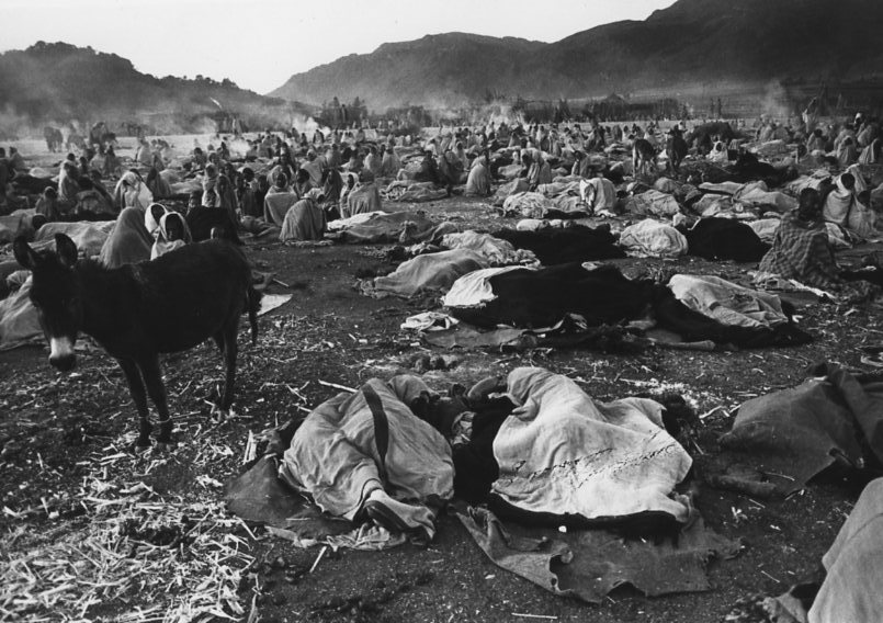 Like a living lithograph of a Biblical famine, hundreds of starving huddle in the open in the chill mist and smoke of early morning at Korem, Ethiopia 1984.
