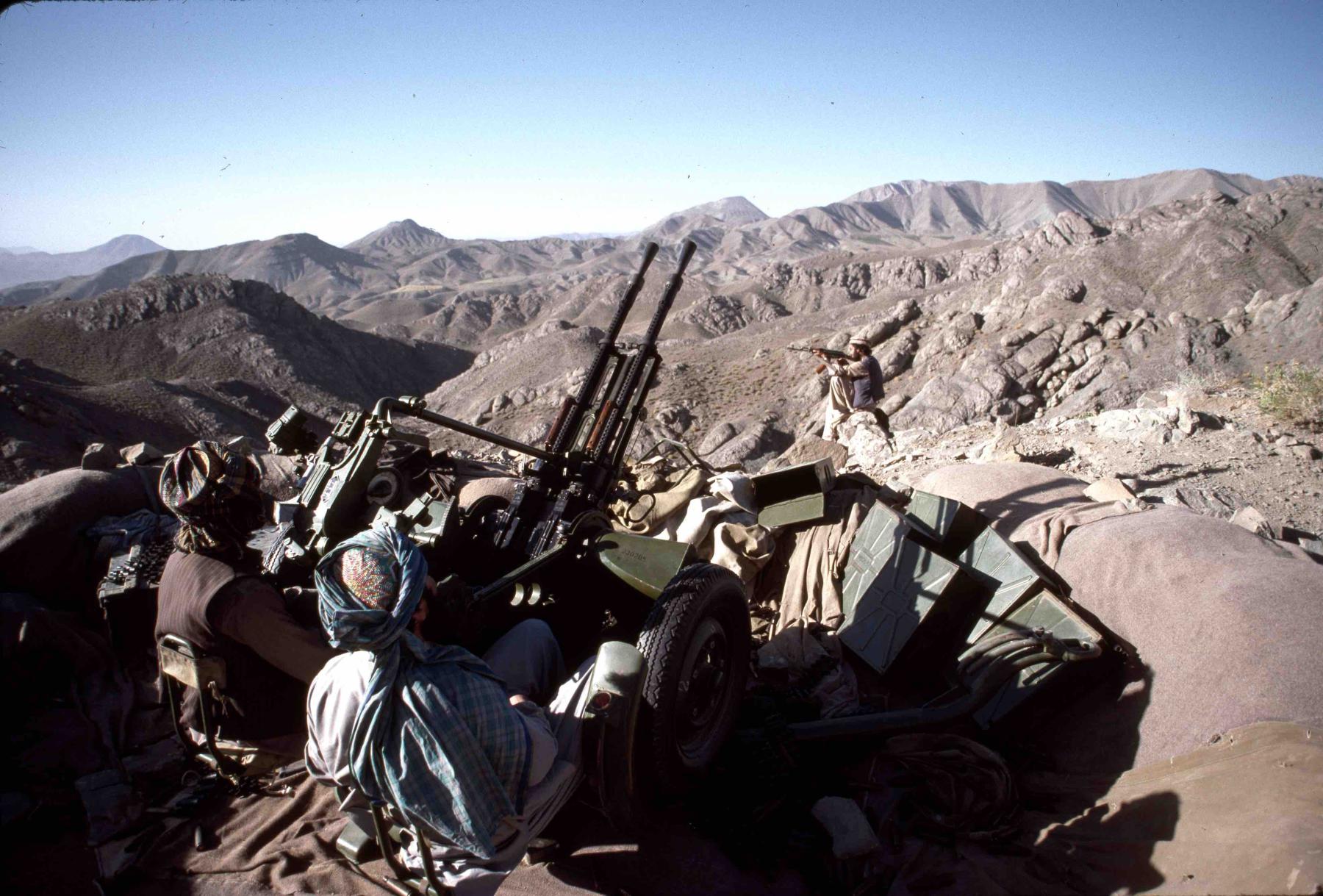 Mujahidin freedom fighters deploy their rapid fire anti-aircraft gun during the latest offensive against the Soviet forces in Afghanistan. July 1988