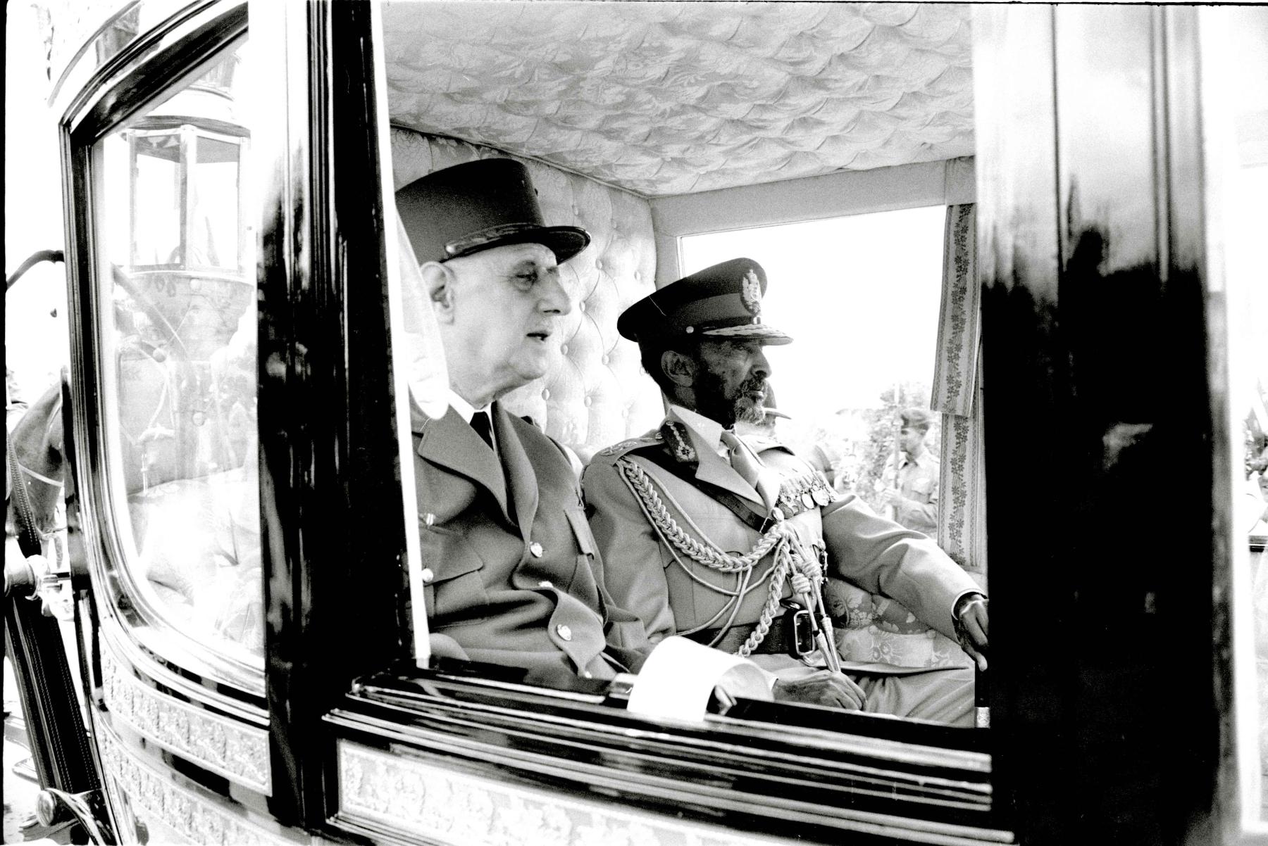 President General Charles de Gaulle of France with Emperor Haile Selassie of Ethiopia are photographed as they travel together in a Horse Draw Carriage in Addis Ababa