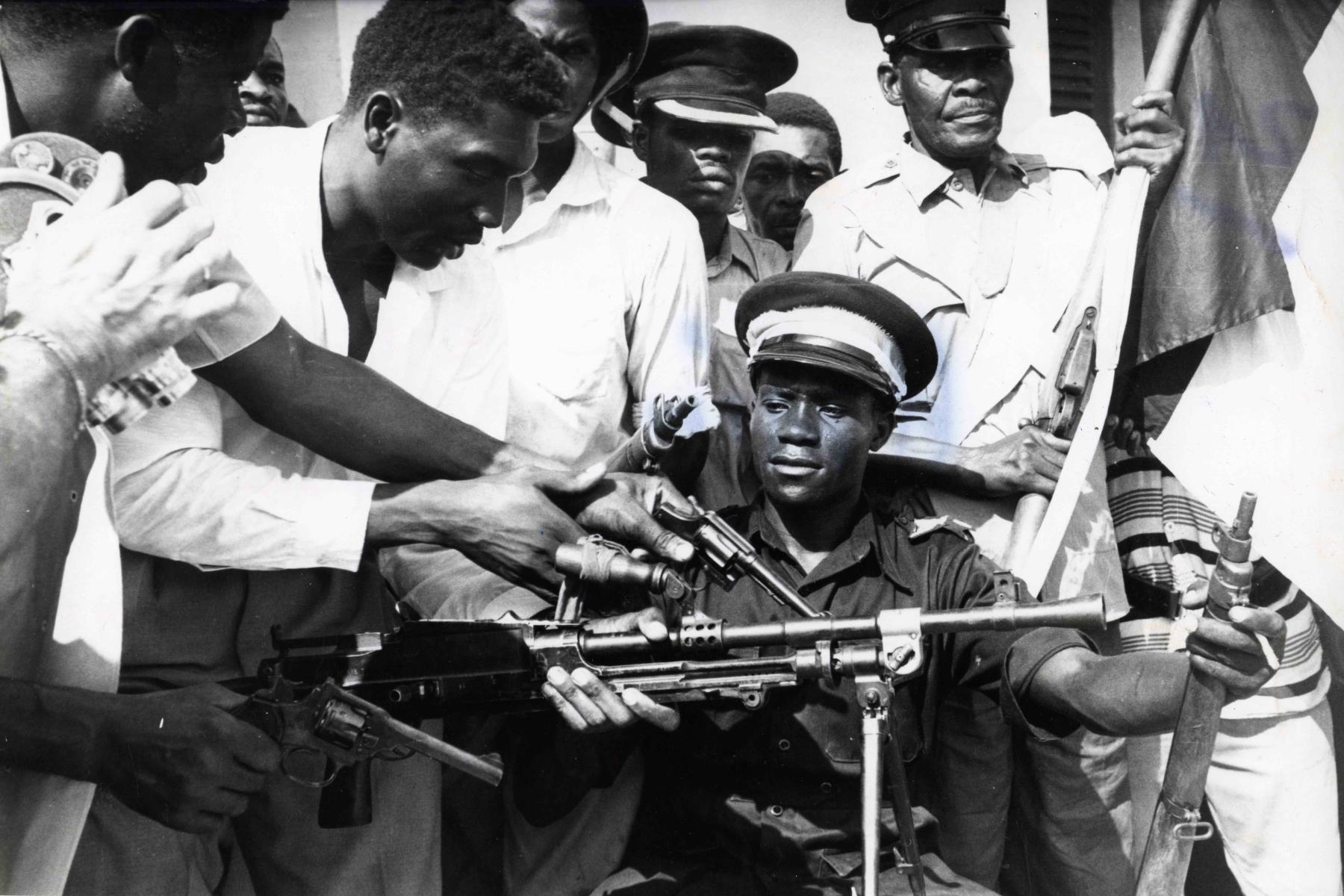 Self-styled Field Marshal John Okello, poses with some of his 600-strong peasant army while the island runs red with the blood of between 12,000 and 13,000 victims