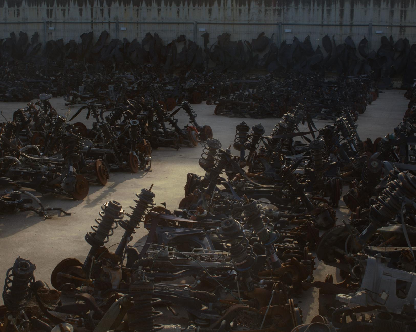 In the 'Fiesta' series I worked on something that I often observe in my daily life. I speak of recurring and significant elements: migrants who sell objects among the cars in the parking lots. Standing still in a hard flat space that can be extremely cold, or hot as the metal of the machines that partly fill it. On the other hand, I looked for mechanical objects, engines, that appeared in a transition phase. I was trying to reflect on the idea of identity by tracing pieces of strange hybrid identities. The external world functions as a shelving, external support to the processes of cognition (a way of unloading the workload): words simplify cognition as signals and reference points allow one to orient oneself in the world. If we did not have the ability to encode and decode symbols we would not be able to rethink the world in an alternative, abstract way, in order to live and manipulate the immense amount of data, and then observe them from different perspectives.