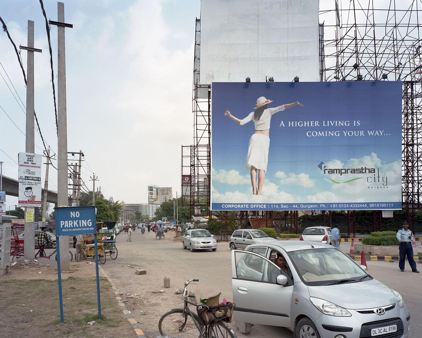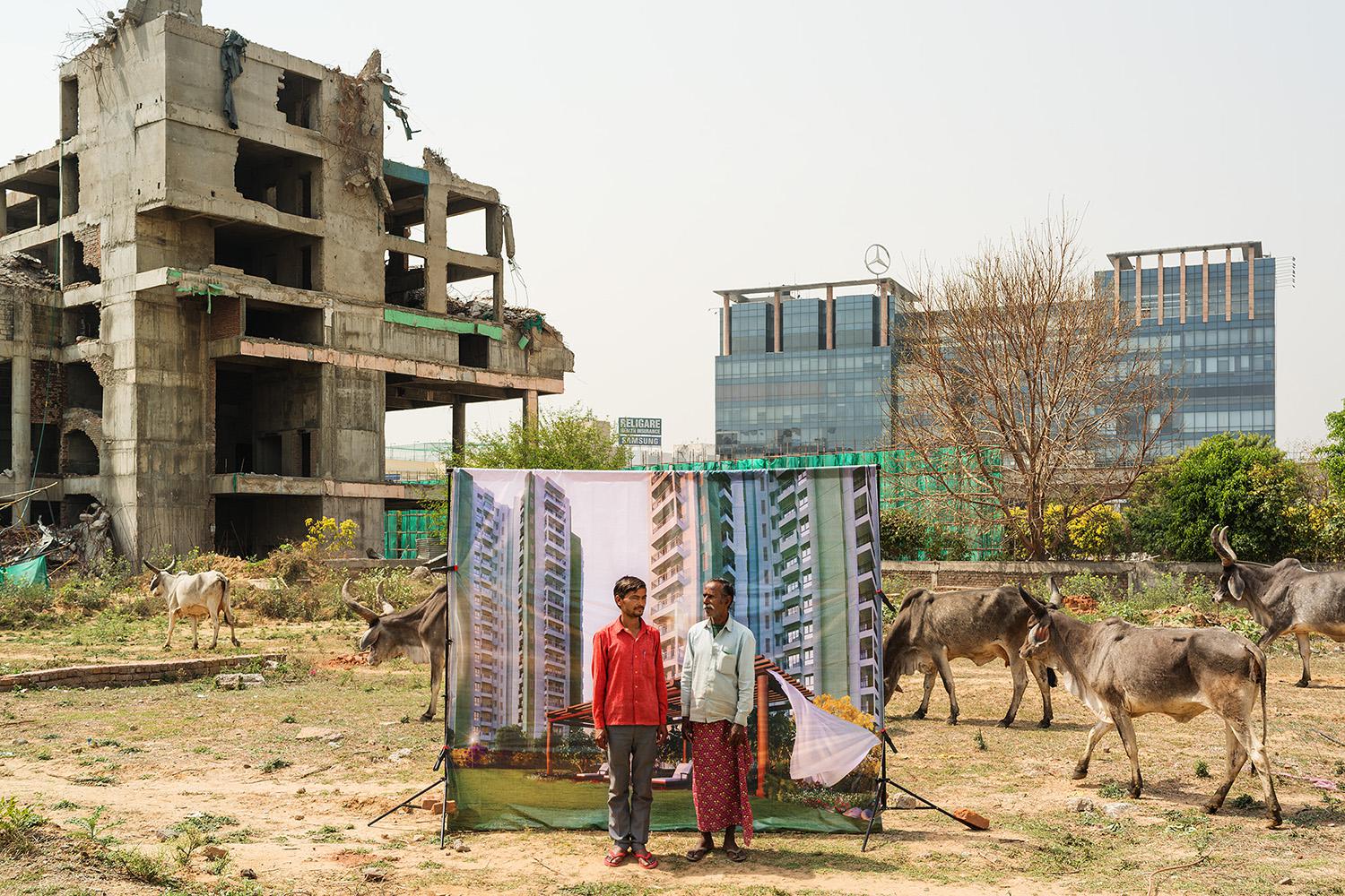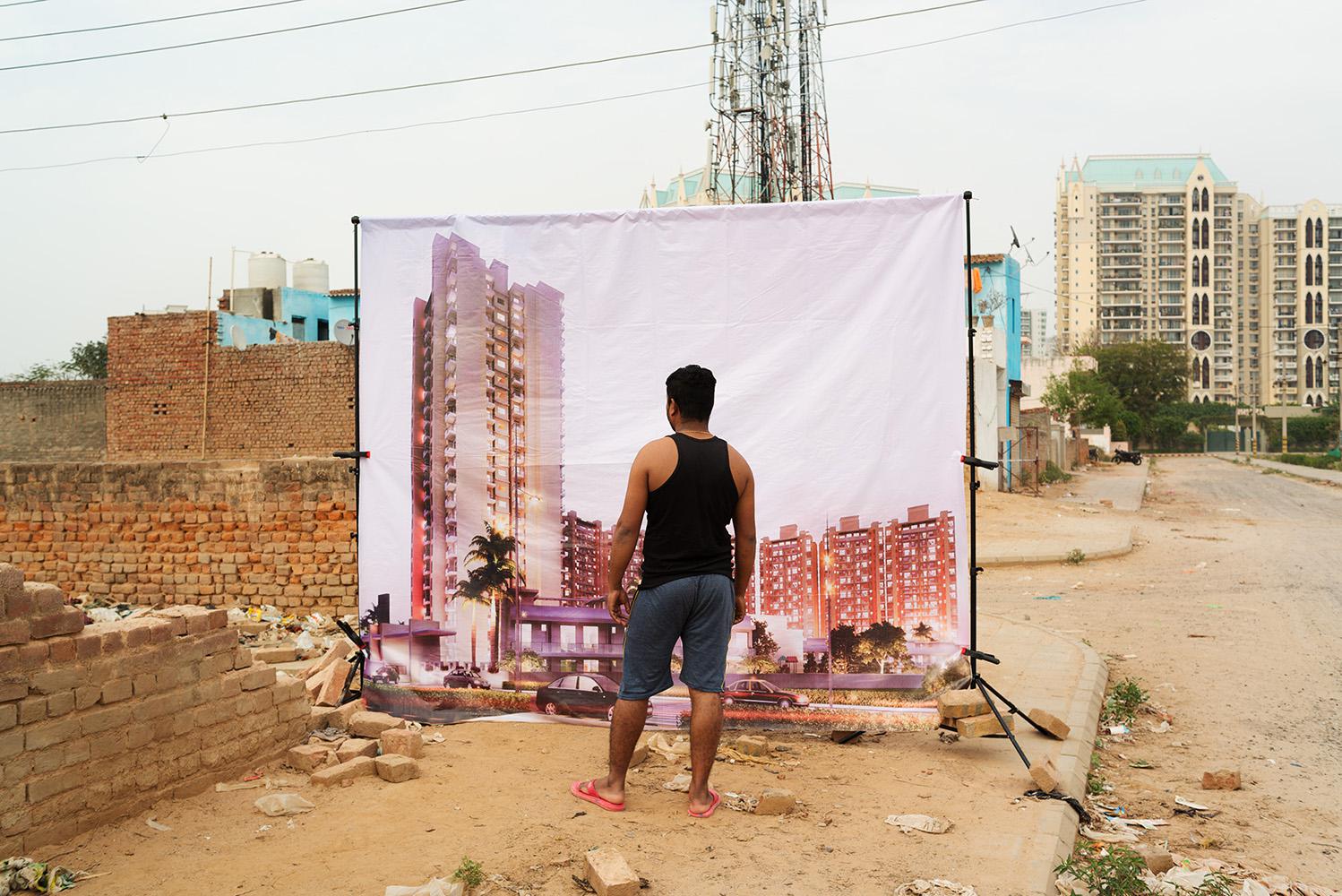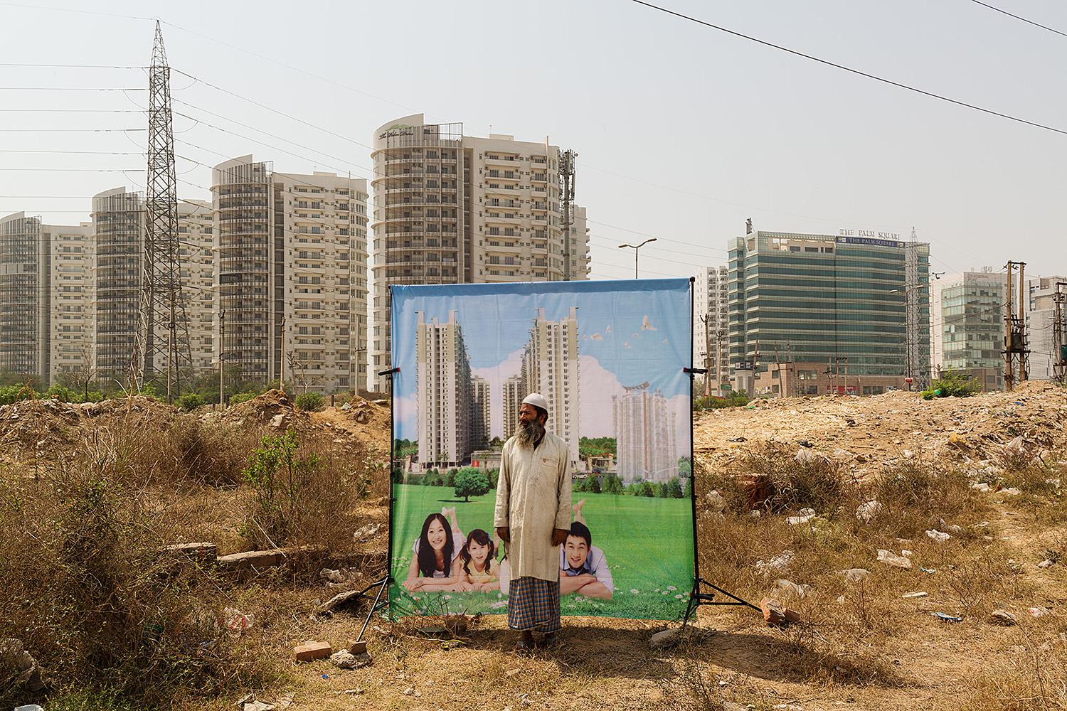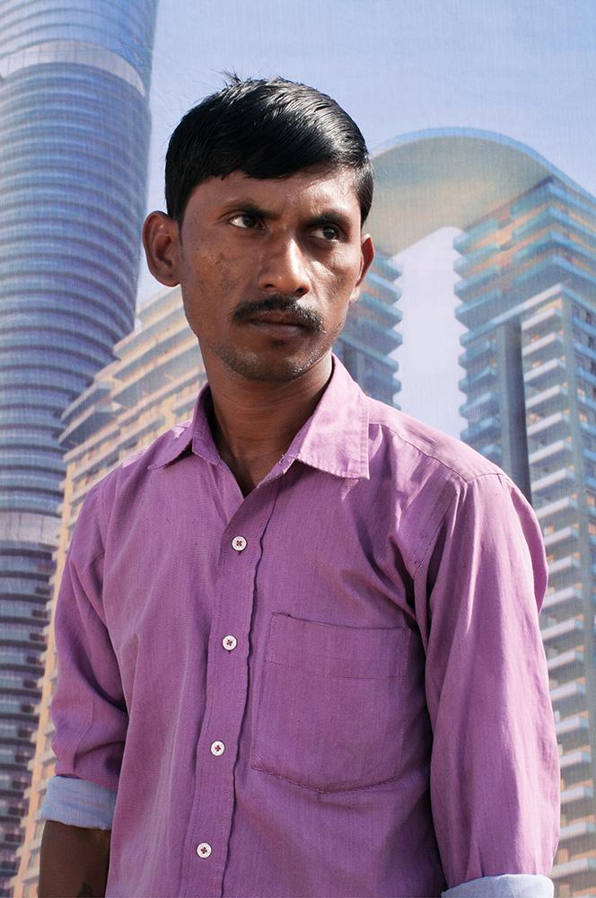 I looked for a way to depart from the usual modes of representation of Indian cities, which were increasingly framed as postmodern clichés of urban hell: overpopulated, saturated and inhumane. There is at times a morbid fascination for Indian and Asian cities in general to which I had myself succumbed in my early photographs. Using the form of the staged portrait, while referencing a long tradition of portraiture, was an attempt at engaging visually and socially with the question of the making of the city of Gurgaon, the satellite city of Delhi where the project was made.