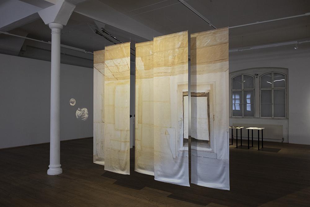 I choose places that carry a history and a rupture, menaced by disappearance. I find them through a variety of methods, for example by walking. Several of my installations have been executed in an abandoned military station in the forest of Brandenburg. I discovered it by accident, I broke into it and was confronted with the potential and abundance of space: tunnels, stairways, closed-off rooms, some buried or at half-human height, others very large and open to the exterior. I can find places by doing prerequisite research ahead of time. For example in Kaunas: The three weeks of my residency were sacrificed in regards to come back and construct an installation. I did three weeks of intensive research, where, thanks to the curator Gintare Krasuckaité I visited several places, an old textile factory, a burned house, and a military hospital, that became my project of intention. I was supposed to come back in order to make my installations and the idea was to transform the building in a temporary space for exhibitions and workshops, open to the public. Unfortunately, this ambitious project was canceled, due to financial and administrative complications. Other times I jump on opportunities. In Kaliningrad, after having sacrificed two weeks of my residency traversing the city, researching and proposing different ideas and work intentions, the curator Zinaida Sherschun found a place with several vacant rooms due to water damage. This was a chance and an important step, suddenly I found myself with a space to realize the different drafts of my proposal. To choose a place is indeed most often a long process, a come and go between observations, readouts, research, collection of materials and work on-site.