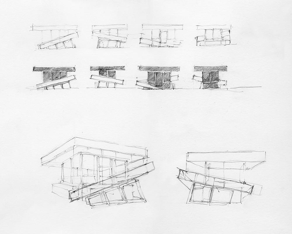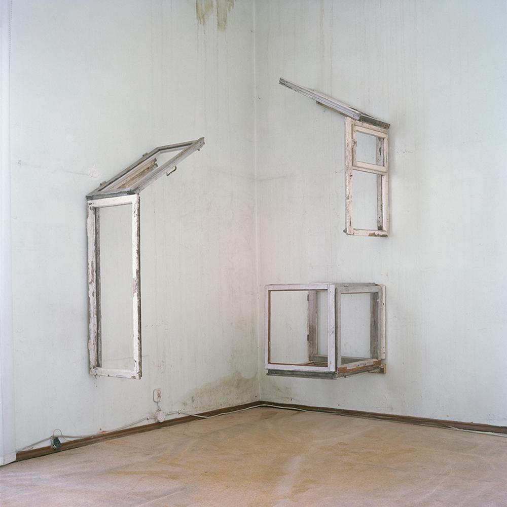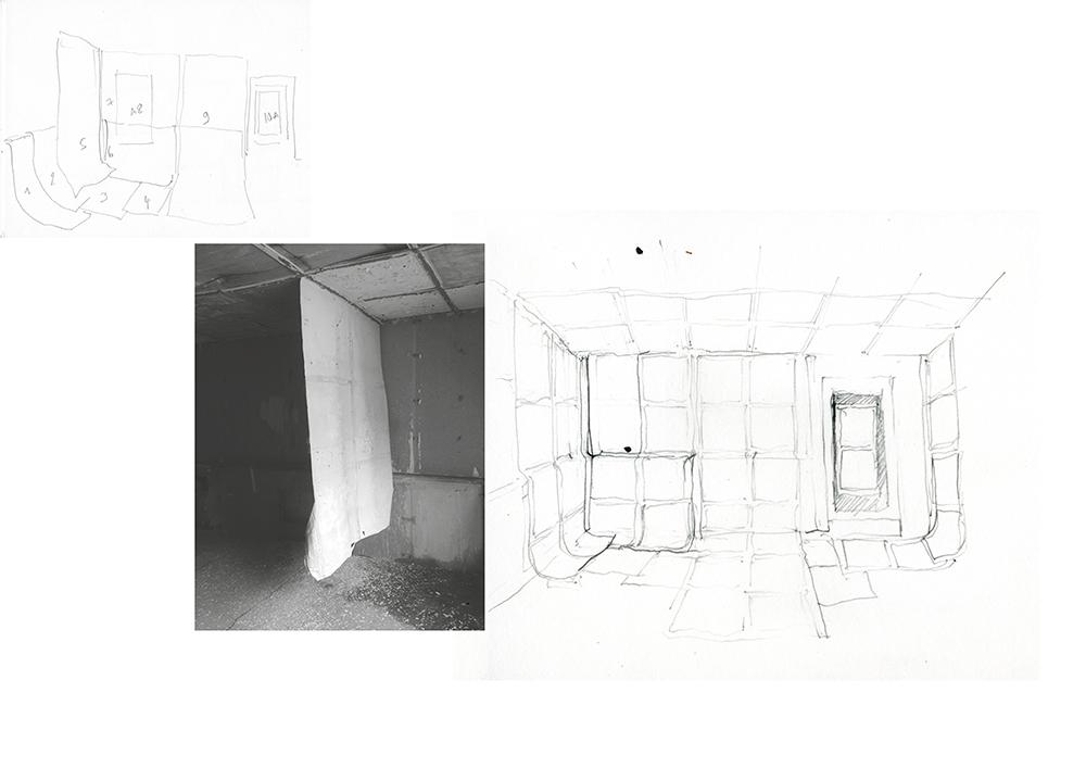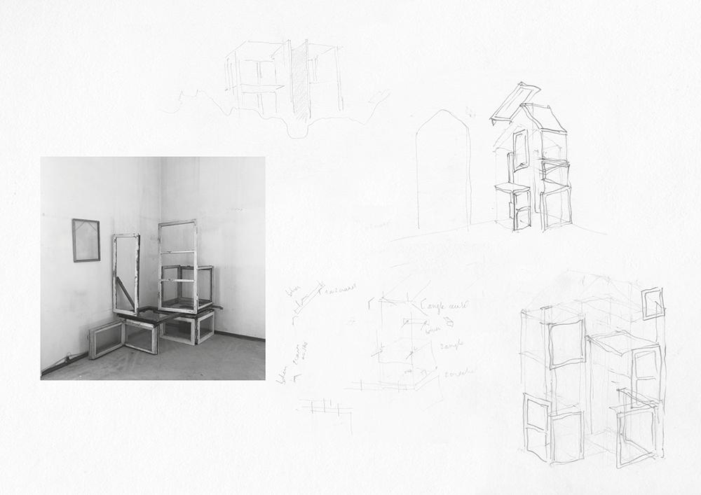 This work mixes photography, installation, drawing and writing. Drawing is for me a way to analyze and reduce to the essential, a work tool. Before each installation, I draw a sketch of the installation. Photography is of two types: first a documentary approach, a survey; the second use is metaphorically and treat the notion of between, the transition. The installations are a necessary step to transcribe the relationship to a constructed space, which I often describe as one of the most important parts. In Kaliningrad, the installations were possible thanks to the available rooms that became my studio spaces. Here again, like for the drawings, the process of deconstruction and decontextualization are means of analysis and reduction.