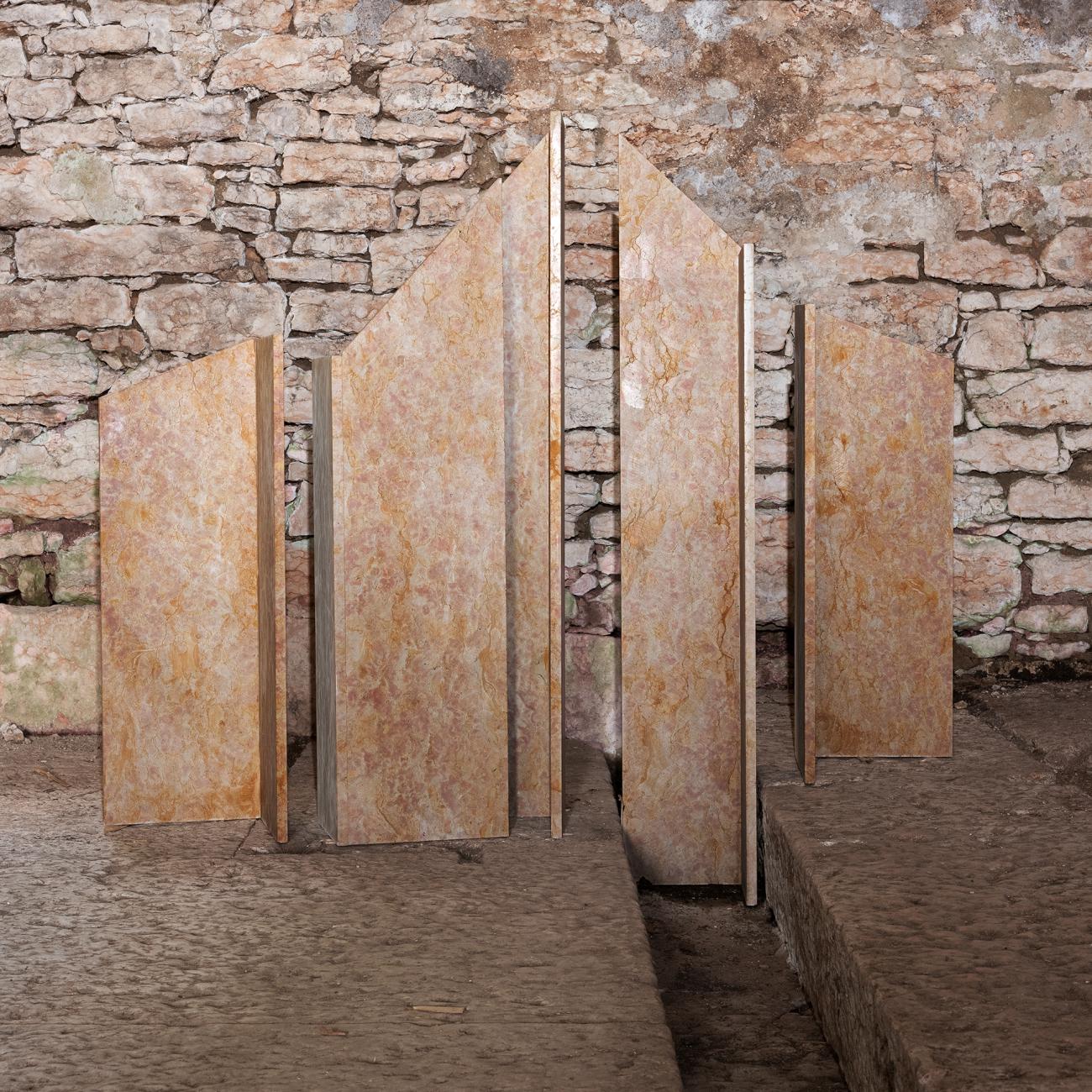 © Claire Laude, Murs d’eau, Voiles de pierre, 2019 – Installation, yellow pinkish stone from Lessinia