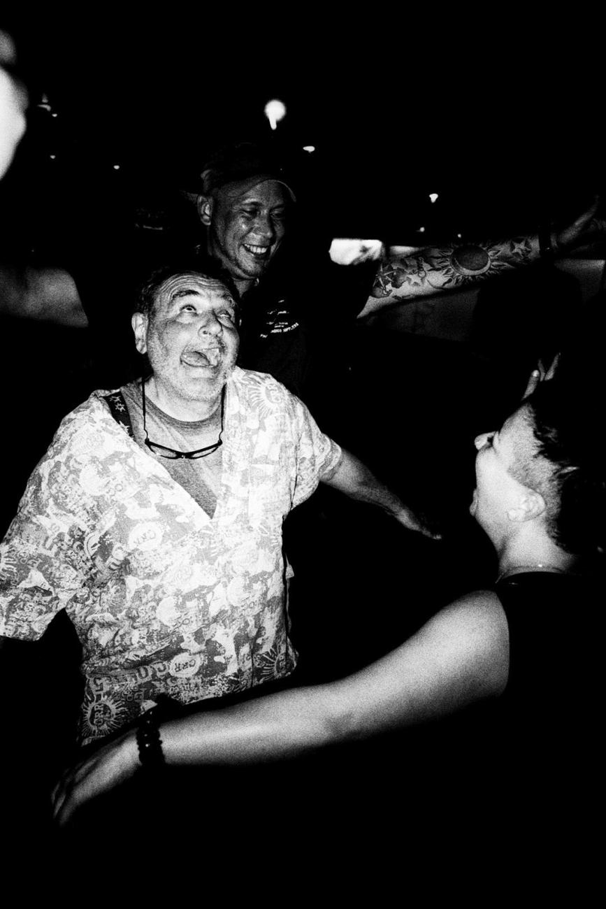Discos are alienating places and this allows room for action. People are intent on letting go and the flash of the camera mingles with the lights and strobes. For this, I have not encountered particular problems. A manager of a club once raised questions, but nothing more than that. I also like to give a print to the people I have photographed, when I have the opportunity to do so. It happened that a girl recognized herself in a shot in which she was hugging a boy. I was a bit scared she would complain but instead, she asked me where I did take the photo because she couldn't remember who she was with. Probably it's still a mystery.