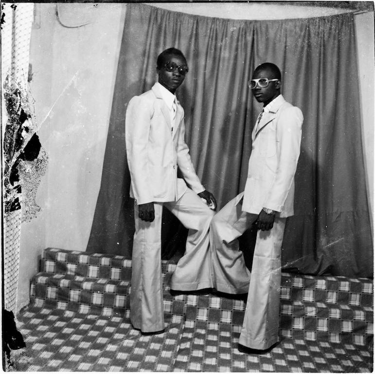 © Benoît Adjovi, Cotonou, Benin, 1970s. Double portrait, men in matching white suits and sunglasses. This photograph belongs to a larger class of “twin” image, common in West Africa, in which twin relationships, whether biological or spiritual, are evoked.