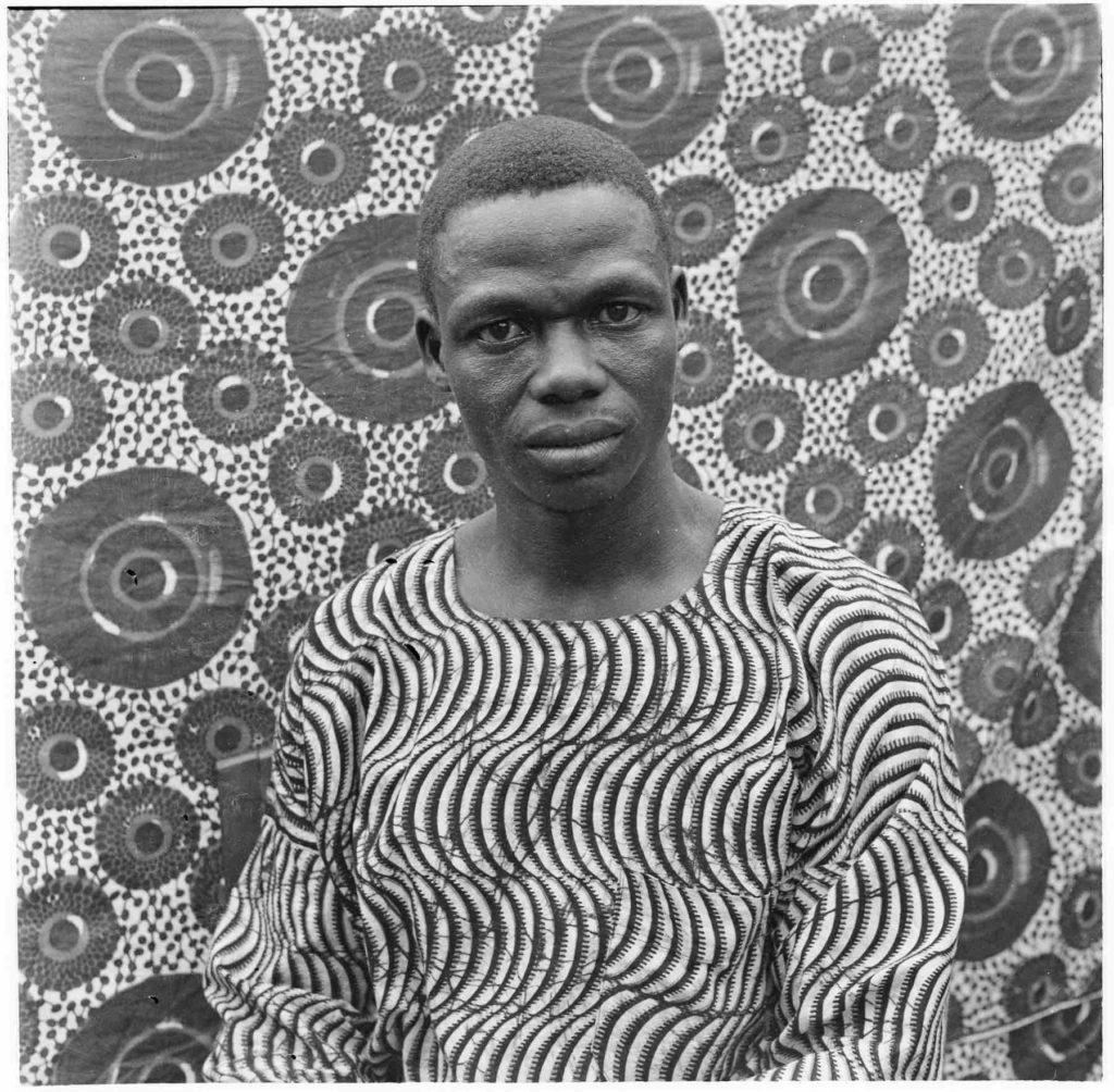 © Benoît Adjovi, Cotonou, Benin, 1970s. Portrait of a man before a wax-print textile backdrop. This particular textile is a variation on a well-known pattern.