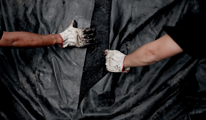 JK: It is true that most of my work has this image deconstruction, but it is not random; it often happens with elements that could not originally be detached from one another, like figure and background (mountain and sky) for example. My work process does not follow a precise path. It happens in many ways, most of my work happens outside the studio, in observing the streets, the relation between people and spaces, what is said and how I hear it. The video 'Breu', for example, happened when I watched a street being asphalted, and how tar adheres to everything. It seemed like it contaminated everything around it; I remember seeing the work material, watering can, gloves, everything was tar, they looked like fossils. And I associated this to discourse, how an idea about something can be sedimented, imprisoned, fossilized. This video shows through images the semi-handcrafted process of asphalting wasteland, while it presents through audio a speech from someone imprisoned, confined between “right and wrong”.