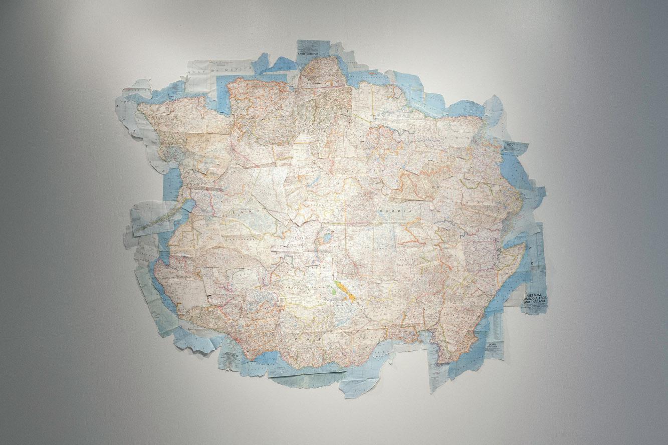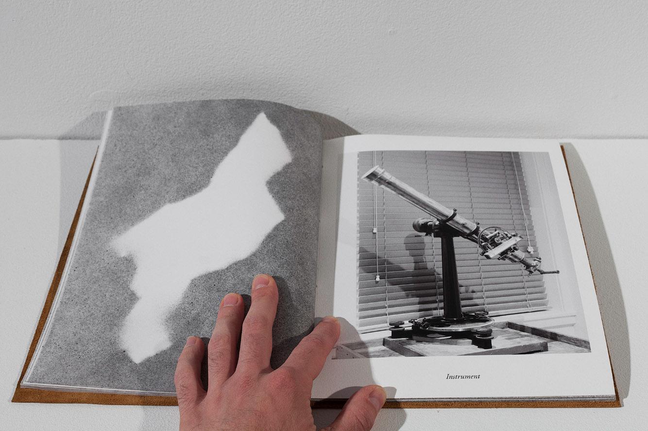The exhibition itself was made by a map of torn pieces of National Geographic maps of the entire world. A modular island/Pangea that every time you move it to a different location, has to be rearranged and changes its shape. A Spanish inspired colonial ship made of books related to scientific disciplines such as anthropology, astronomy, physics etc...,religion, fiction and popular comics and literature. Some of the books are texts I love and criticize. Authors such as Bronislav Malinowsky, Charles Sanders Pierce and so on. But you can also find the bible, the whole earth catalog, Don Quixote, Mickey Mouse. One of the sails for example is made out of a page from an astronomy book dedicated to the Arecibo Message sent in 1974 to contact other forms of life in the space. Then we have a triptych of photographs about sources, an endless seascape, a big rock/island and an artist book. This last one contains the pictures I was initially thinking about, but then I edited them out from the exhibition itself, to make this sort of log. After the first show, the book started to become something more, and I kept expanding it and working on its content.