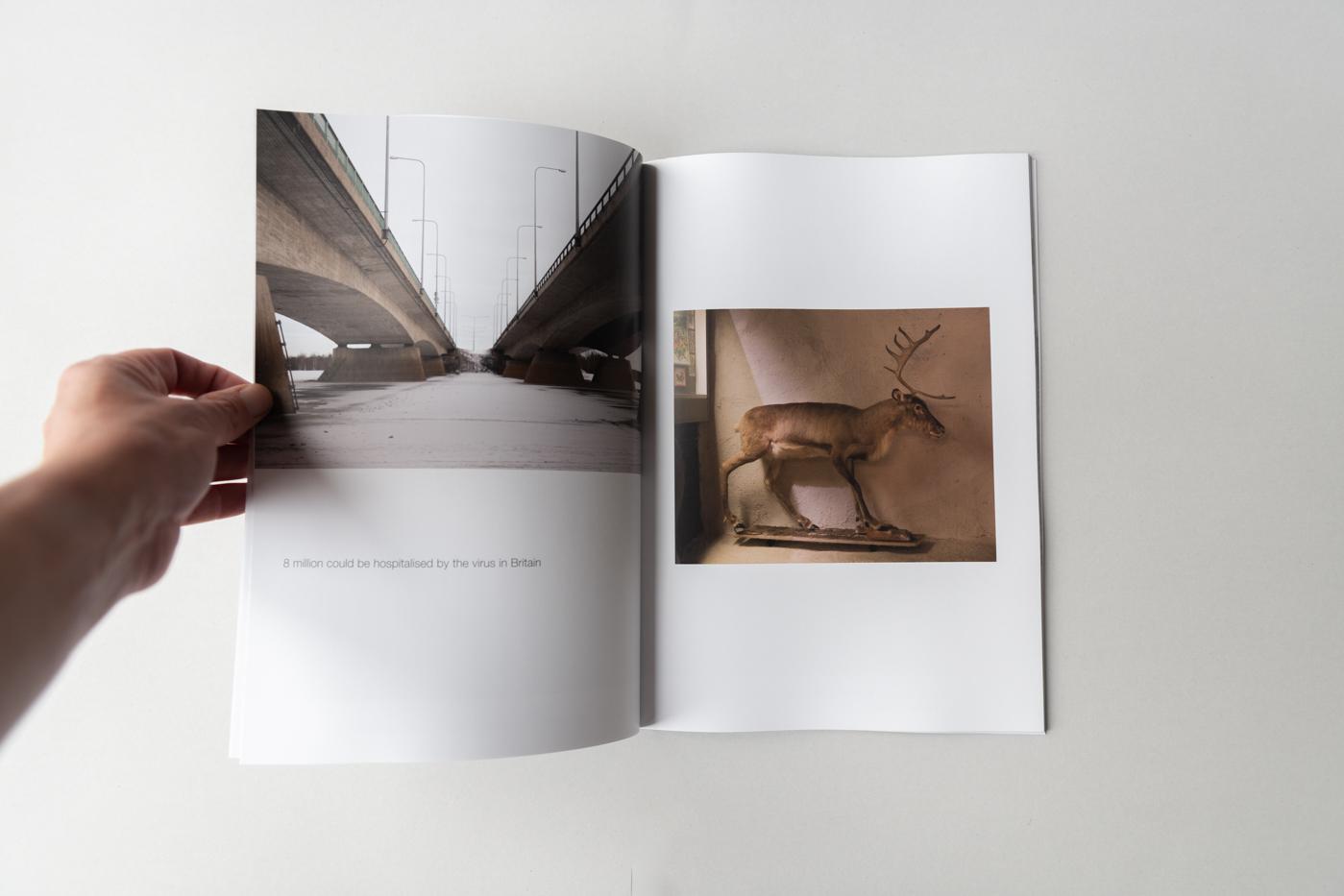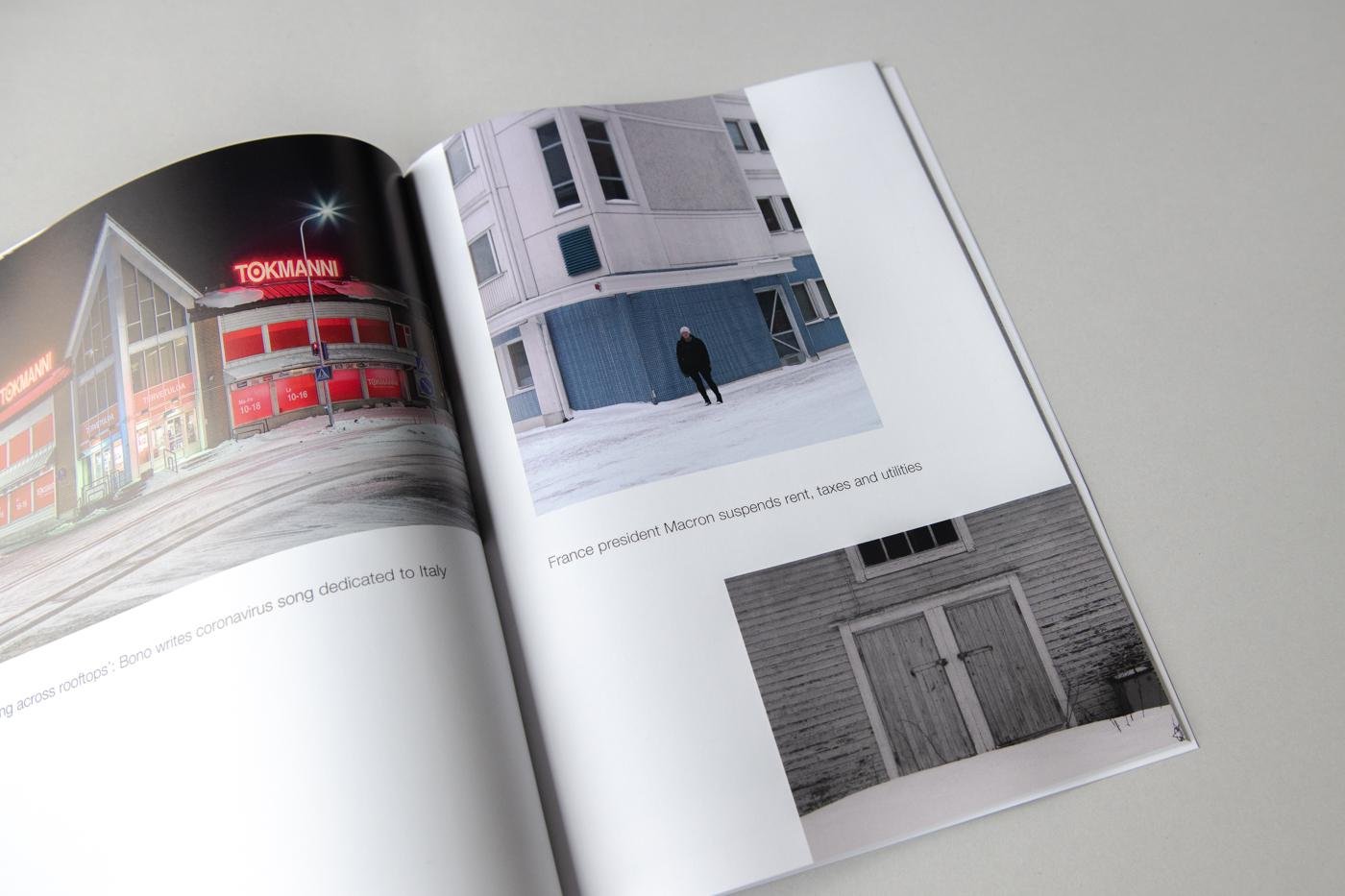 This was a different way of working than before, very spontaneous: the normal process would be to each have a distinct researched project idea, which coalesced around an over-arching theme, however for this project we worked very closely together on the same idea. This involved looking at each others images every evening, thinking about what we could add, how one image seemed to resonate or bounce off another, when was a good time to go out together to explore places. And we also gathered together headlines that we thought could resonate with the images, keeping it experimental and anchored to a very particular point in time. The resulting images were then put together in various different edits, with quotes being added or taken away. This was tricky as the images were very different, from very dark landscapes to snowscapes and portraits. I think we went through maybe six or seven edits with the rest of the collective, who gave us further feedback and advice, playing around with the size and sequencing of the images, whether the chosen headline worked with the accompanying image, etc, before arriving at a final collective piece that then formed the resulting book.