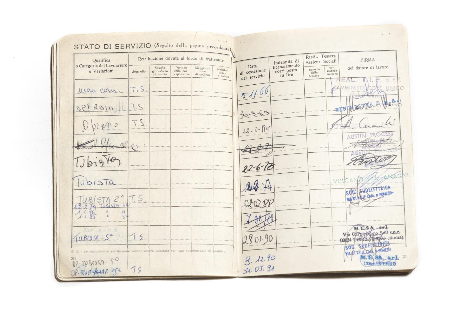 As I said before, having to detach myself from a too inner vision was one of the processes I had to implement. I achieved this by analyzing and removing all that would have been excessively rhetorical. It's easy to fall into the trap of "before it was better" or to point out that our cities are full of historical beauties that have not been given the right dignity over the years. But the story stands on another register: how the industrial development of territory has influenced people's lives for better or worse over time? For example, I put a photo of my father's workbook, which is there to document today's pollution of the industry and the cathedrals in the desert and redemption of the new generations from the past agricultural slavery. However, this emancipation was paid bitterly by the environment.