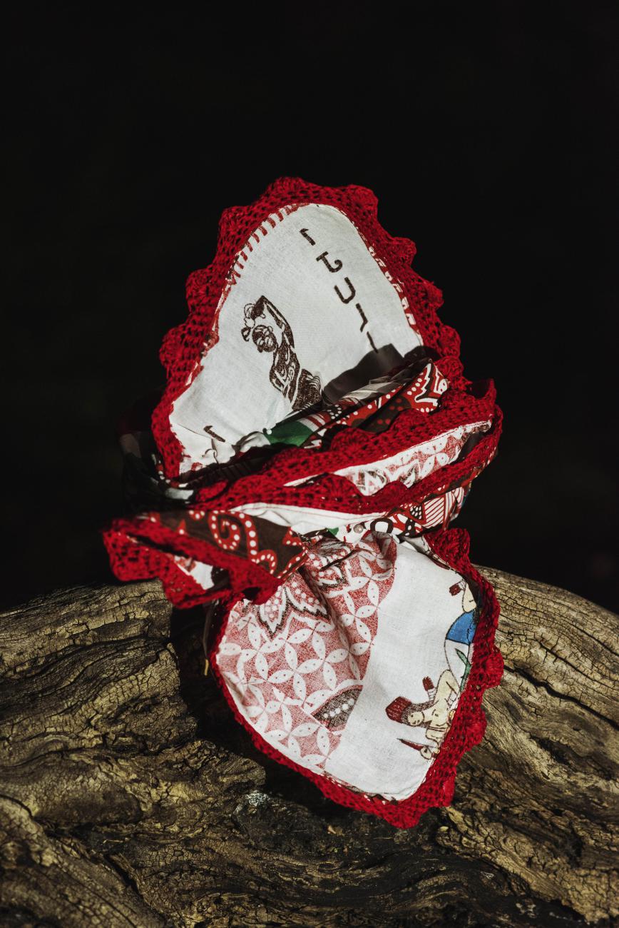 MP: While researching the Anansi stories of secret communication during slavery, I stood upon the term Angisa’s: folded headscarf with hidden messages. In the same period as my research, there was an exhibition about the traditional Surinamese clothing at the Klederdracht museum in Amsterdam. Once I found out about the exhibition, I went to the museum on a Saturday morning, listened to all the short movies, and looked at the clothing. The given information was not going into depth with the Angisa as I hoped for; it was mainly about ‘koto’ clothing. With a bit more information, I returned home and bought some books and fabric to fold an Angisa myself. On the internet, I couldn’t find any instructions on how to fold it. In the end, I found a website of a woman who did Angisa folding workshops and contacted her. I explained my research on the phone and that I would have liked to learn more about it. After that, we’ve met and called many times. I’ve learned that this kind of information you can’t find on the internet but the people/community related to the topic or culture.