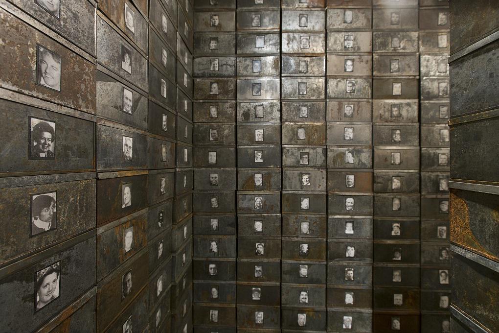 Installation view of the exhibition 'Revisiones: Álbumes, Promesas y Memorias', Christian Boltanski, Réserve des suisses morts, 1991, Huesca, Spain, 25.11.2016 - 26.02.2017