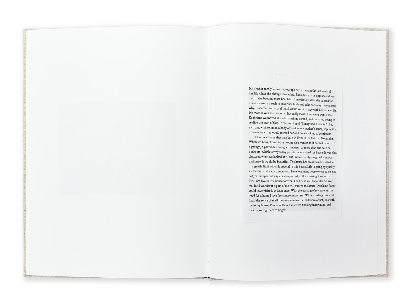 Ruth Manenti (RM): I live in a house that was built in 1940 in the Catskill Mountains. When we bought our house no-one else wanted it. It doesn’t have a garage, a paved driveway, a basement, more than one bath or bedroom which is why many people undervalued the house. It was also cluttered when we looked at it, but I immediately imagined it empty and knew it would be beautiful. The house has small windows that lets in a gentle light which is special to this house. Life is going by quickly and I have lost many people, close to me, and not, in ways unexpected or if expected, naively I did not see coming. I know that I will not live in this house forever. The house will hopefully outlive me, but I wonder if a part of me will outlive the house. I wish my dad could have visited, at least once. Somehow, with the passing of my parents, the need for a home I love feels more important. While creating this work, I had the sense that all the people in my life, still here or not, live with me in my house.” Above is the statement I wrote for the project. Since then, I have made several book versions, in search of the right edit and sequence etc. The latest book is called I Imagined It Empty. The earlier versions were on thinner and translucent paper and that gave the book a delicate, ghostly, and feminine feel. But in hindsight, by repeating with materials similar ideas that are in the pictures, each cancelled each other out.