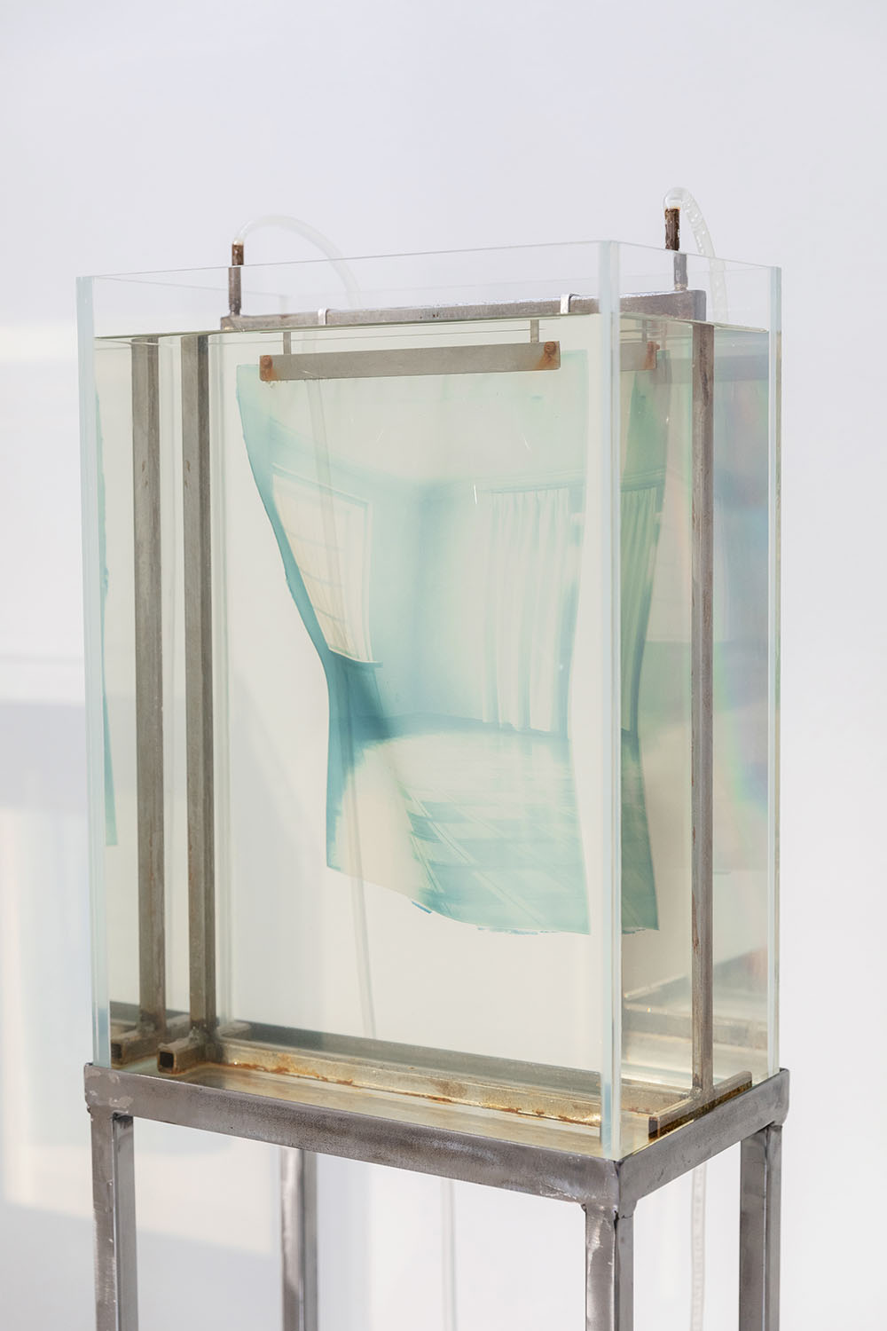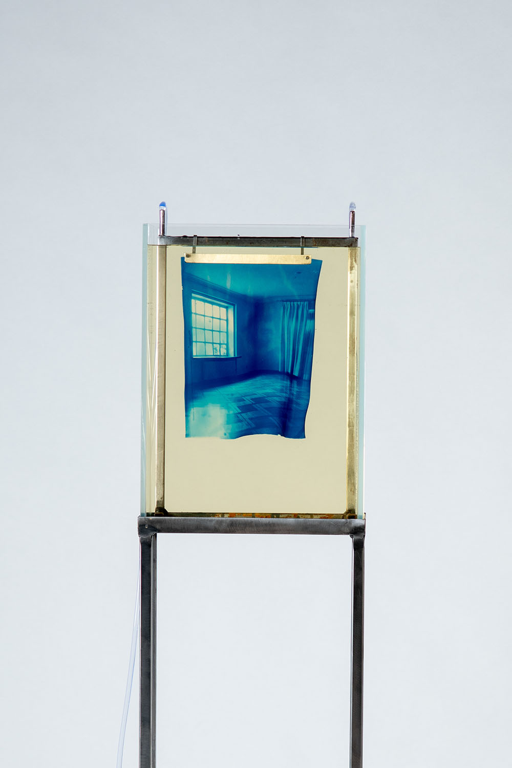 © Vincent Zanni, installation view "La Maison" Cyanotype prints on gelatine, glass, steel, water, 30x50x148cm, 2023