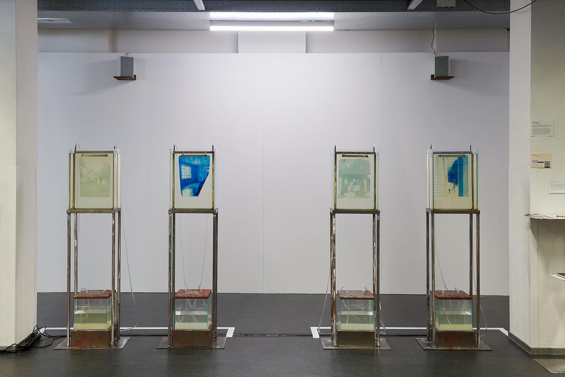 © Vincent Zanni, installation view "La Maison" Cyanotype prints on gelatine, glass, steel, water.