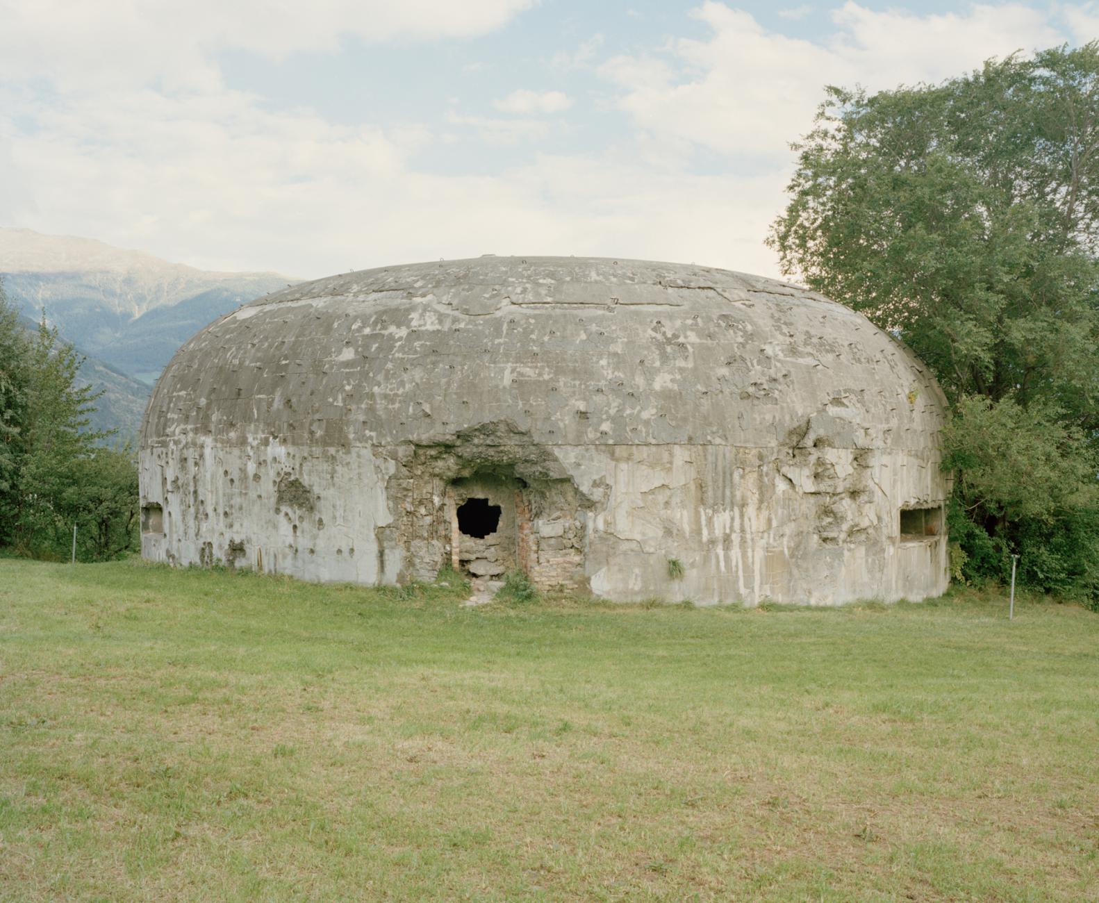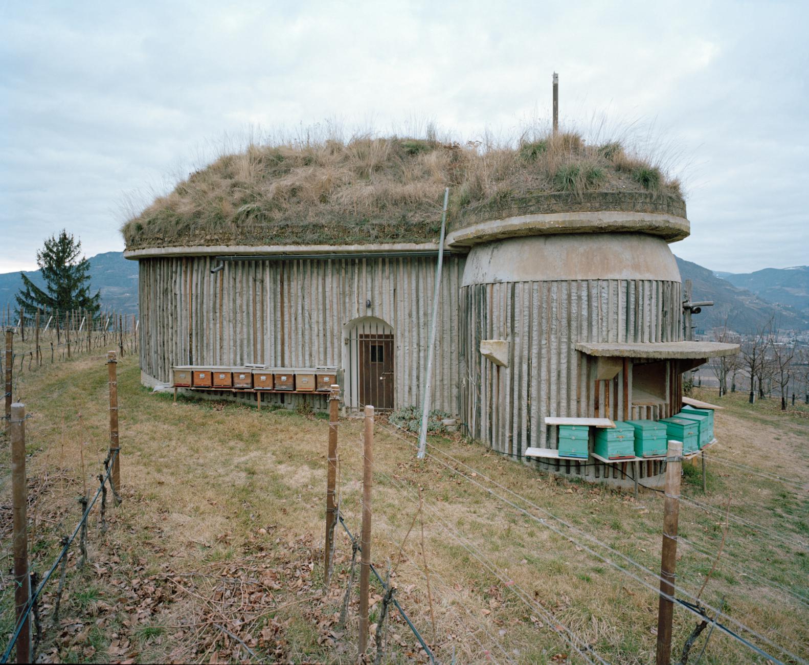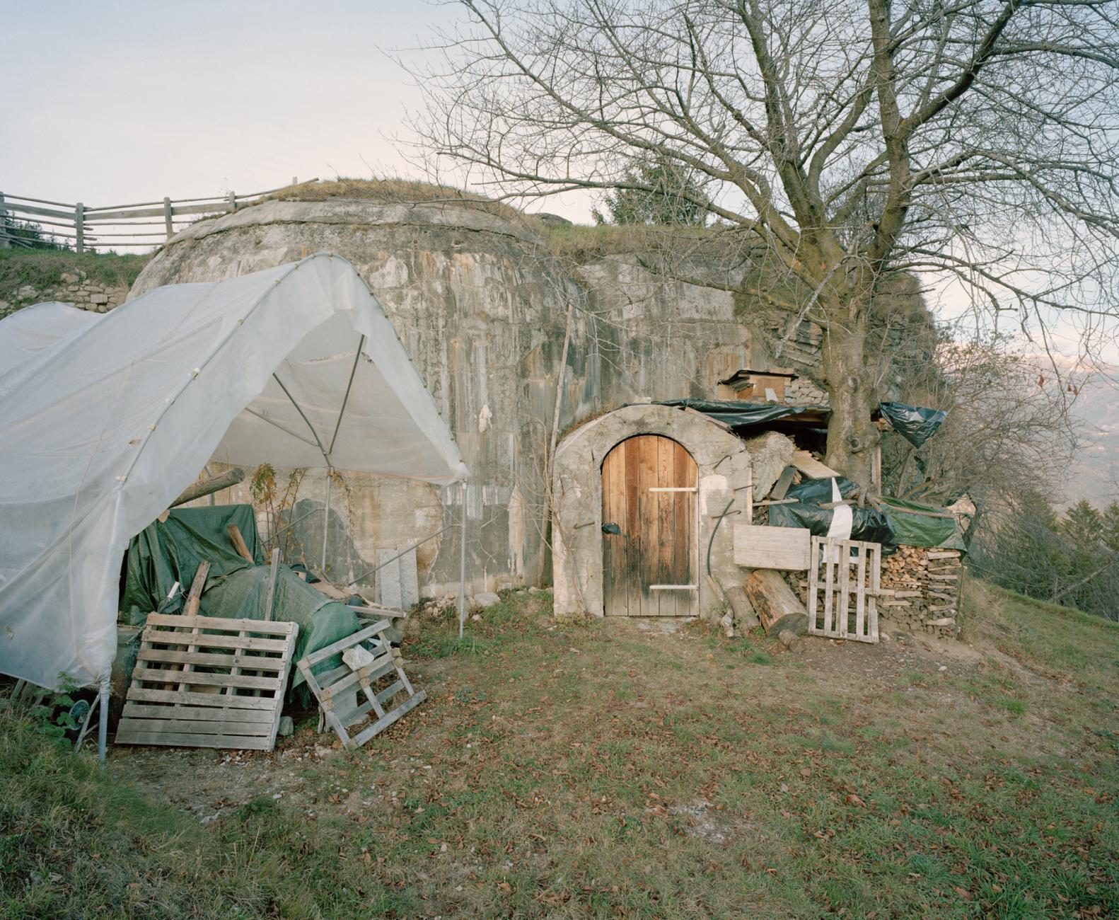 Vincenzo Pagliuca (VP): The first contact with the bunkers dates back to summer 2018 in South Tyrol. During an artistic residency (TiefKollektiv - ProfondoCollettivo, curated by Michele Fucich) in Glorenza, in the upper Val Venosta, I was soon attracted by the imposing reinforced concrete caps visible among the apple orchards just outside the medieval village. I stayed near those structures for a long time, fascinated by how, despite their monolithic presence, they have become an integral part of the landscape; the locals do not seem to pay particular attention to it, and a thin layer of vegetation covers them. In some cases, the bunkers have been converted into agricultural warehouses and cellars. Later I learned about the approximately 350 fortification works scattered in the autonomous province of Bolzano, so I decided to take the photographic research on a wider territorial scale, visiting several dozen sites over two years. In its own way, the project continues the research undertaken with mónos on archetypal images of inhabiting.