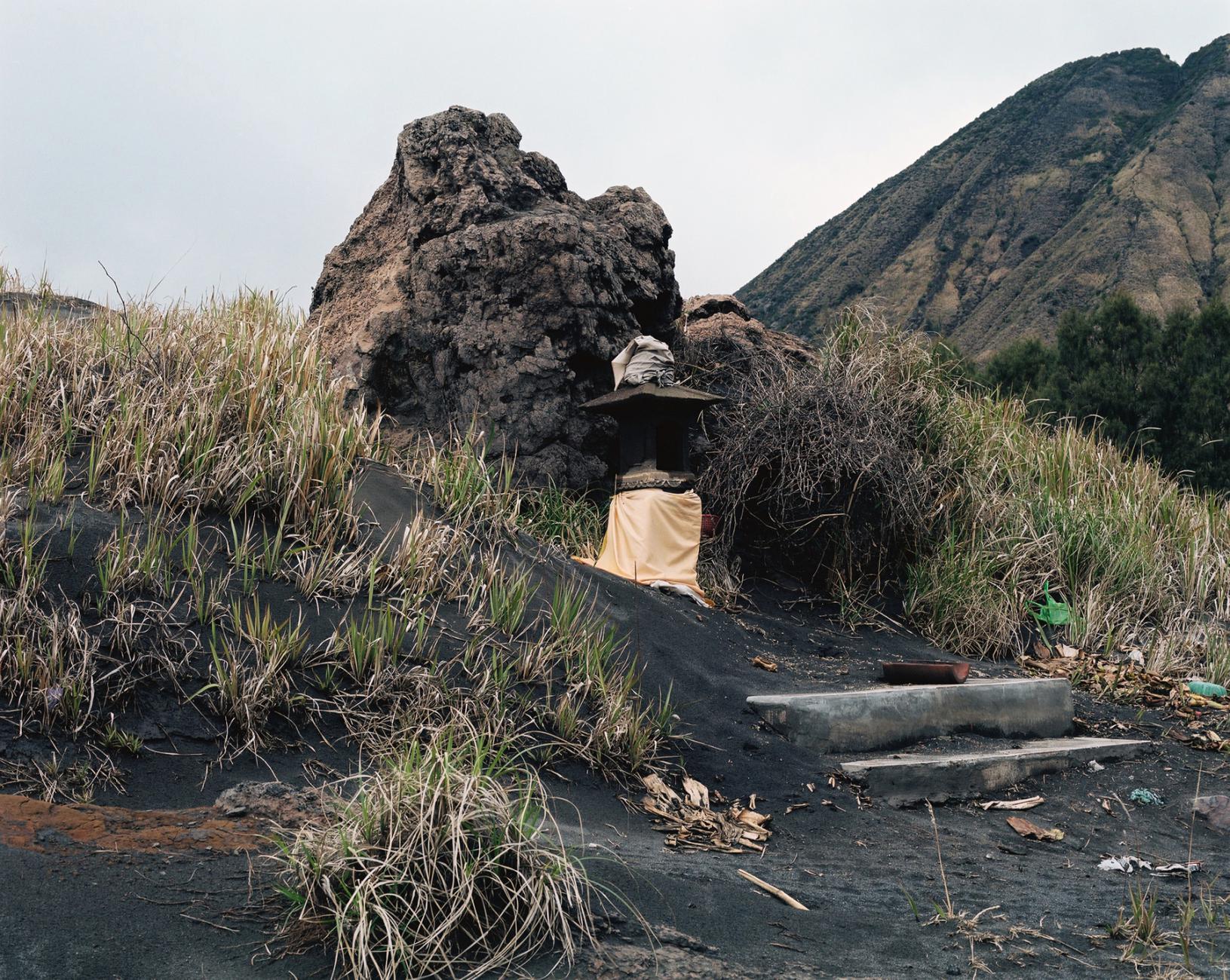 At the base of the volcano, stands the main temple of Luhur Poten, built of black volcanic stone. And around the mountain, in places where the dark rubble has landed following its explosive orbit, smaller shrines and altars have been constructed using the volcanic material. These are tended on a regular basis with offerings of food, fruit and incense. The Tengger follow an old tradition of Siva Buddha, a veneration of the Hindu trinity of Shiva, Brahma and Vishnu fused with ancestral spirit worship and animist beliefs.