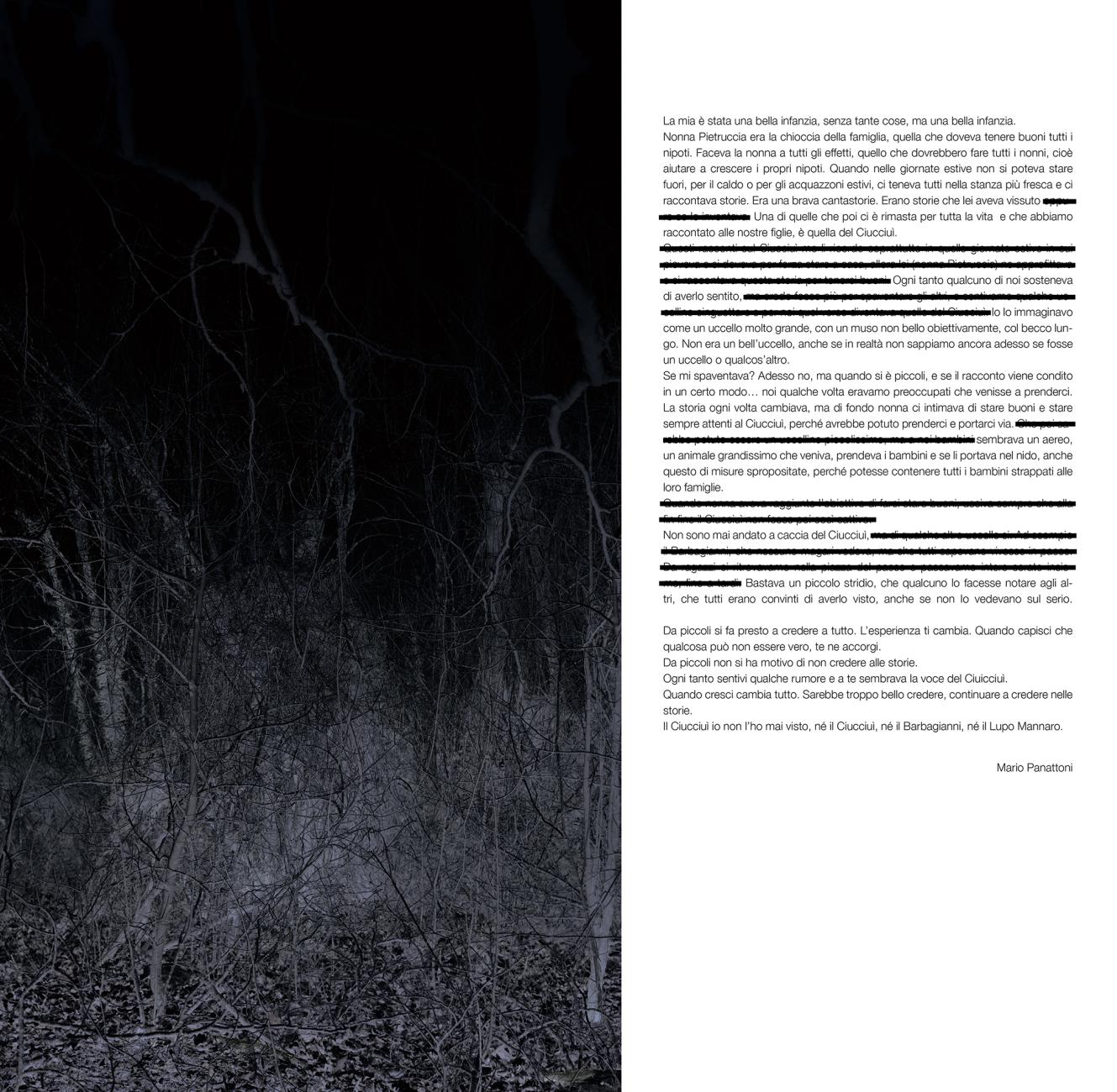 Every child in my family grew up listening to the story of the Ciucciuí, a mysterious creature that the adults used to scare the children to put them to sleep. The stories, ‘cause there are different versions of them, dealt with the Ciucciuí kidnapping the children who weren't in bed at night, taking them to his huge and scary nest, from which they couldn't escape. All of us were absolutely sure we heard his voice, at least once, but none of us could be ever be able of recall how it sounded. None of us had ever seen the creature, it had been living for years in the children's memories in multiple forms, changing its appearance every time through the eyes of one of us. Is it possible to have memories of something you can't surely say it exists? Can you believe that something exists, without having the proof? This work was born out of the need to reconstruct a fragmented memory, in order to create a new one where it doesn't exist, to fulfill a visual and acoustic gap through an improvised use of scientific research instruments and new technologies. Video surveillance, microphotography, infrared, 3d scanning, photographic cataloging of computer-generated evidence, come into contact with the family archive and with sound (generated from the images through software capable of transforming pixels into frequencies), in order to document a hidden reality that no one ever felt the need to prove to be truthful. “Ciucciuí” is a multisensorial investigation that doesn't aim at a specific instance - apart from the awareness that it's not important to find what you're looking for - rather the action of looking itself; one that never stops and continuously changes, together with us and our memory. In “Ciucciuì” not only photography is a tool for the investigation of a hidden reality, but it also has a cathartic role: it can exorcise a childhood fear, by giving form and image to something which was shapeless and obscure and due to that, terrifying.