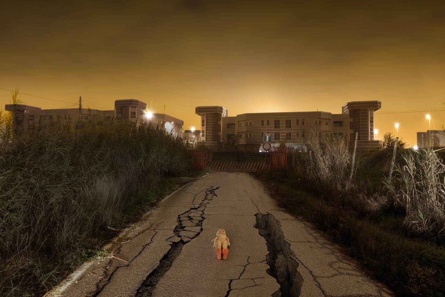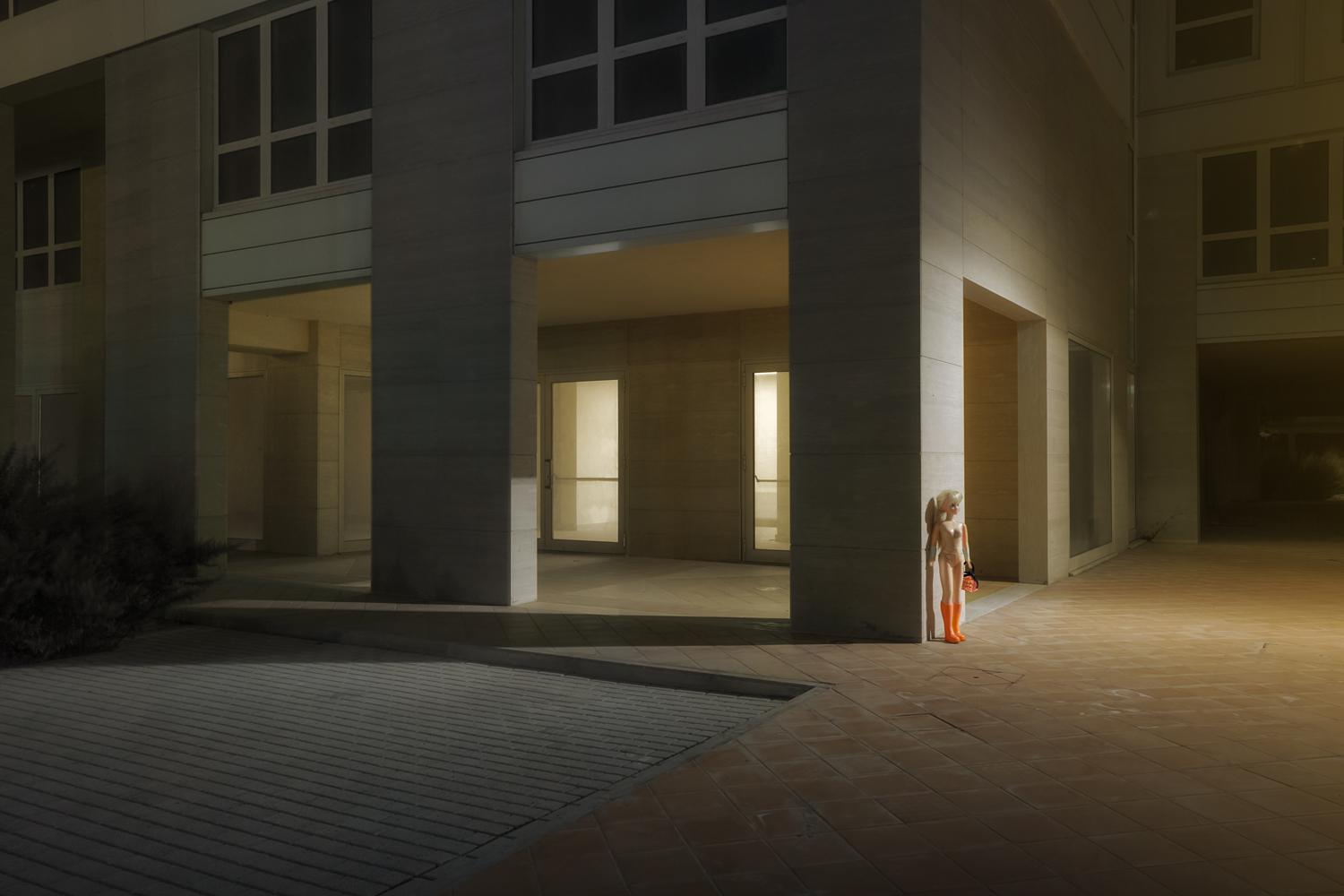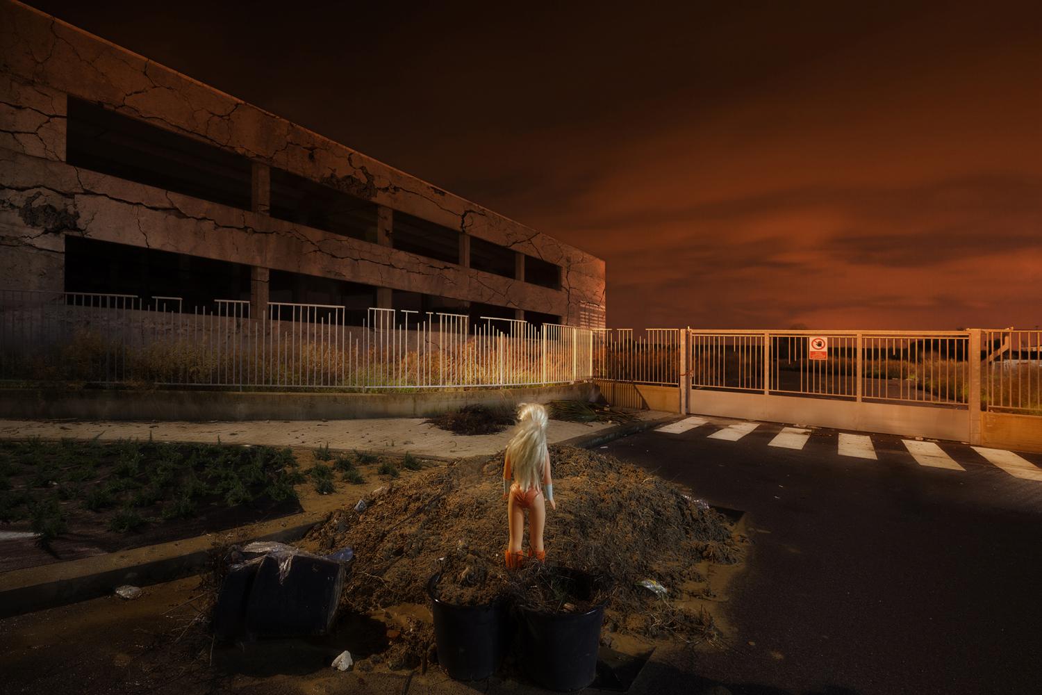 The one represented in "Hello Dolly" is a near future in which humanity is lost and all that remains is a frightening doll. It wanders in an apocalyptic scenario of degradation and cement. The Earth is a pile of empty and abandoned buildings. Dolly is the metaphysical protagonist inspired by the anthropomorphic mannequins of Giorgio De Chirico.