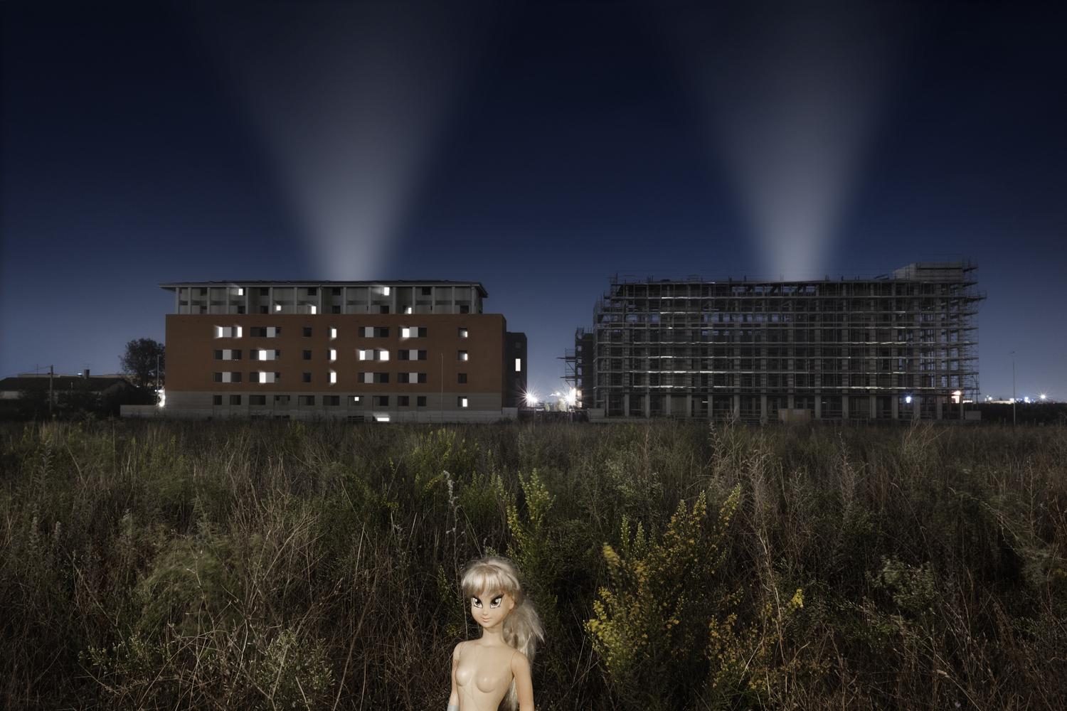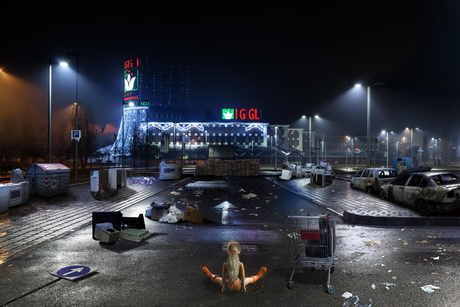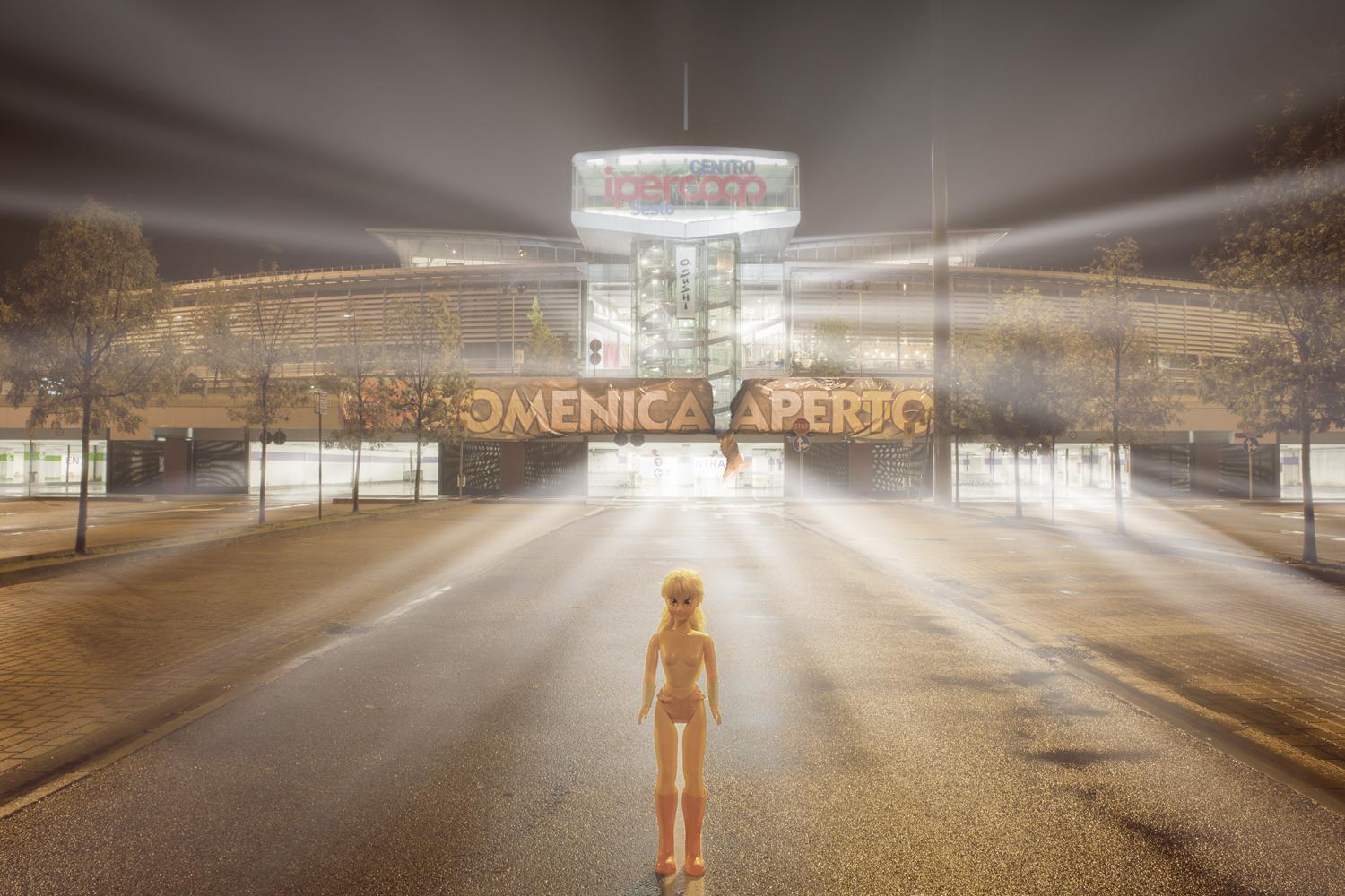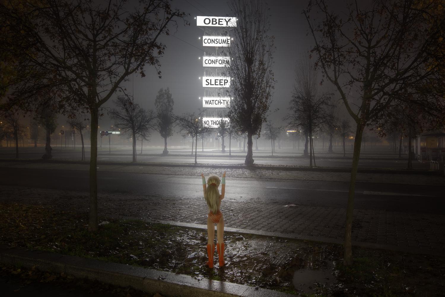Cinematic and literary suggestions are the basis of every image, in which the strong reference to the sci-fi settings of Philip Dick and following dystopian visions stand out. These are the symbols of consumerism. Stripped of their function, they become totems worshiped by an inanimate doll, and showing a cross-section of a future that is inexorably approaching.