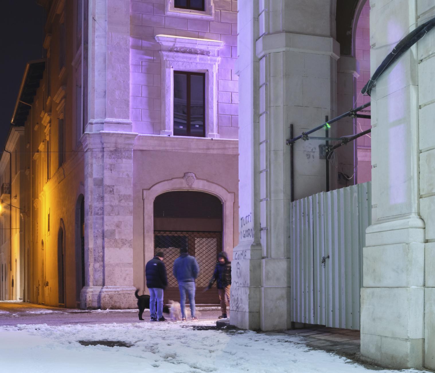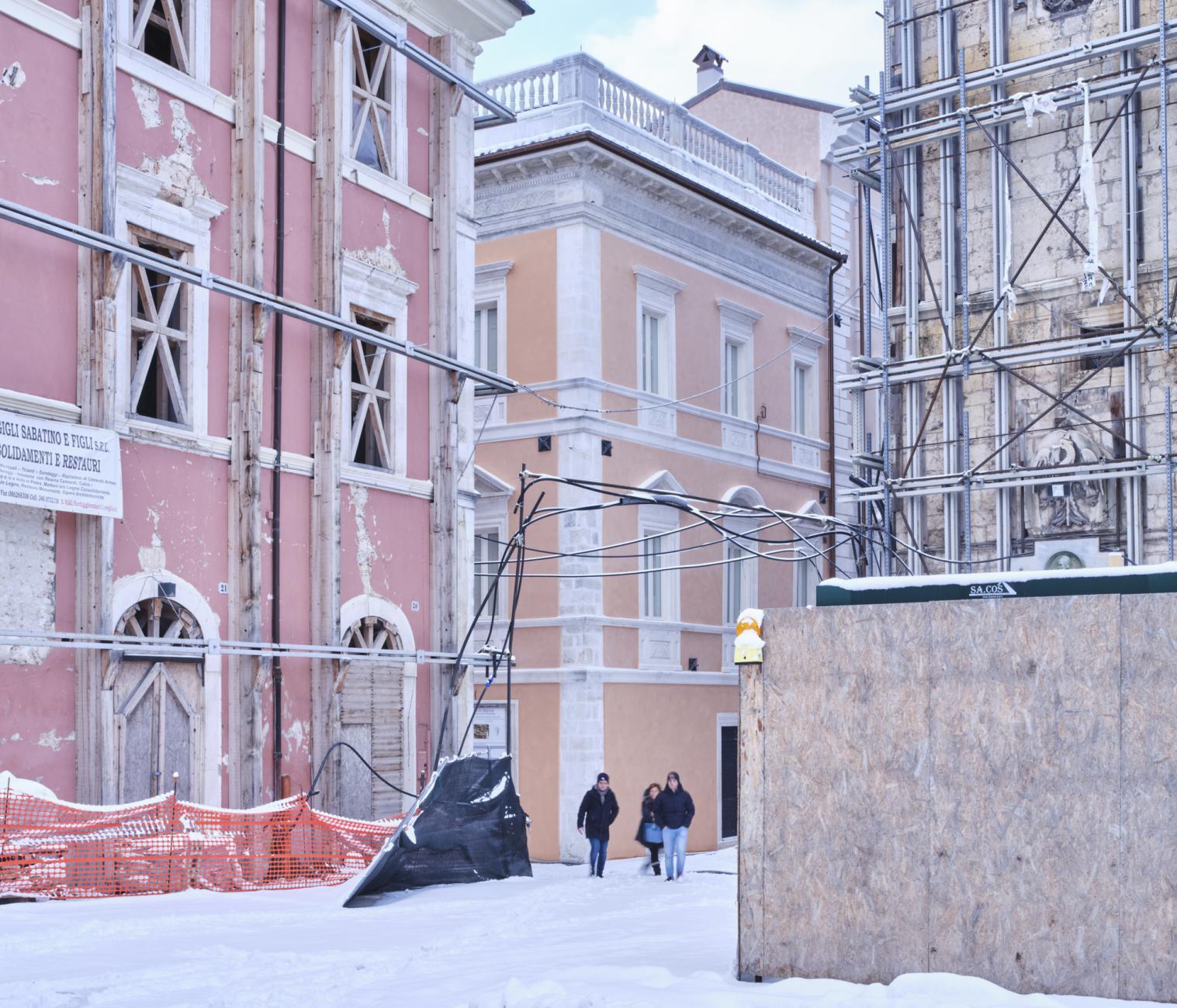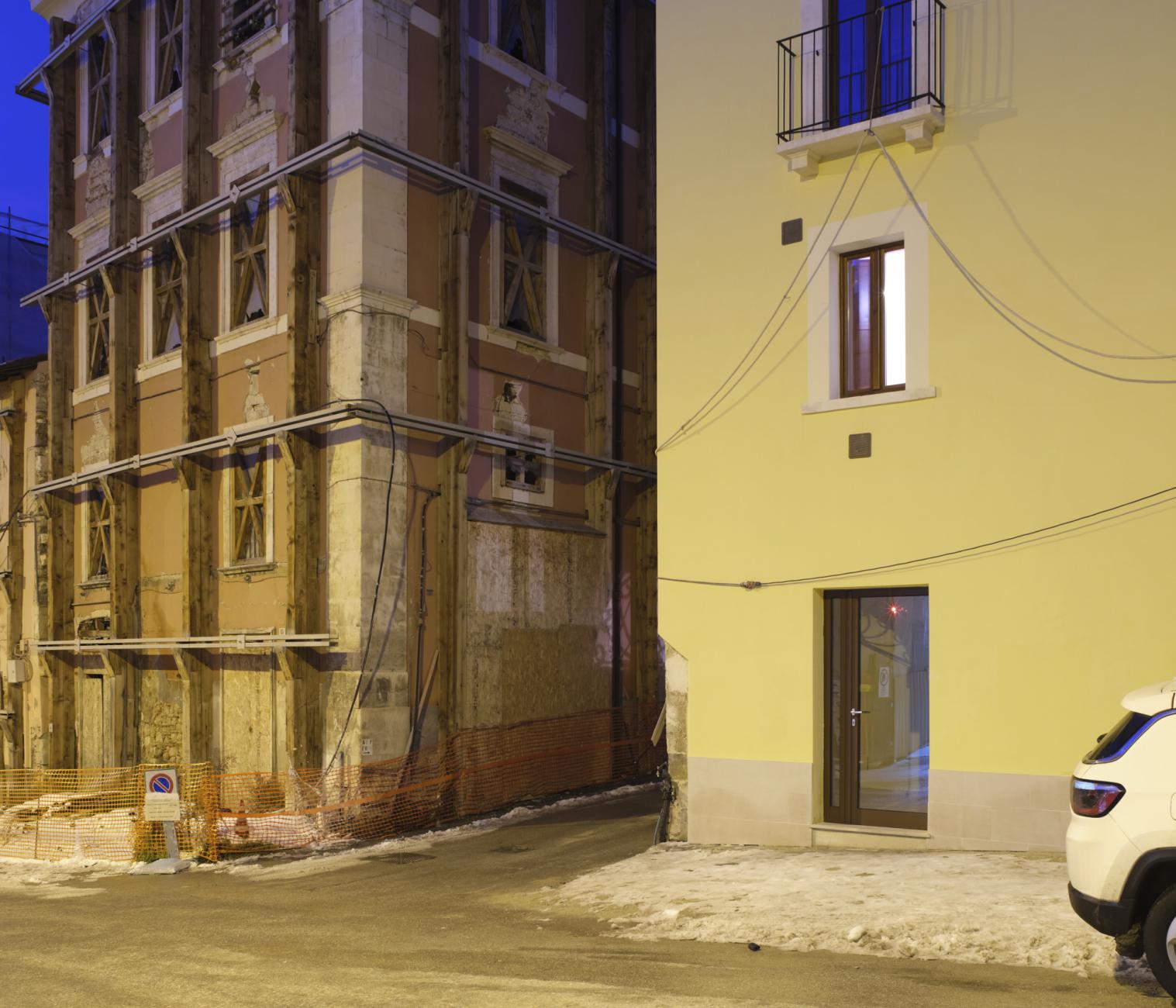 What did L'Aquila become in 2021? The photographs of the series "The shape of the Places" [January 2019 / in progress] explore the current image of L’Aquila as a synthesis of transformations and choices made in the process of (re) construction after the 2009 earthquake. Perhaps it will become a new city, for new citizens, but today - in 2021 - it is a complex place with continuous changes in its form, with changes in social spaces, with lights and voices that slowly begin to alternate with the noises of the construction sites. What can a person find, when he decides to cross the historic centre of L'Aquila for a simple walk? It is difficult to contextualize streets and squares of the city, just as it is often difficult to cross and use them. The redevelopment of places, which for years have been a deposit of materials and objects, is still far from the idea of a public usable space. Historic buildings, harnessed by metal structures, alternate with shining facades, which still have to know the coat of time. With an effort of imagination, it is perhaps possible to visualize the conclusion of the interventions that follow one another discontinuously in time and space.