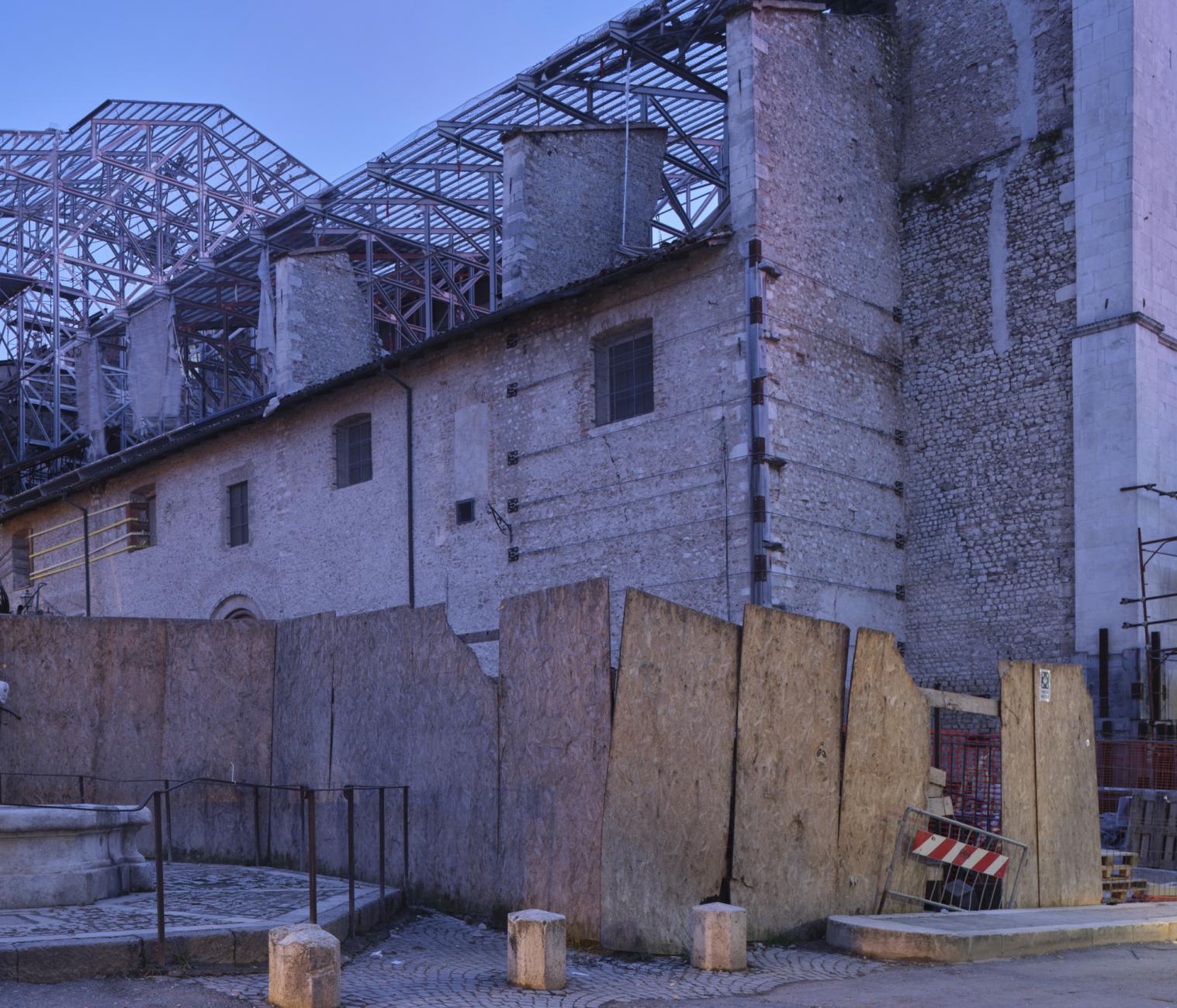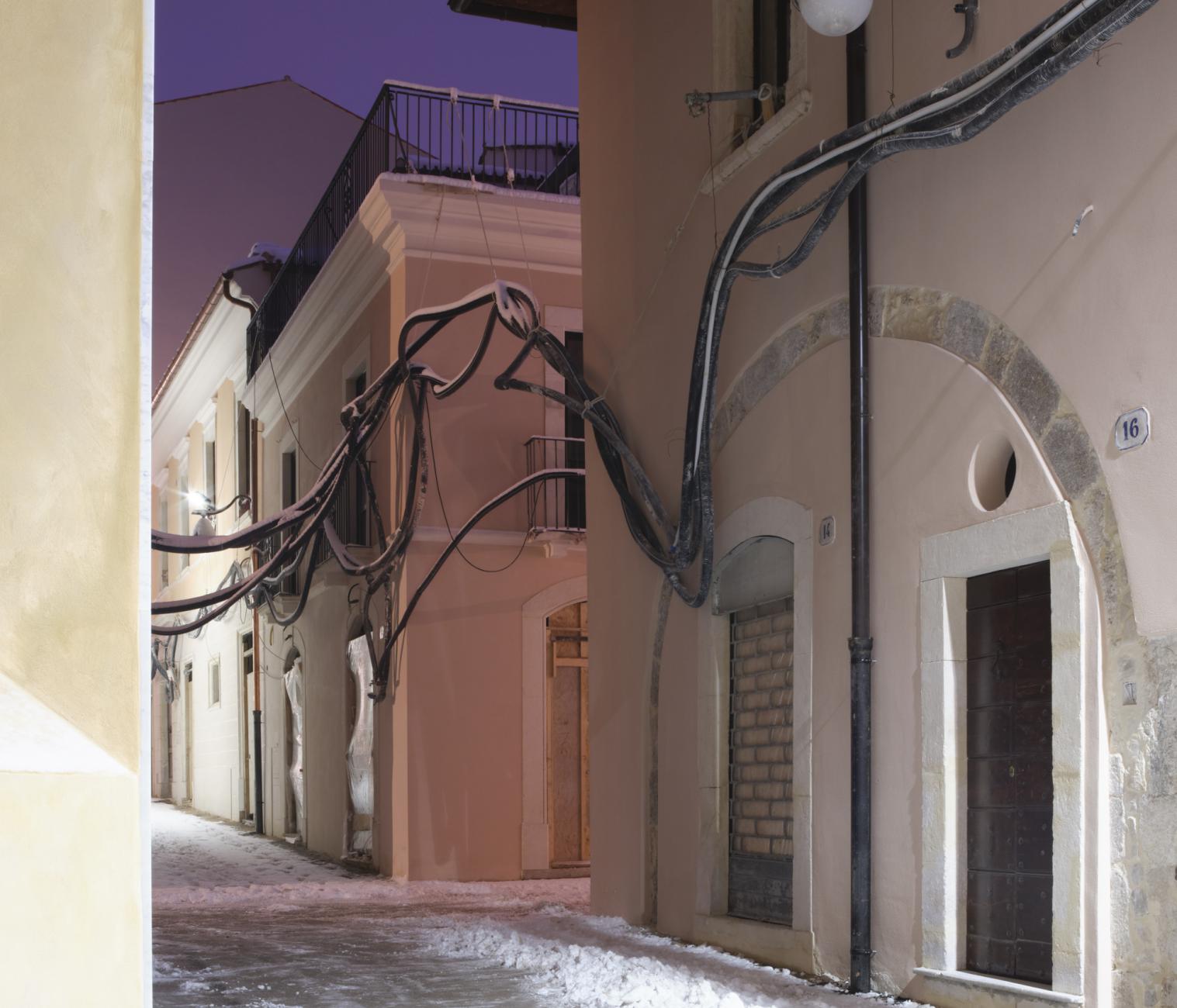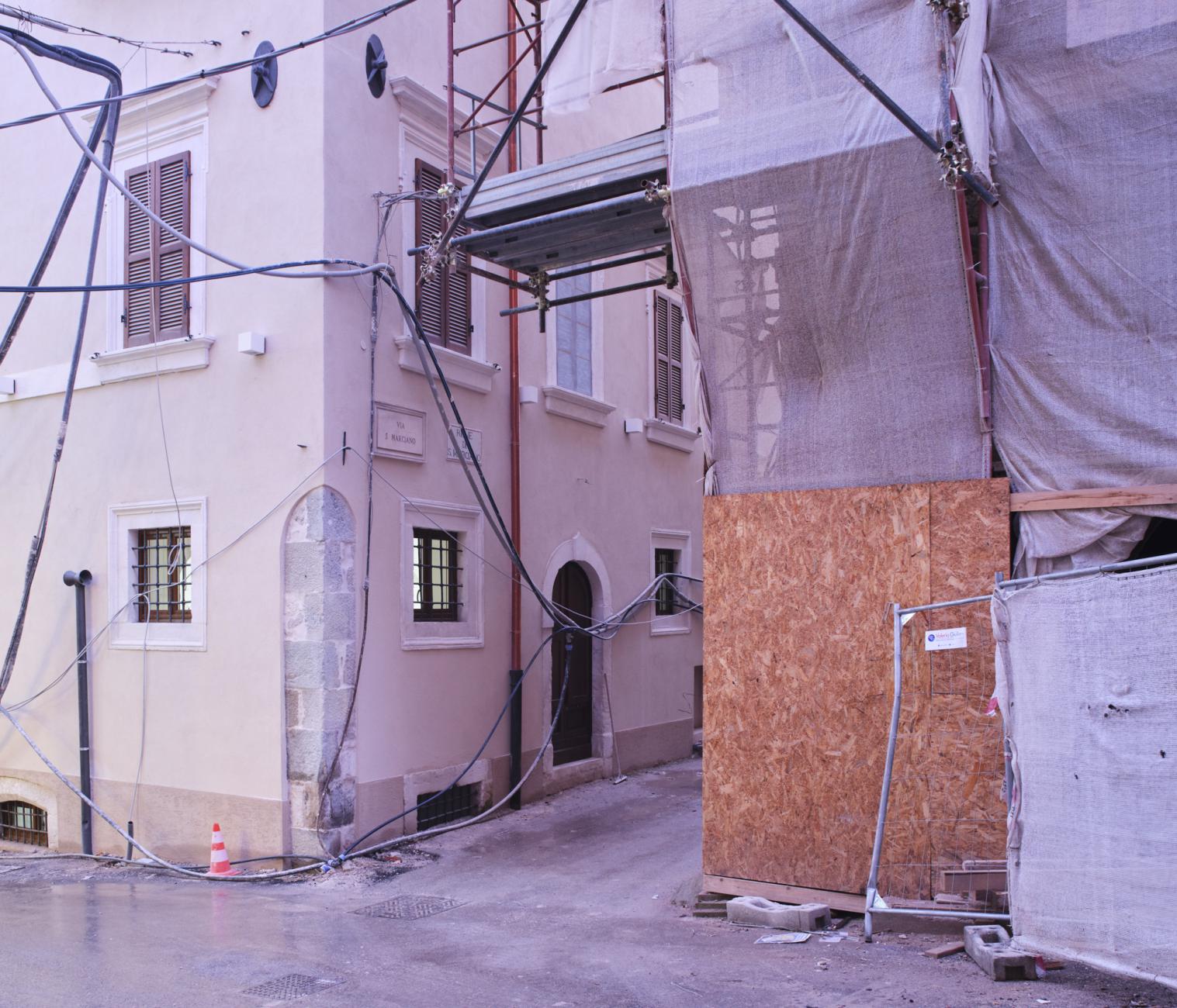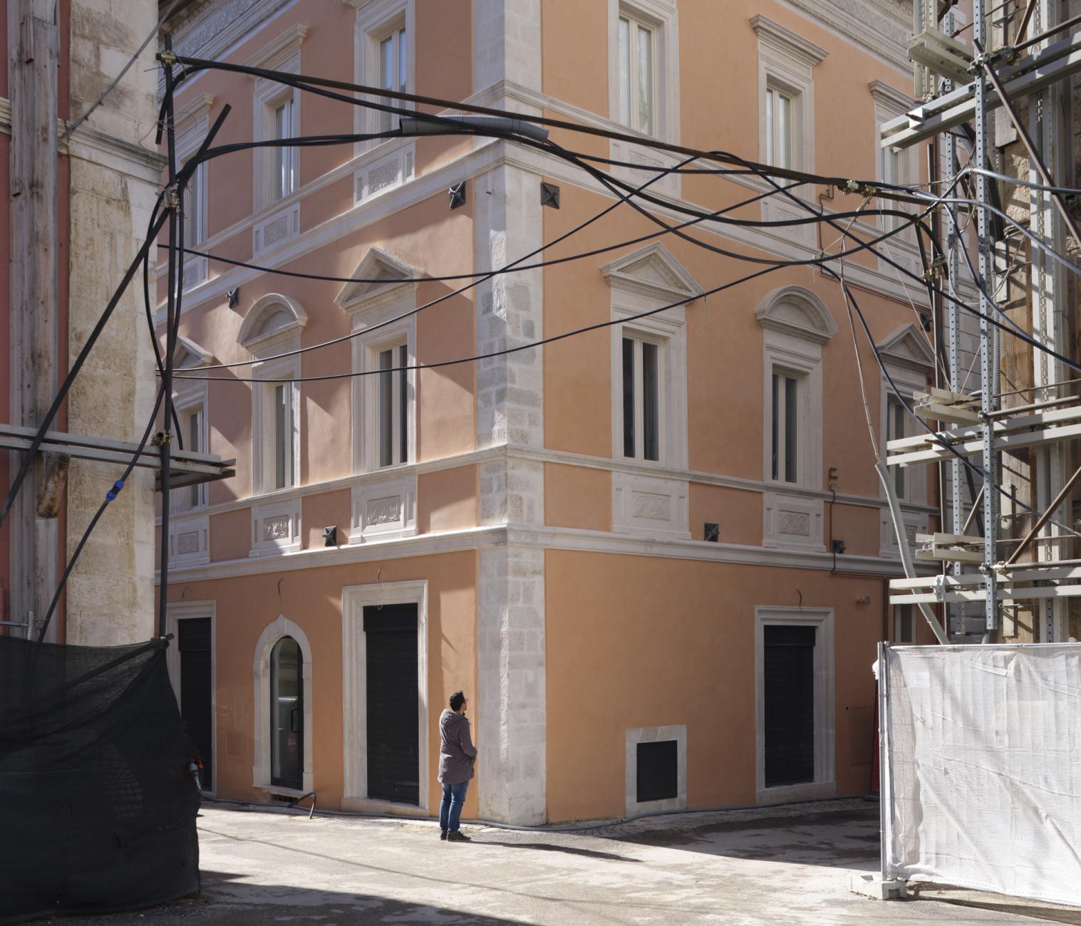 What did L'Aquila become in 2021? The photographs of the series "The shape of the Places" [January 2019 / in progress] explore the current image of L’Aquila as a synthesis of transformations and choices made in the process of (re) construction after the 2009 earthquake. Perhaps it will become a new city, for new citizens, but today - in 2021 - it is a complex place with continuous changes in its form, with changes in social spaces, with lights and voices that slowly begin to alternate with the noises of the construction sites. What can a person find, when he decides to cross the historic centre of L'Aquila for a simple walk? It is difficult to contextualize streets and squares of the city, just as it is often difficult to cross and use them. The redevelopment of places, which for years have been a deposit of materials and objects, is still far from the idea of a public usable space. Historic buildings, harnessed by metal structures, alternate with shining facades, which still have to know the coat of time. With an effort of imagination, it is perhaps possible to visualize the conclusion of the interventions that follow one another discontinuously in time and space.