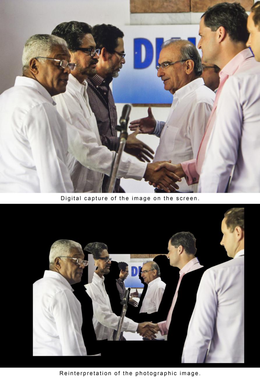 The concept of "educating the gaze" addresses the need of reflection towards the "educational role” of photography in subjugating the population, as a device that guides manipulated readings of reality in favour of the dominant interests. The peace process between the Colombian State —of the former president Juan Manuel Santos Nobel Peace Prize in 2016— and the FARC guerrillas, are the trigger of the analysis presented in this project, to contribute to the discussion on the role of photography nowadays.