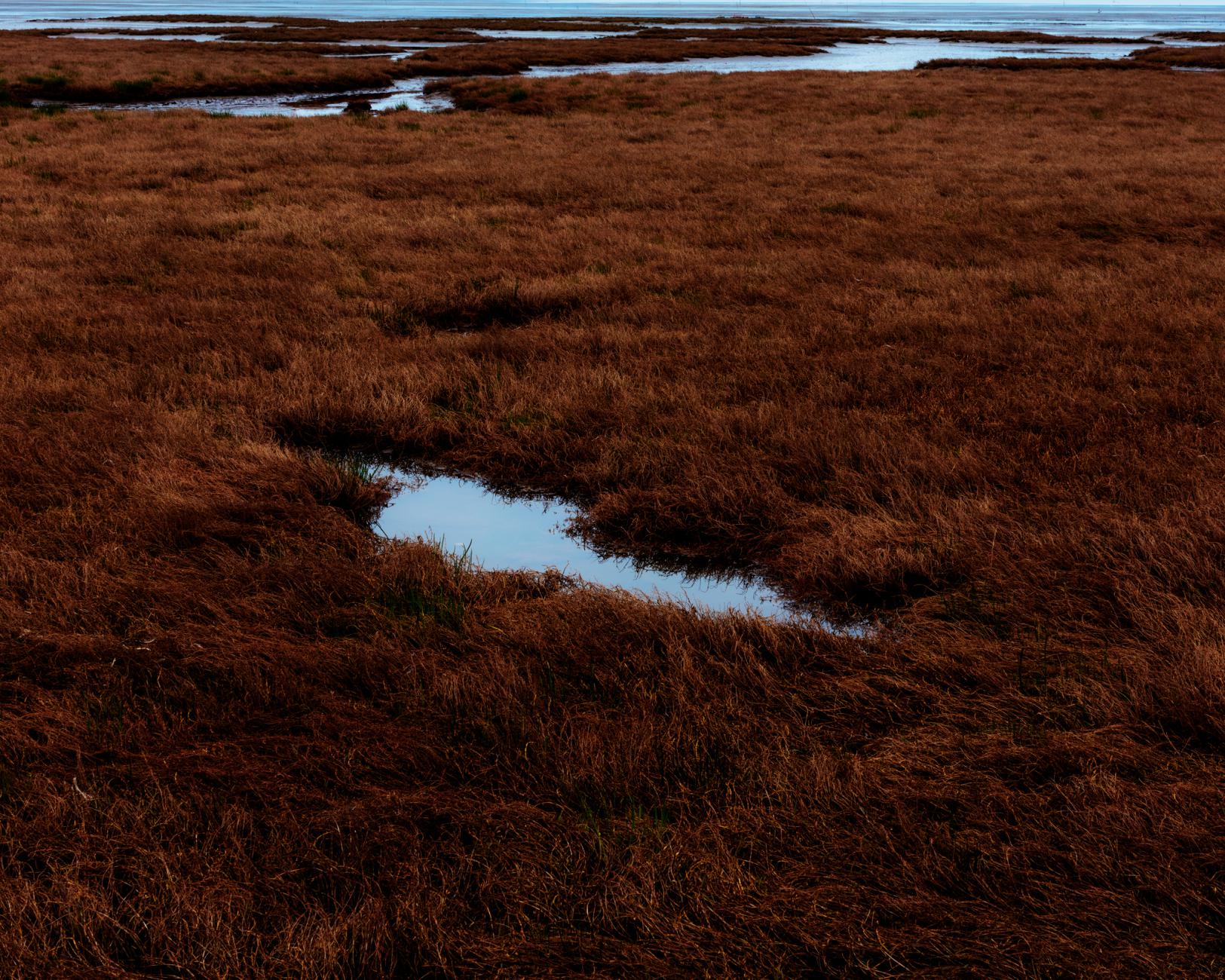 I photographed a salt marsh on the bay and a drain-water creek running into the ocean from the same vantage points near dawn and dusk each day of May 2022. In doing this I observed how shifts of the tide’s cycle met with weather and light as the sun shifted through the month. By directing my attention toward costal ephemera, I aim to soften my anthropocentric perspective and show the landscape as a complex subject which continually reveals itself.
