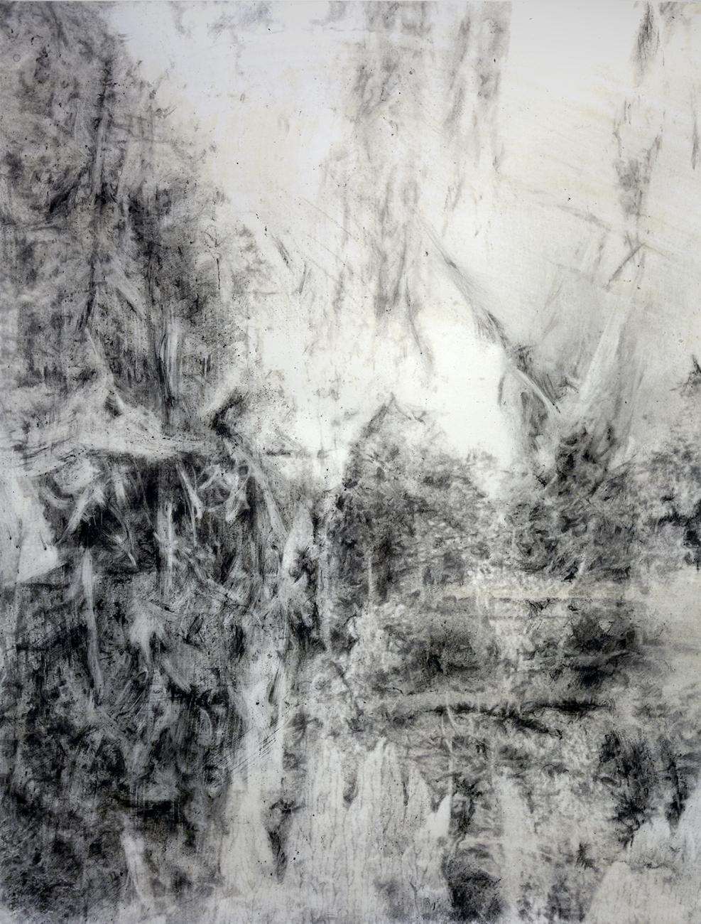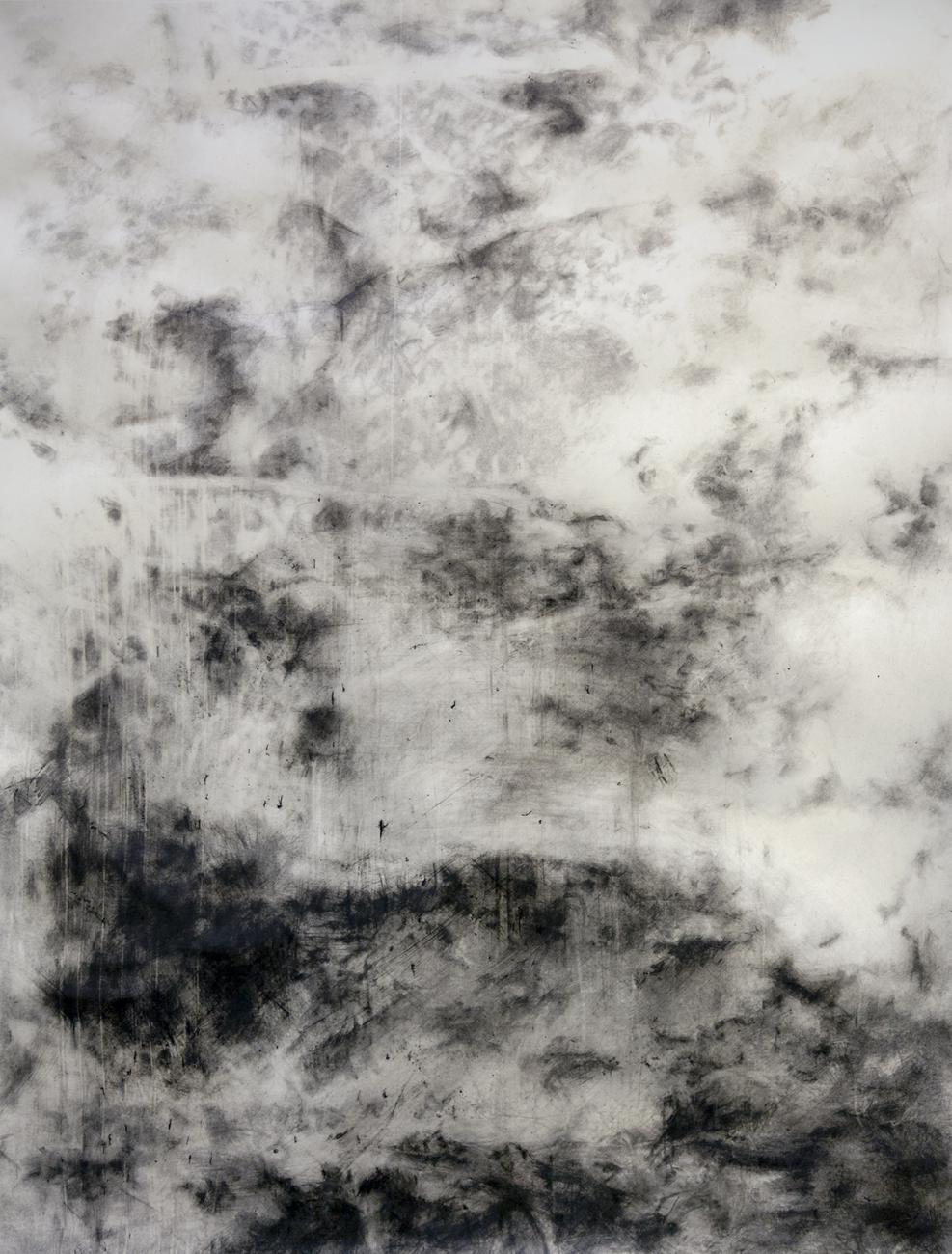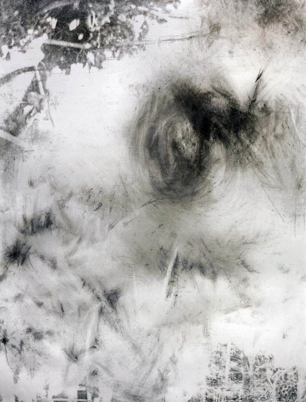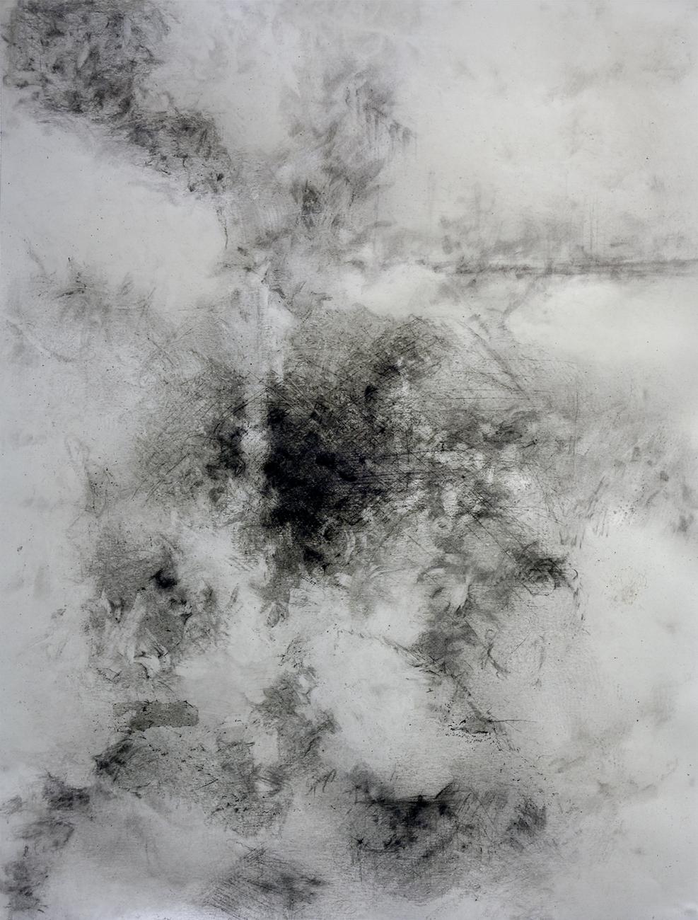 The original photographs are small, direct positive 3x4” Polaroid images that are hand-drawn over in pencil then rephotographed and enlarged, reworked in pencil and rephotographed again. Each step alternates the creation of empty spaces with the filling of them, the expansion through enlargement is stepping closer to and into the image, producing a passage to new territories previously hidden. The result is a large scale rendering of a landscape and a new photographic representation, an inversion of the drawing that creates a correlation where both documents differently interpret the same scene. These artworks leave entirely behind the original 3x4” image source they were born from to produce new highly perceptual images of fluctuating landscapes.
