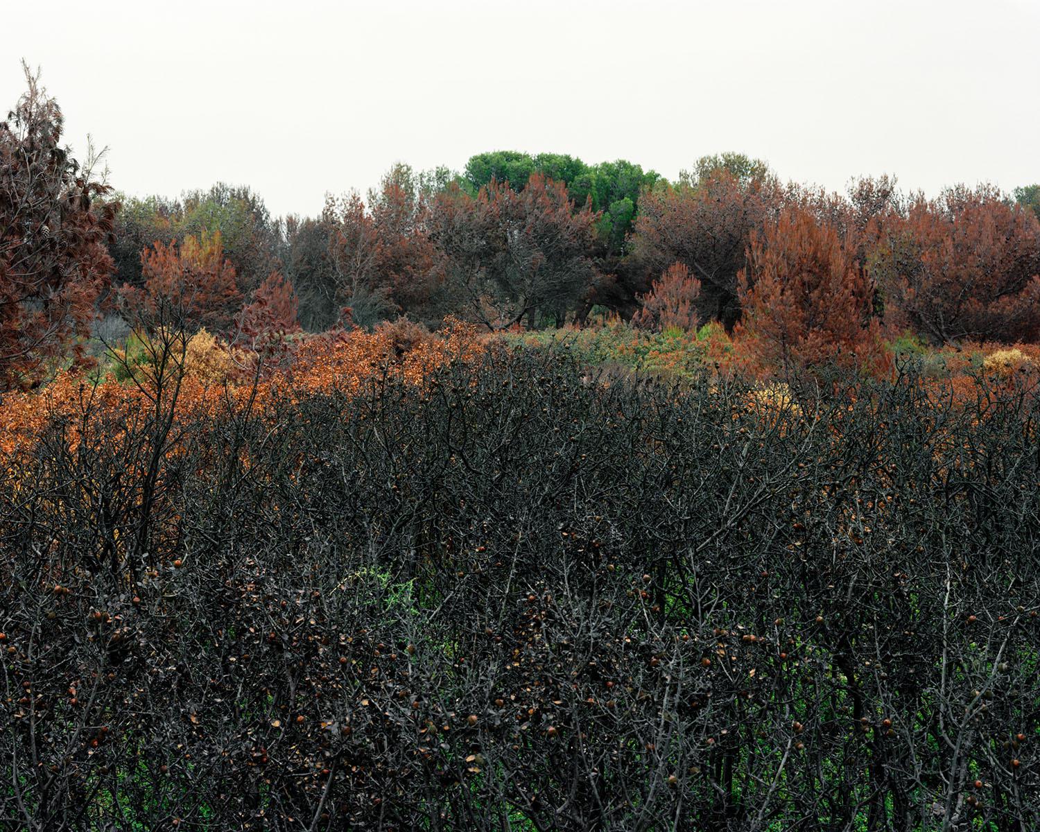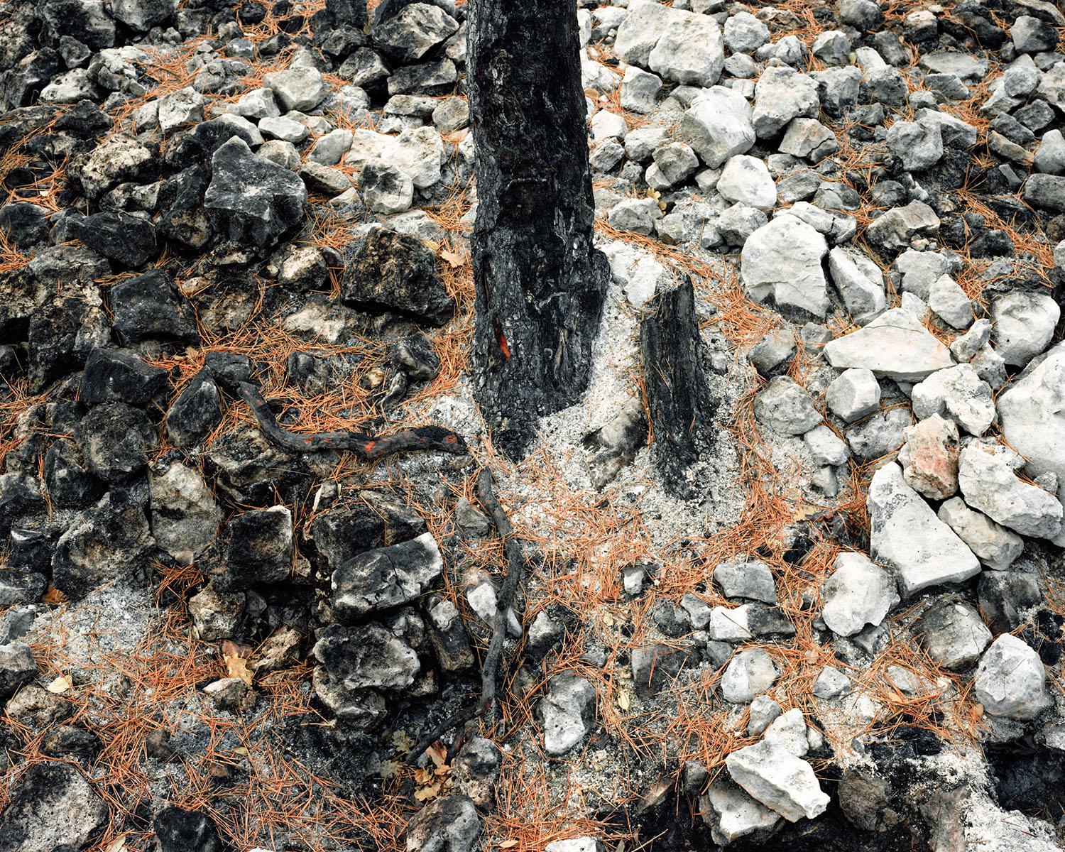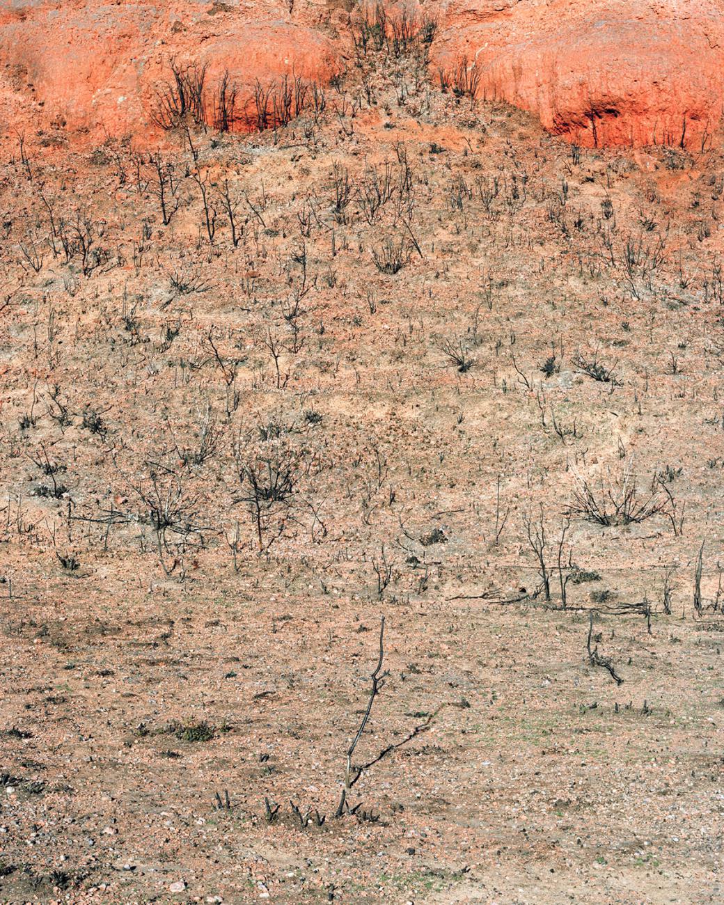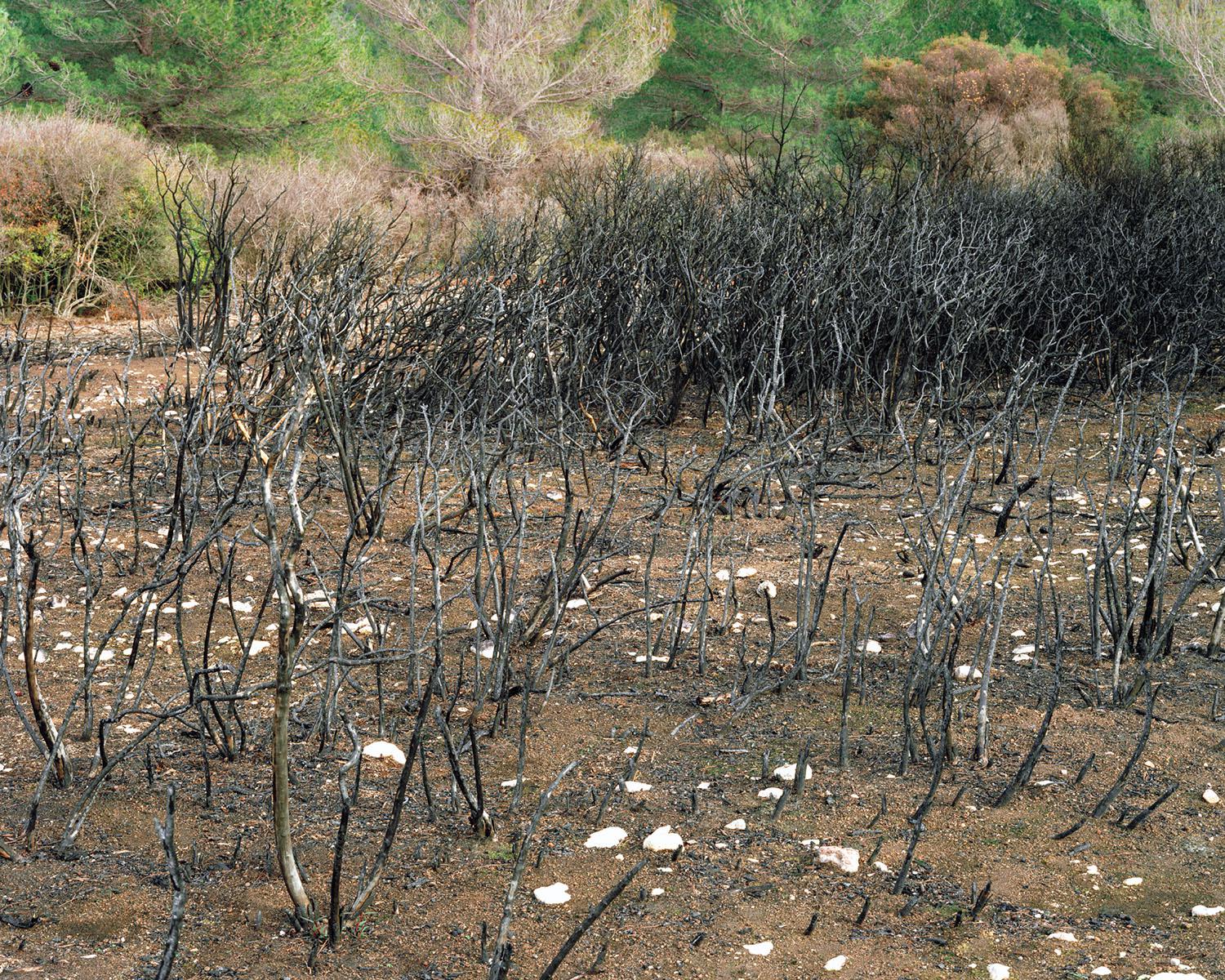 As I was exploring this burnt-out territory with both bewilderment and curiosity, the idea of a photography project took hold. But the initial feeling of wonder baffled me. I went back often to these parts, to see if I could find out why I remained under the spell of such utter desolation. I decided to work with large format 4x5 inch. This process requires a lengthy set up and allows me to deeply focus on each image. At the end of every fire, nature offers up its most violent and shocking landscapes, and yet as a sign of hope, vegetation finds its way back progressively despite the rush of power and the stifling heat. The forest stands its ground, fights back, finally evolving and survives. Is this fascination for blackened territory something to do with it being an example of perseverance and courage, nature’s capacity to adapt in the face of such events should it not push us to understand and take hold of our environment with more care?