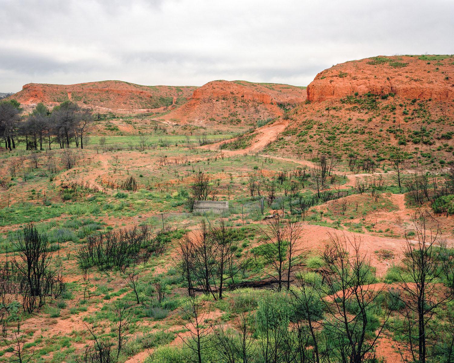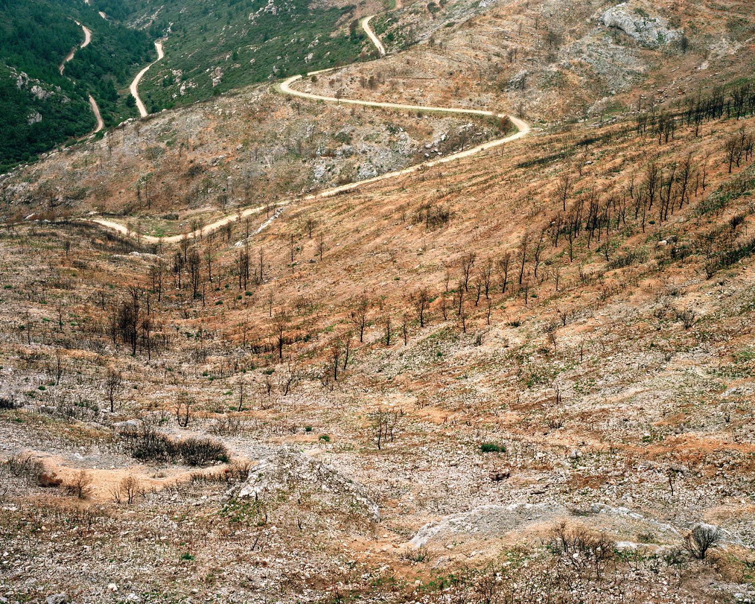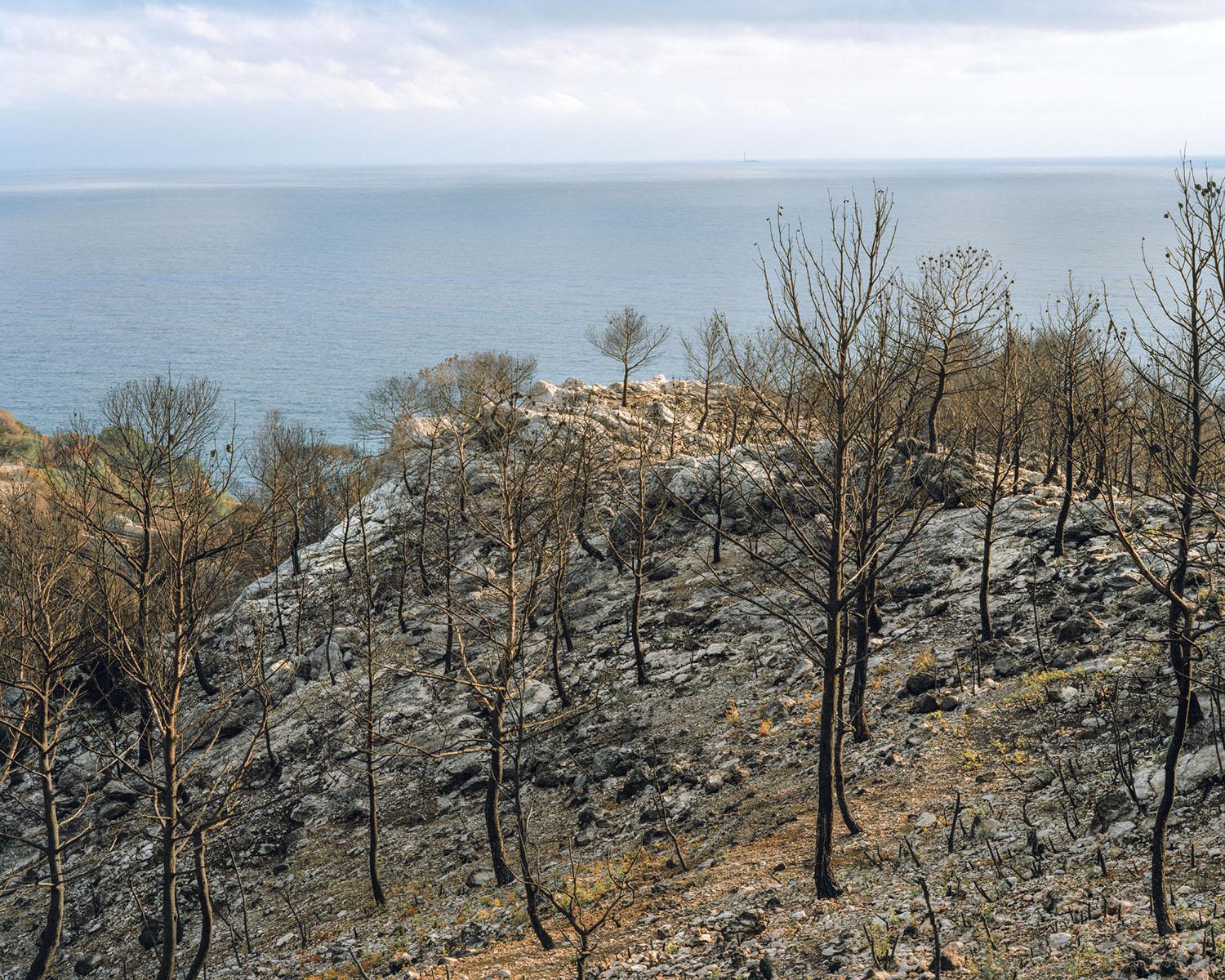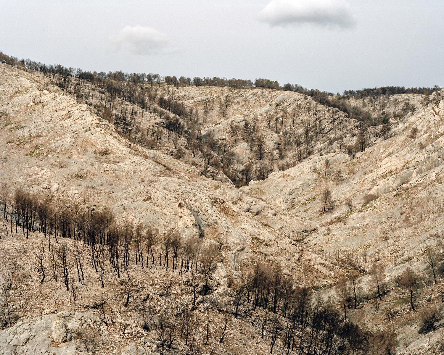 As I was exploring this burnt-out territory with both bewilderment and curiosity, the idea of a photography project took hold. But the initial feeling of wonder baffled me. I went back often to these parts, to see if I could find out why I remained under the spell of such utter desolation. I decided to work with large format 4x5 inch. This process requires a lengthy set up and allows me to deeply focus on each image. At the end of every fire, nature offers up its most violent and shocking landscapes, and yet as a sign of hope, vegetation finds its way back progressively despite the rush of power and the stifling heat. The forest stands its ground, fights back, finally evolving and survives. Is this fascination for blackened territory something to do with it being an example of perseverance and courage, nature’s capacity to adapt in the face of such events should it not push us to understand and take hold of our environment with more care?