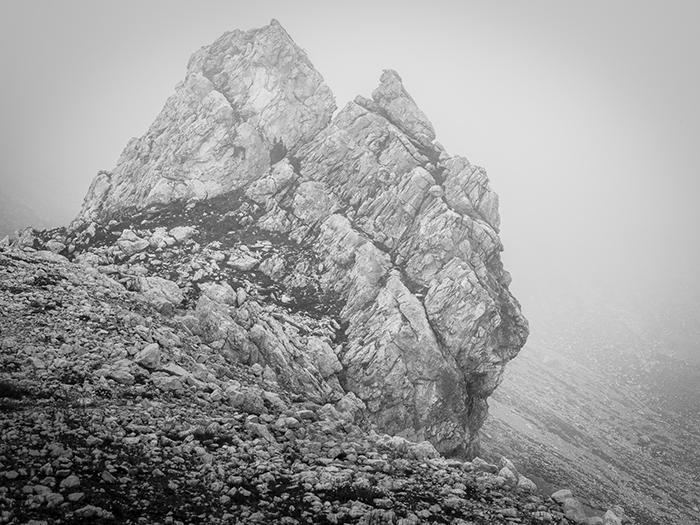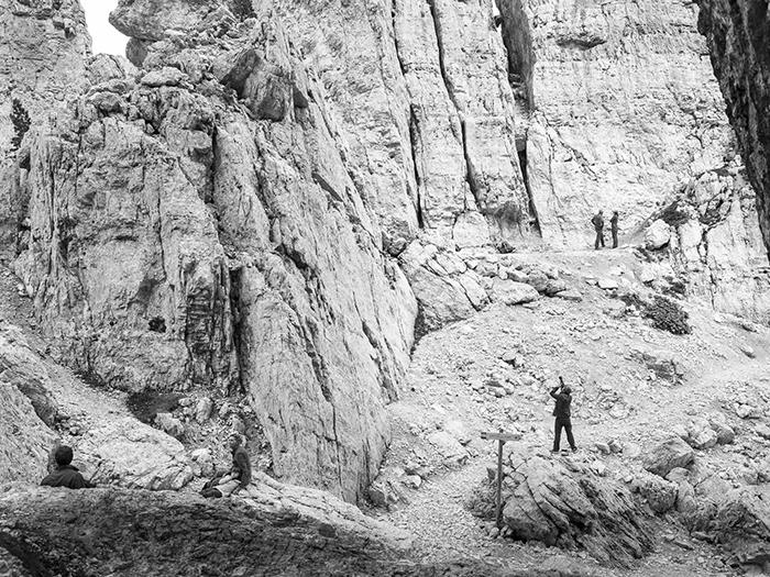 Finally the Dolomites. The story highlights another basic element of the poetic view by Andrea Alessio. The distance or what I would call more philosophically the right measure. It becomes the interpretation necessary to open the project and to explain the relationship with the context. The author looks for an optimal scale to bring the mountain closer to its possible dimensions. Somehow, you perceive the desire to hide any reference from the observer. The message is clear: the mountain does not exist, just what we are able to grasp of it exists. Of course, the façade of the Dolomite peaks is hard, compact and impenetrable. This rock is so much that it seems to us that we may have it between the teeth and chew it. However, sooner or later, the details appear on the surface. A fir challenging the high altitude, a pole driven in the stone, a child climbing on his hands. Suddenly this uniform mass starts slowly to distinguish itself, to reveal its life, as if it were a projection of our same existence. As we gain confidence, it seems to us almost that we may own it. So, it can even happen that we joke by mistaking the face of one of these Dolomites for the profile of Garibaldi, Verdi or Karl Marx. This is of little importance. What is important is the effort taking us there.