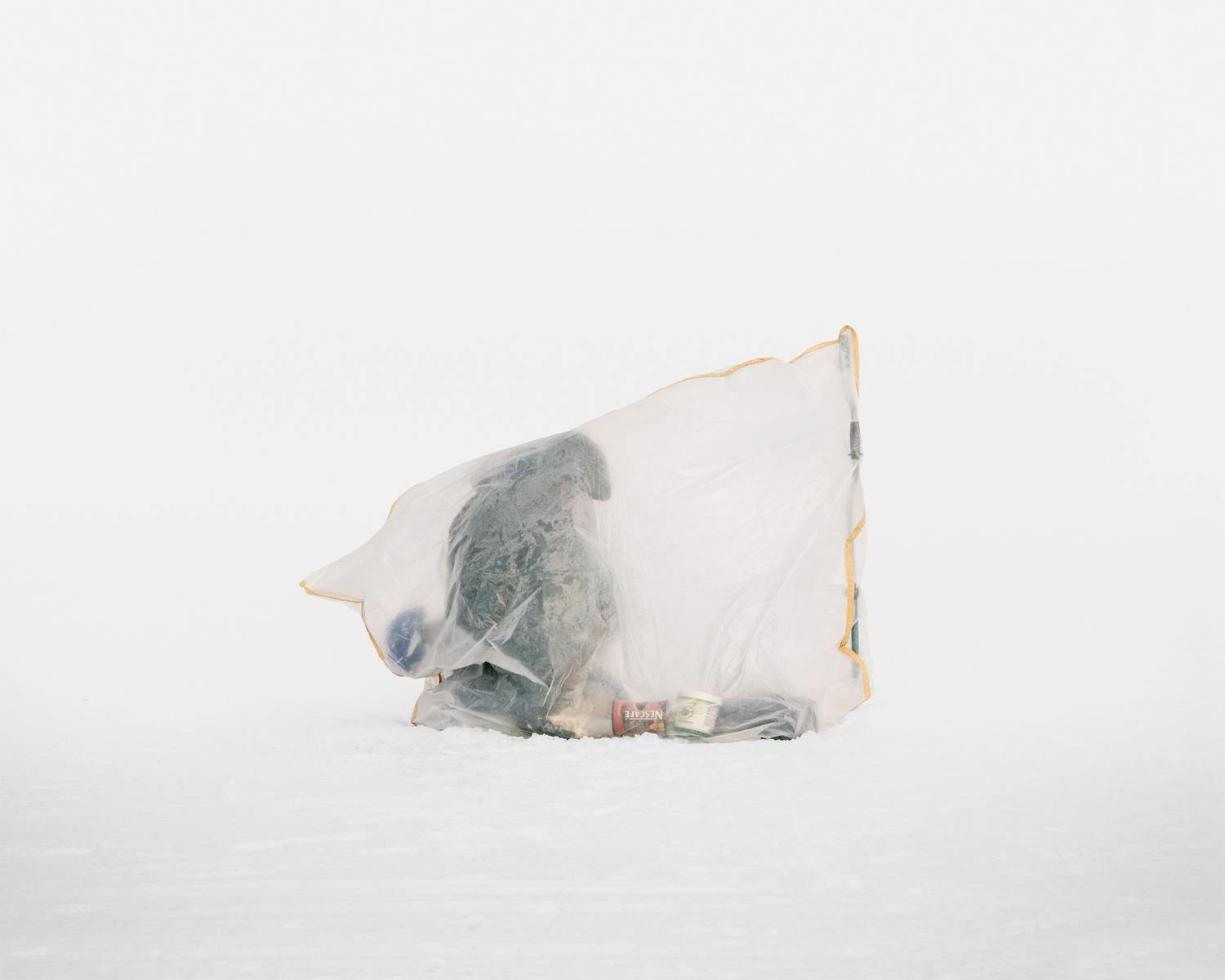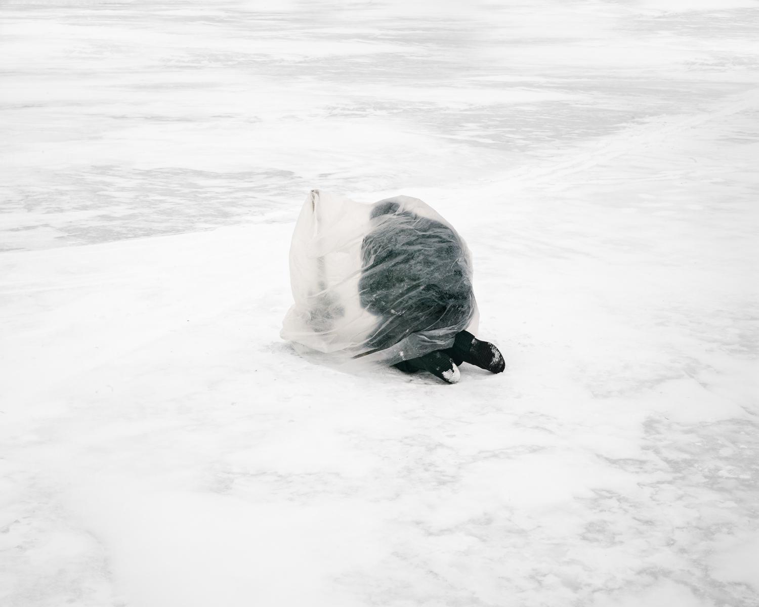 A disillusioned view of the fragile, peripatetic human condition, in constant entropic search, outside of itself, for food and shelter, is revealed through the series Aleksey Kondratyev dedicates to ice fishing in Kazakhstan. In the flat, icy expanses of the Ishim River, anthropomorphic figures brave sub-zero temperatures to deceive a fish or two. An ancestral hunger, primitive subsistence, and a need for survival. Yet, the river today crosses a futuristic capital, built from nothing thanks to the exploitation of oil reserves, access to international markets, and post-Soviet architectural audacity. However, the photographer does not state this directly; he lets us infer it from the plastic tarps and packaging materials from "who knows where," used by the daring fishermen to protect themselves at forty below. Globalized capitalism intersects with snapshots of frozen human cocoons from the Paleolithic era—betrayed only by their tools, their ever-tightening dependence on things.