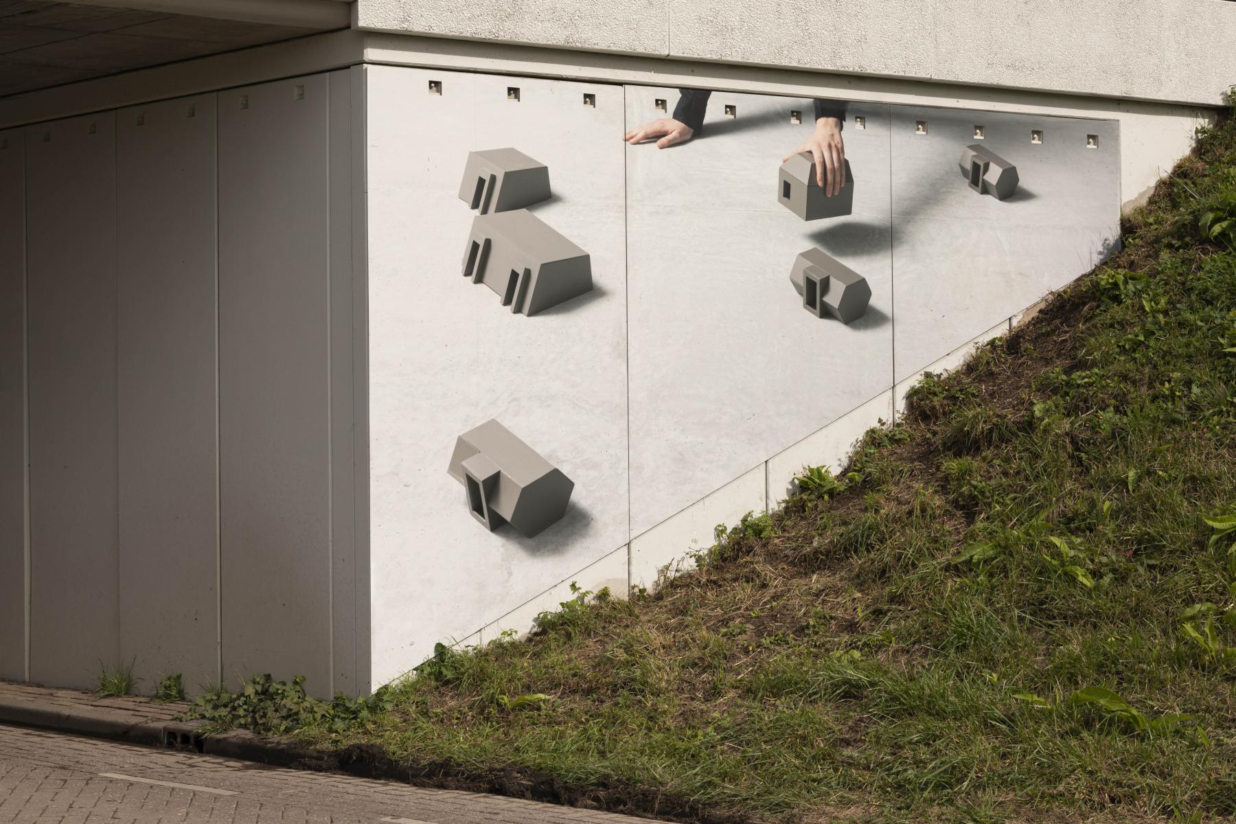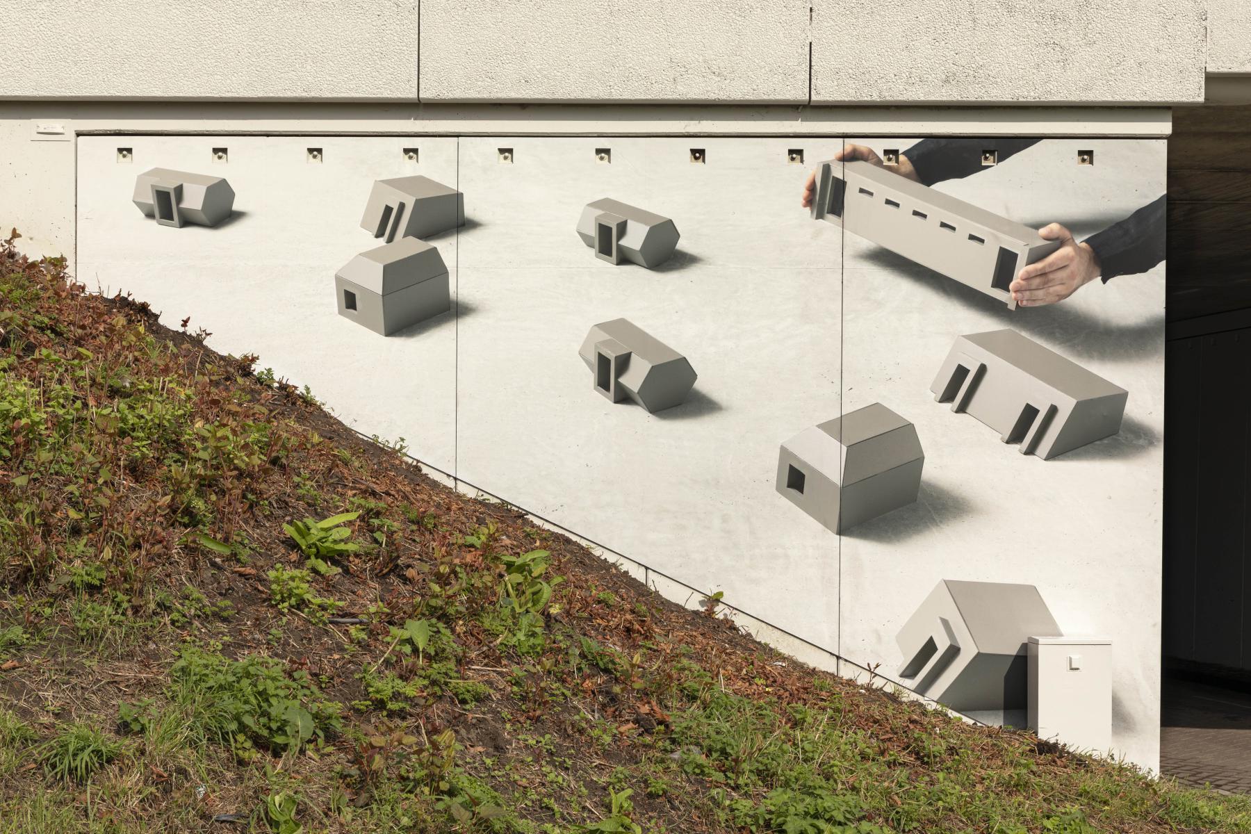 The same goes for the other side of the tunnel for which I have lifted the overgrown, concrete bunkers out of the landscape, abstracted them to then place them back again in this same landscape. The work shows these photographed scale models placed into a constructed landscape by the hands of unknown figures. In the work, that seems playful and in which different scales overlap, I wanted to play with the re-arrangment of these thousands of bunkers that from aerial pictures sometimes literally look like an emptied block box.