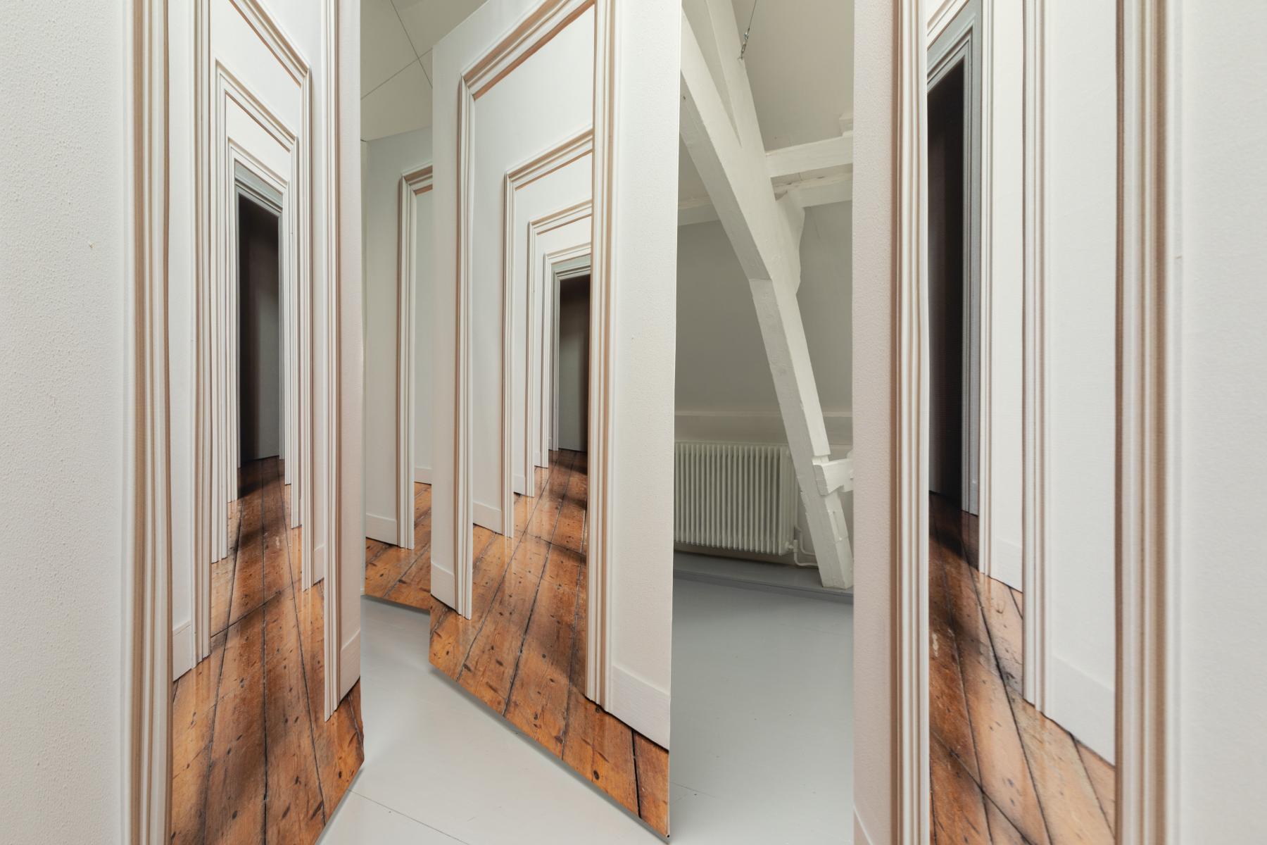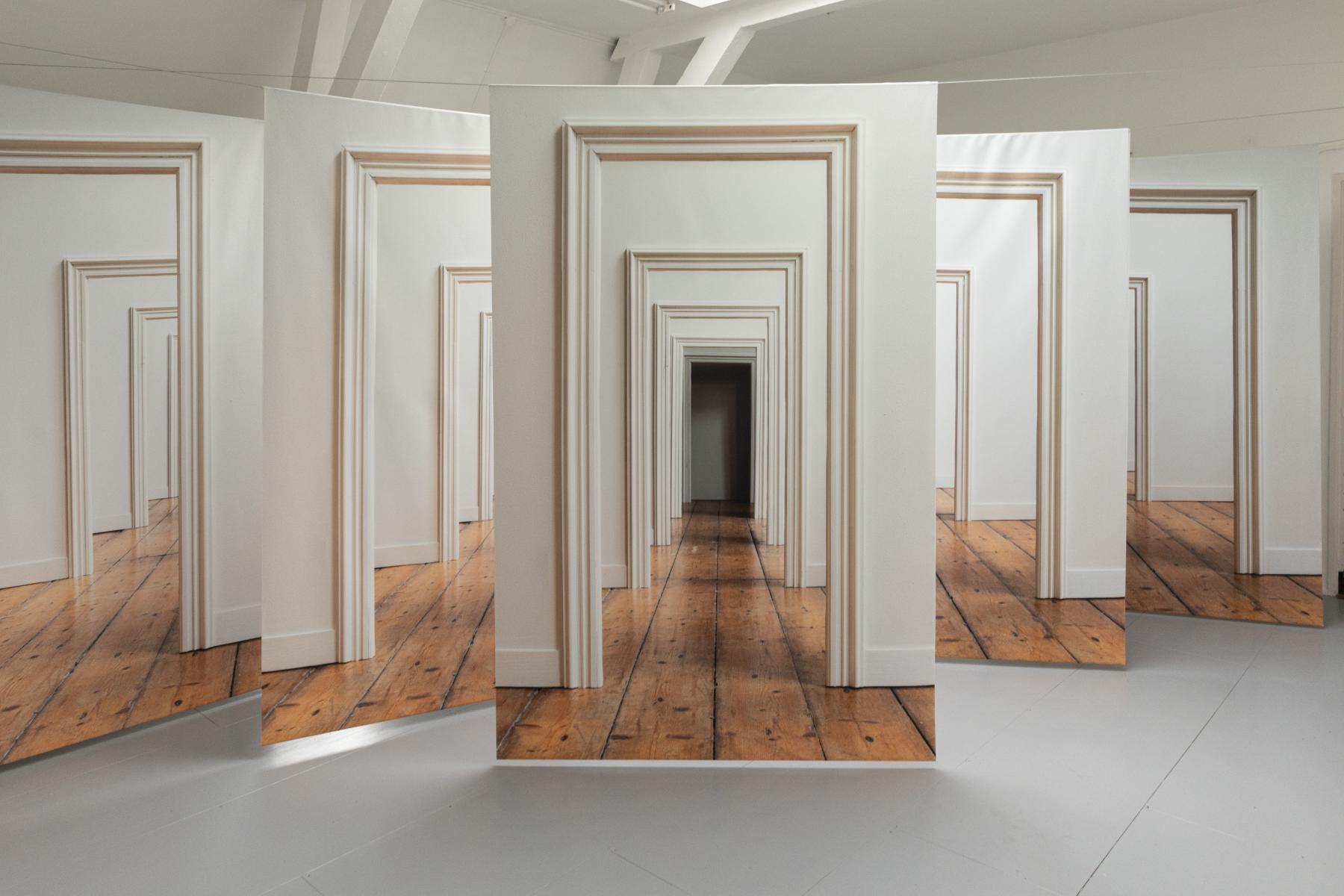 This specific function of the building is something that fell into oblivion. After the school closed and turned into artist studios and exhibition spaces, the row of open doors got out of use. The doors between the office of Casco Art Institute and a neighboring artist studio got closed and turned into a closet space. In Room with doors (1888-2020) I have re-built the five doorposts, photographed these and turned them into life-size photographic textile prints. In this way, the visitors wander through this panoptical-like labyrinth of doorways.