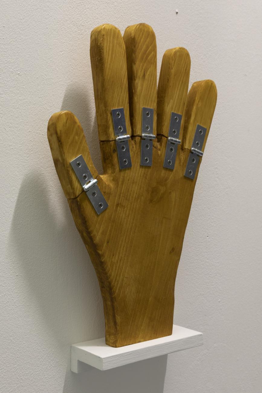 BL: In This Creaking Floor and All the Ceilings Below I have tried to approach the whole upper floor of the building as one large scenography in itself. The exhibition compasses five large installations that each tell a story of their own, but the sequence of spaces is also very important in the exhibition. Within the exhibition, I use a wooden sculpture as a narrator through this scenography. Each installation is accompanied by a ‘Counting Hand’ that leads the visitor through the spaces. I derived this ‘counting hand’ from an eponymous tool in the history of Dutch education, that was used for children that had difficulties with their maths. Thanks to the joints in the fingers, they were able to solve simple calculations, as a sort of primitive calculator.