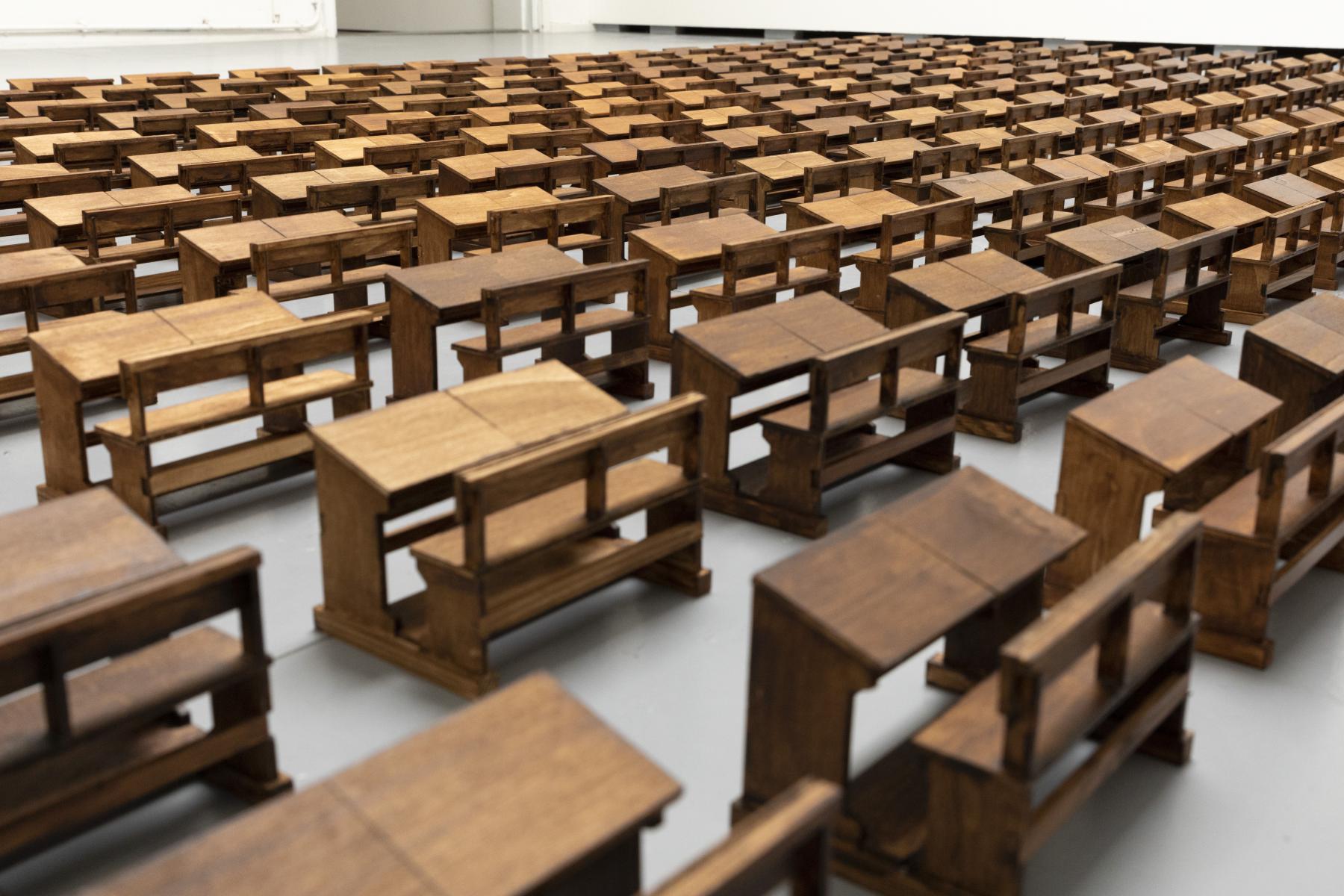 It is also interesting to consider that this spatial design in the exhibition originates from the original design plans of the school. The installation Room with doors (1888-2020) dives into this design. In the school building, there were no hallways. The former classrooms of the school building were connected through a line of open doors, making each room interlinked and accessible to a clergyman who “sees through” the building and monitors all movements of pupils from one point of view. It was not possible to enter or leave the school unnoticed. Influencing behaviour through the idea of being watched, the architecture of this “hallway- panopticon” is an educational system in itself. It teaches students how to conduct themselves in response to this all-pervading observation.