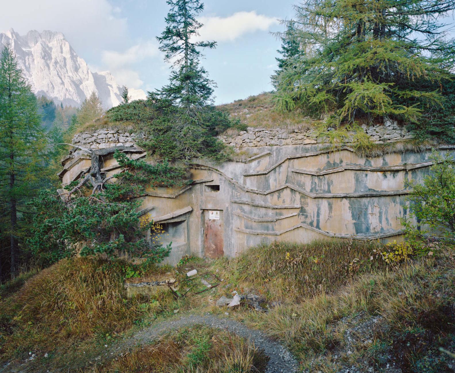 Pagliuca’s photographs speak to us of casematte—structures that suggest a false domesticity, buildings that resemble houses but are, in truth, something else entirely. These cement volumes, embedded in forests and mountain slopes, appear as deranged dwellings: geometric ruins, austere, simplified, weathered by time and camouflage. Their mimicry clashes with, yet somehow heightens, their original function, revealing a paranoid desire for control and invisibility.