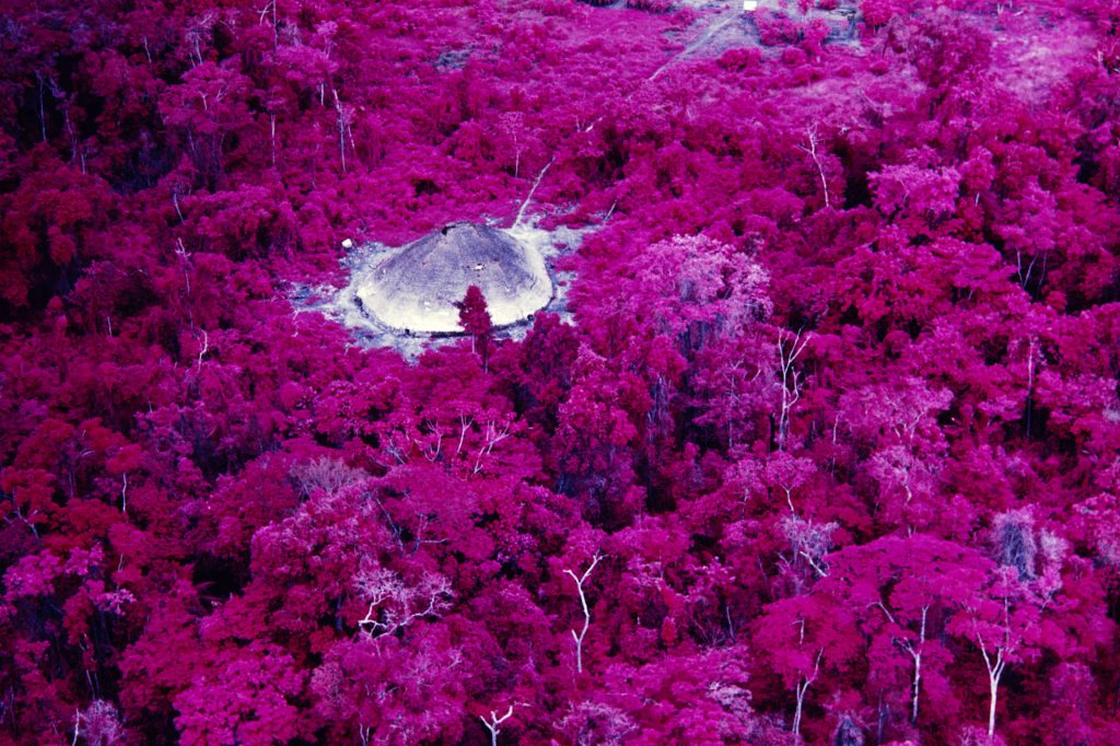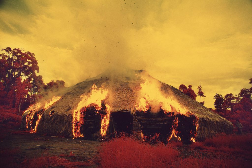 Yanomami can set fire to malocas when they migrate, want to get rid of a plague, or when an important leader dies. Infrared film, Catrimani, Roraima, 1976. Photo © Claudia Andujar