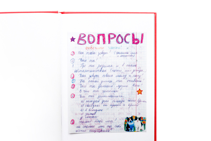 Perhaps this also prompted her to make a book about it. «I wanted to bring the person who gets to know the community through my photographs closer to what Aloe is and transform my thoughts into a more understandable form». Certainly, the book allows for a more intimate experience, a «slower process then immersion through the social networks». No compulsive scrolling but slow, deep and careful leafing. A book that comes, not by chance, with a lot of handcrafted elements. «In my childhood, there were many material things, for example, questionnaires for friends like the one in the Aloe book. We used to print photos and put them into albums. I still make albums for my loved ones. We used to decorate albums and questionnaires with stickers, different inserts, paint with them colored pens. It seemed to me interesting to use the same form for this story, to show it as a book in which one could feel this greeting from the past.»