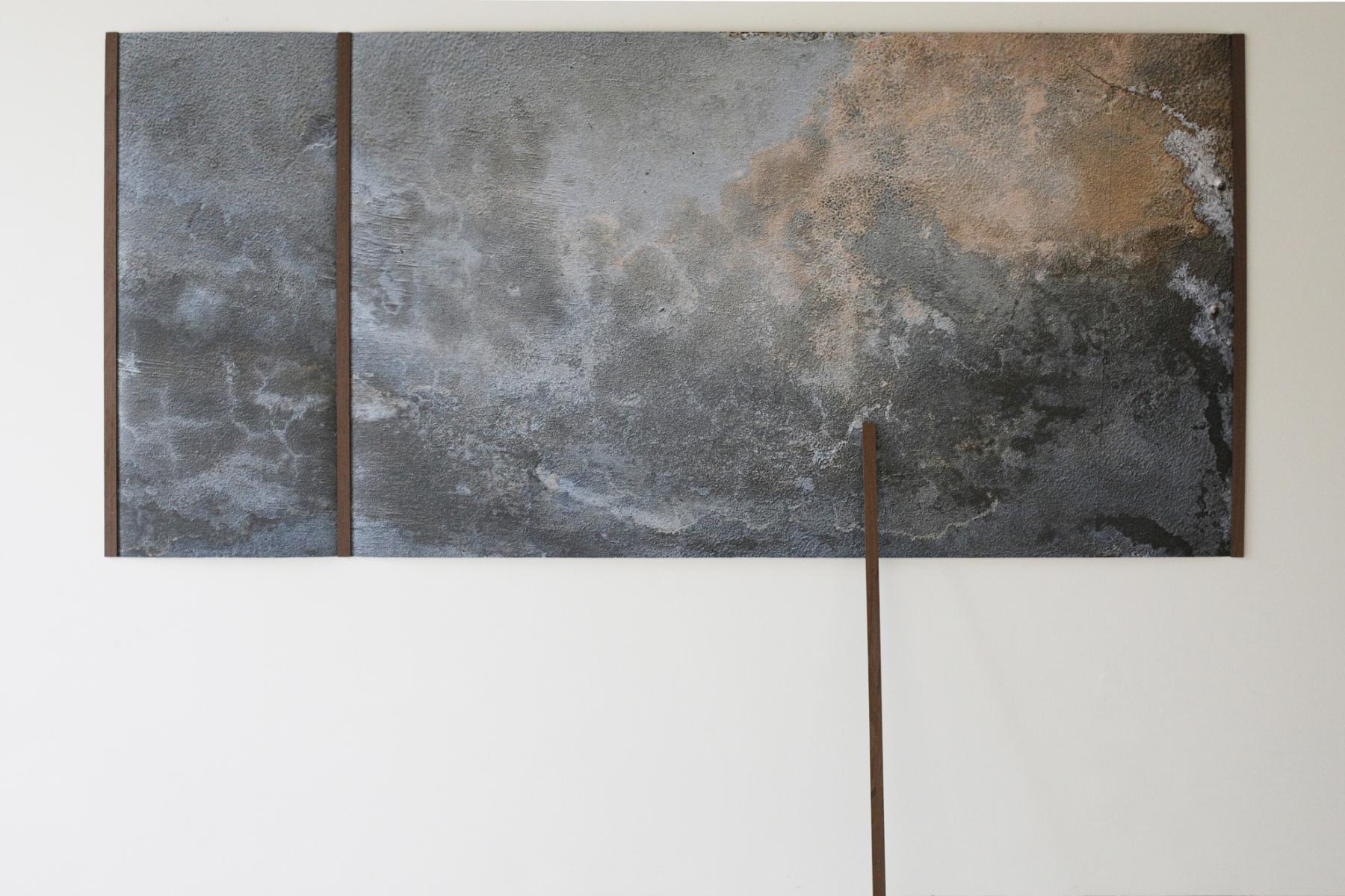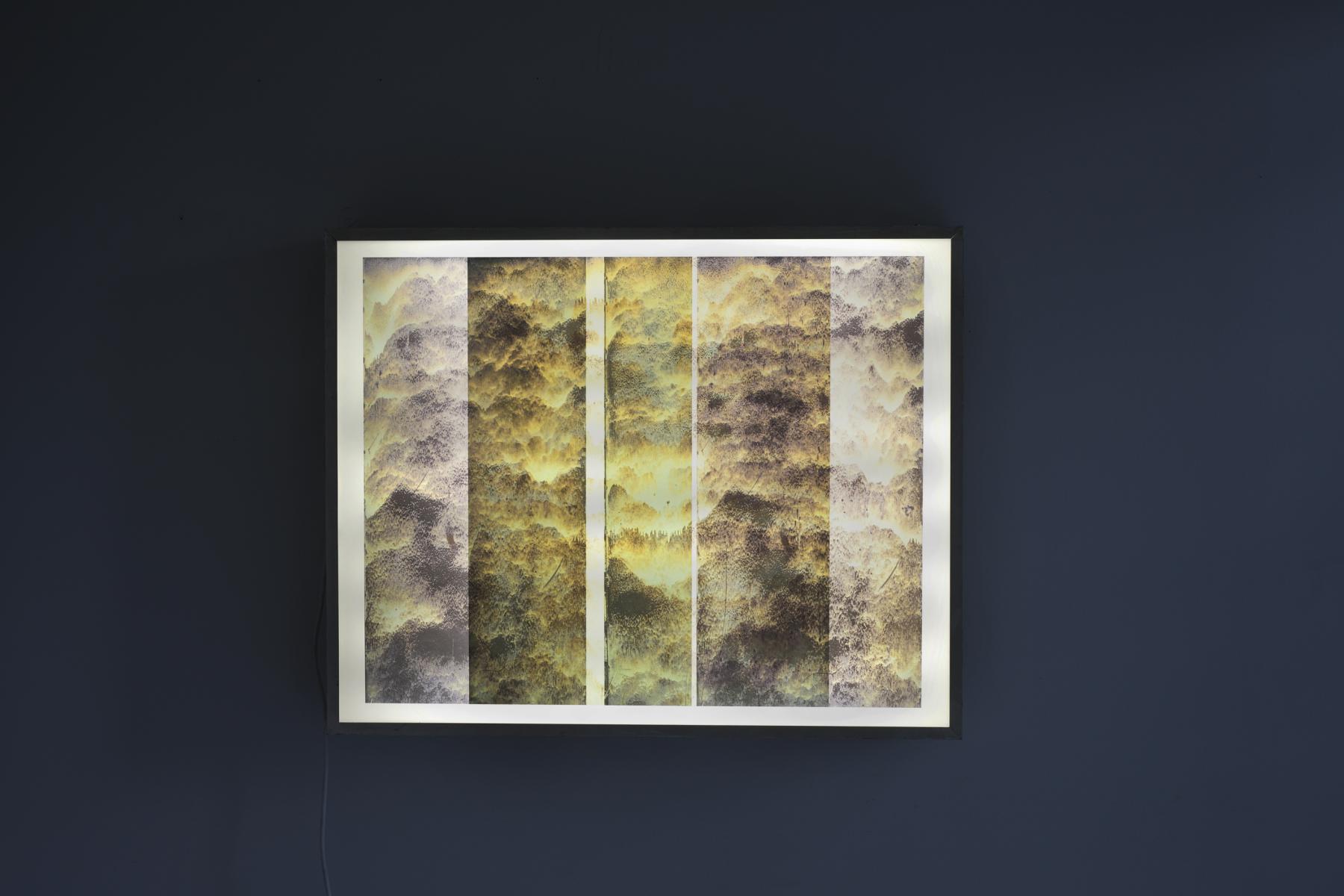 Her new project leads us to reflect on some cultural aspects prompted by the experience in Asia. The importance of emptiness, or of white, as a diverse interpretation space that alters the centrality of the sign, the gesture typical of Western art. It raises a different level of awareness which somehow questions the authority, superiority, and omnipotence of the artist. The white of the Chinese Taoist tradition that seems to oppose Eastern mysticism like that of Shitao to European hedonism is of great inspiration to Isabel Devos. Just like the work That’s how the light gets in which turns a typical subject of her production (the landscape generated by the action of water on concrete) into its negative. Or again, the work What if white was the dark side in which the search for white as a subject is obtained with the cyanotype technique. As per T’ai Chi T’u tradition, Isabel opposes the principle of Yang (white) with the one of Yin (black), well represented by the artwork on lightbox Errata. Here respecting a vertical vision of the landscape, Isabel is inspired by the rusted surfaces of the doors to represent cloudy skies. A work that once again takes up the vein of the sublimation of the landscape, typical of her early works. A detail of a surface is sufficient to recreate a view (veduta). The landscape is everywhere in Isabel Devos' work.