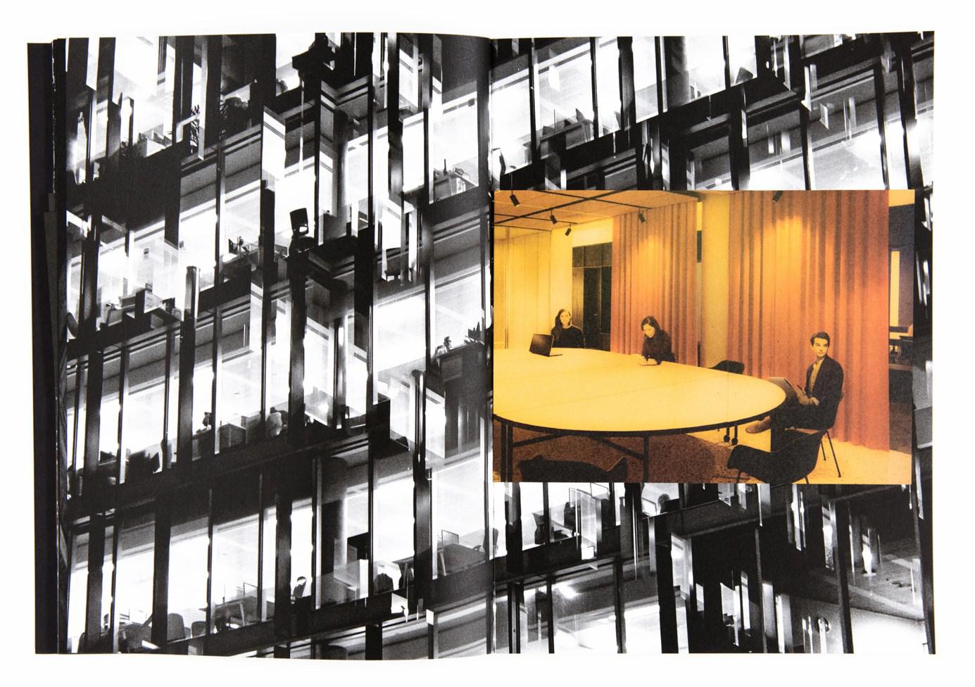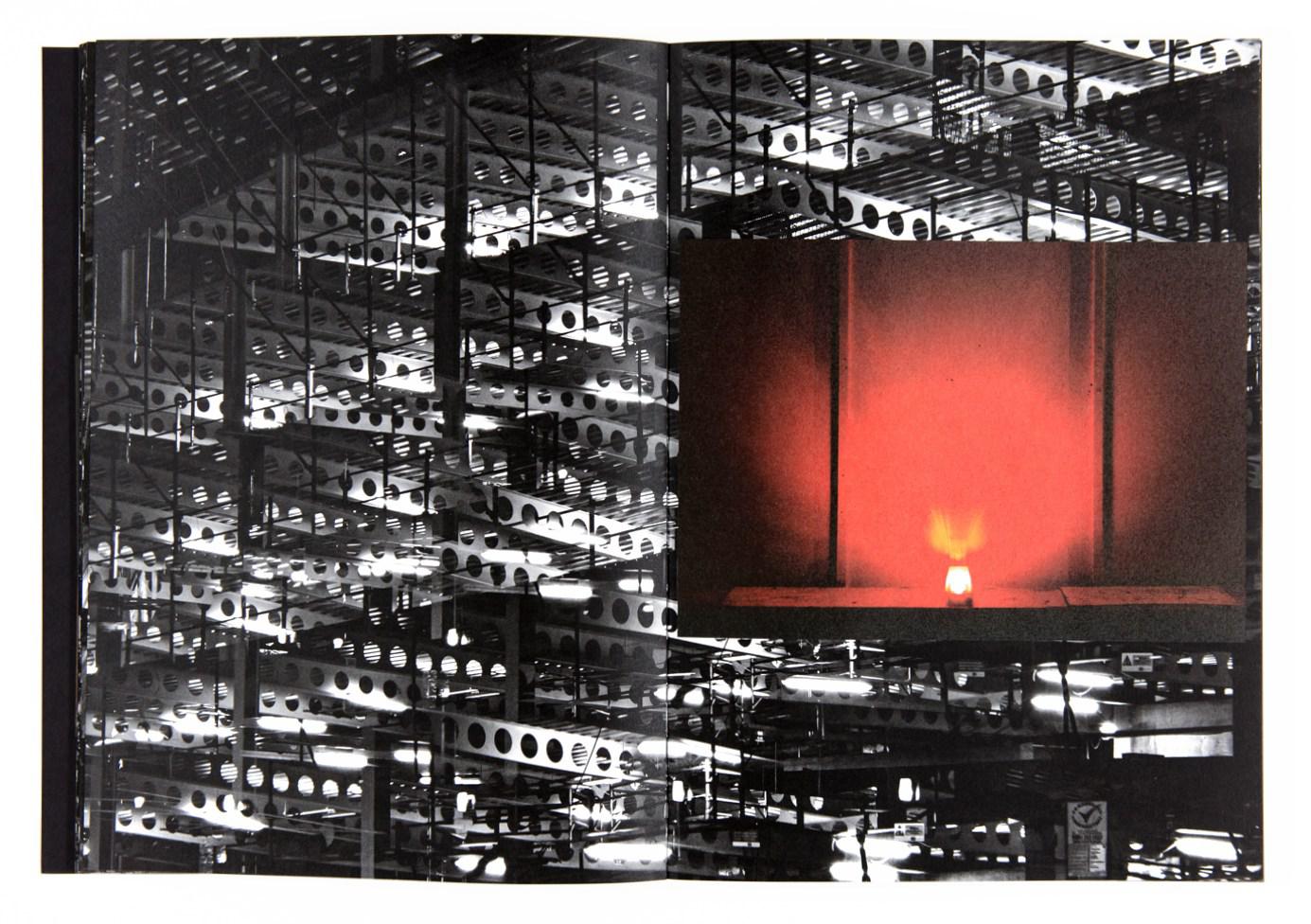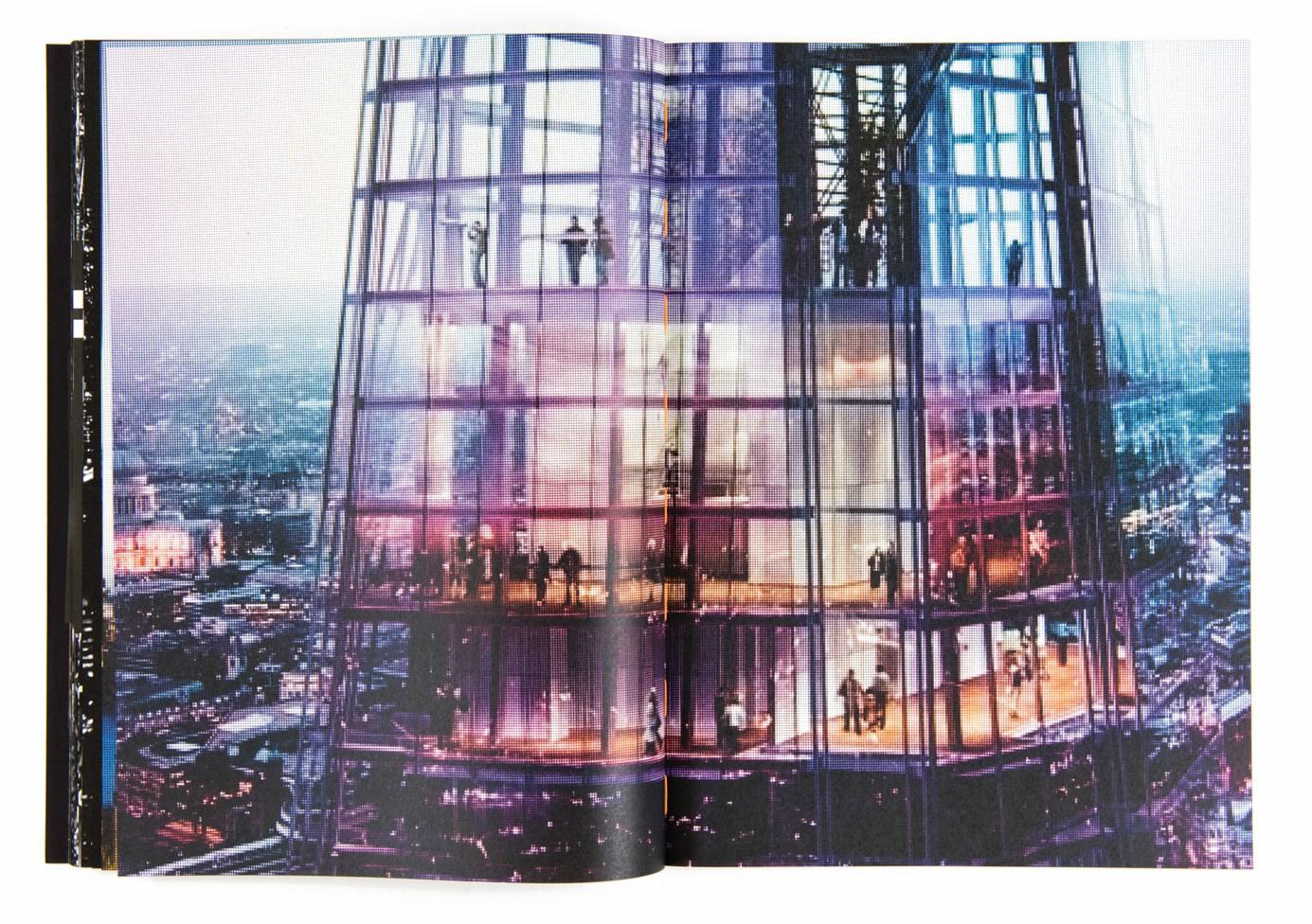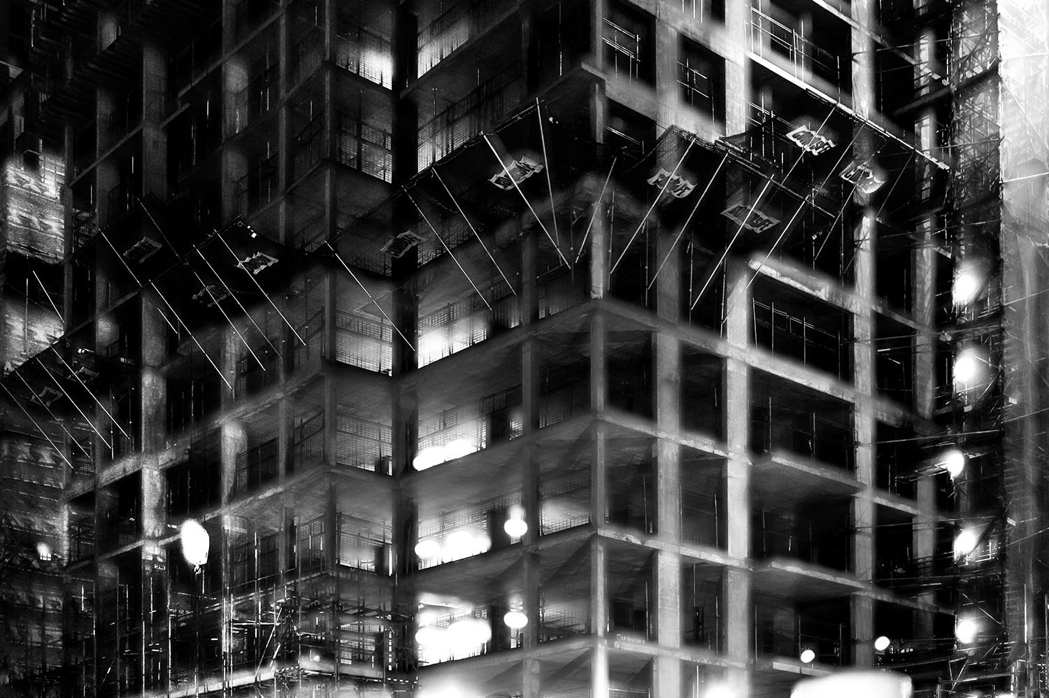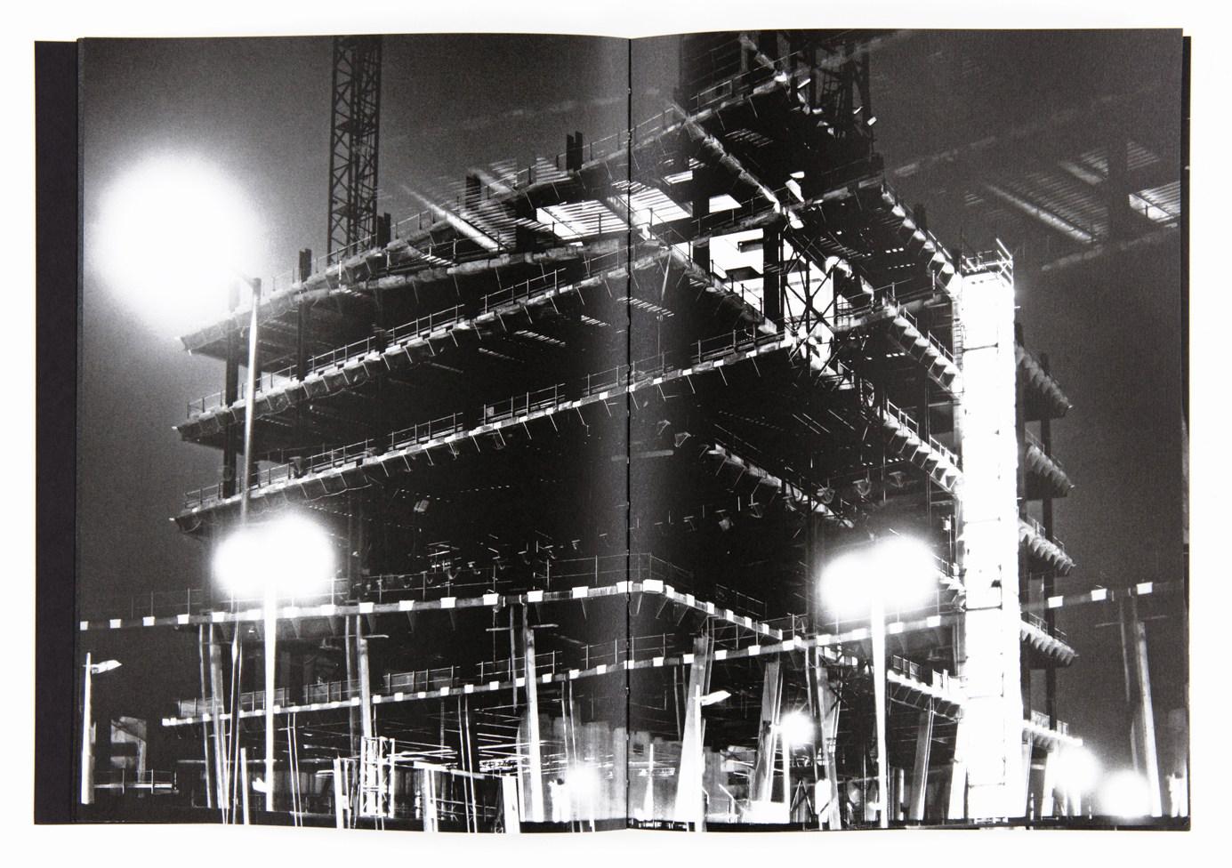 When I was a kid I had an object called Kaleidoscope. I would hold it against the light and I would turn it allowing the colourful materials inside it to create all kind of geometric patterns in sequence. The images in Metropole remind me of my Kaleidoscope. Even though the images are black and white and the sand has been replaced by steel and armé beton, the feeling of these patterns overcoming my visual field is the same. Full page, double exposed, strong contrast night views make up the first part of this new book by Lewis Bush. A grey expressionistic reality; a sombre future for London. The book is about real-estate development and all it evolves in this Metropole.